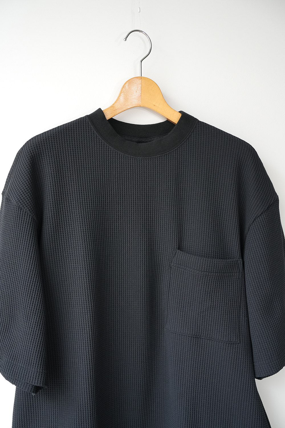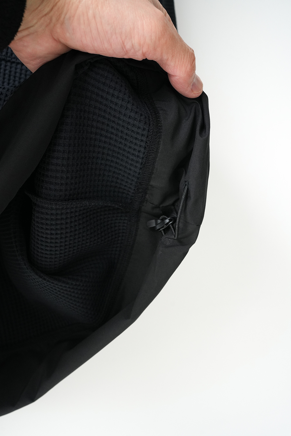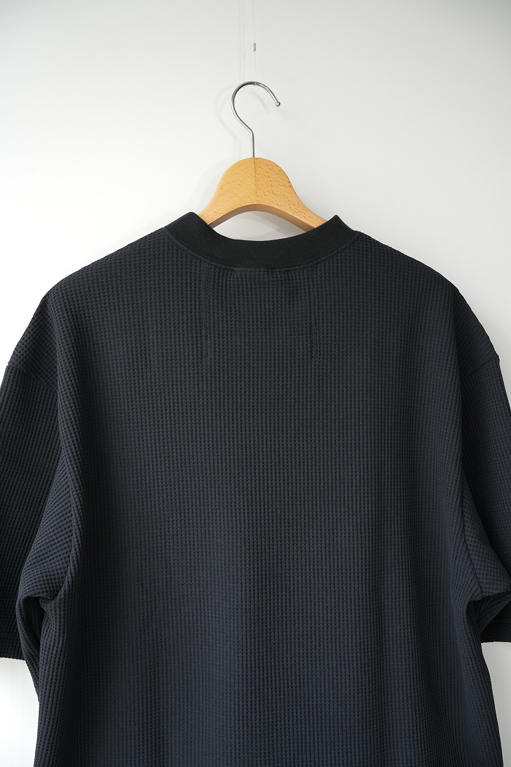 Solotexワッフルを使用したTシャツ。表側にはテイジンの開発したSolotexを使用した変形ワッフル素材を採用。コイル形状でストレッチ性、キックバック性に優れ、吸水速乾性も併せ持つ。裾には透湿撥水性の高いポリエステルタフタを使用。ノンラミネート加工により汗、水分を内部から外へ素早く放出し、ムレを抑え快適に保つ。裾にはドローコード付き。