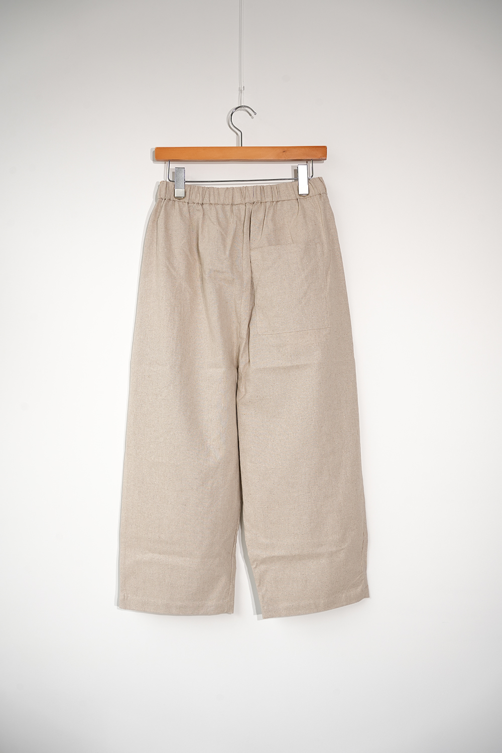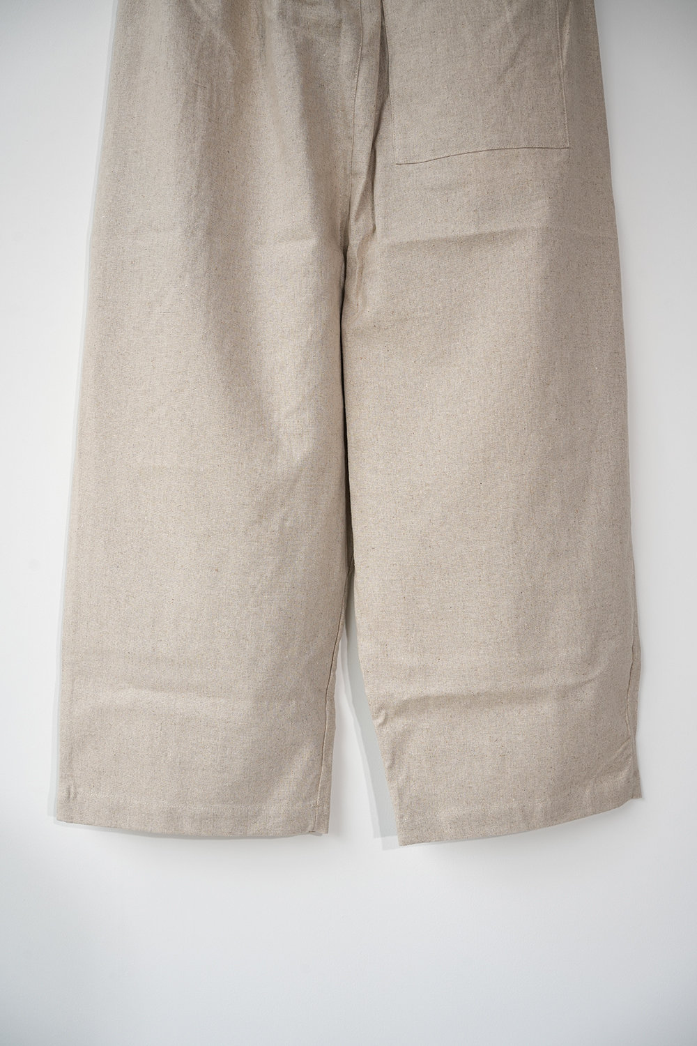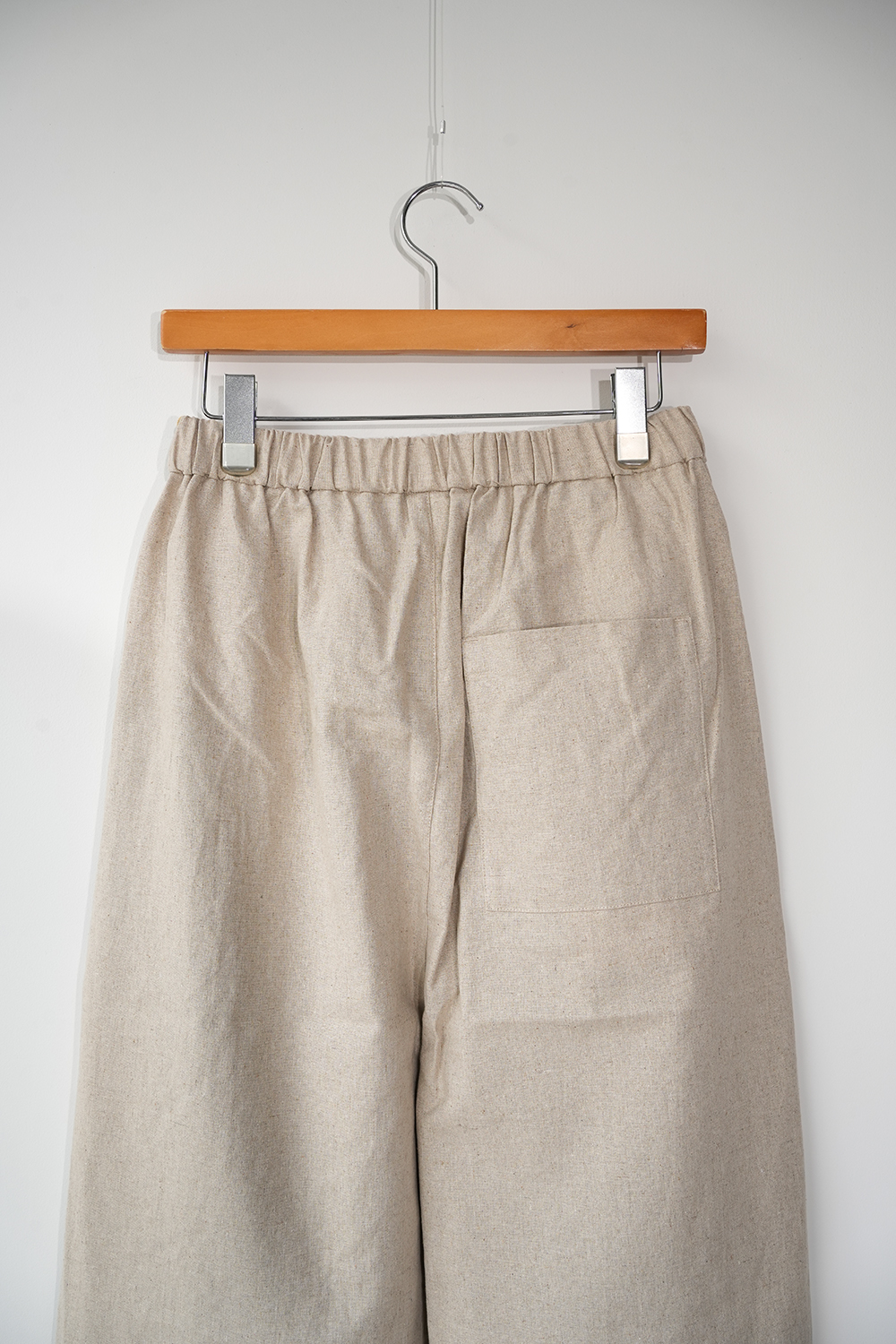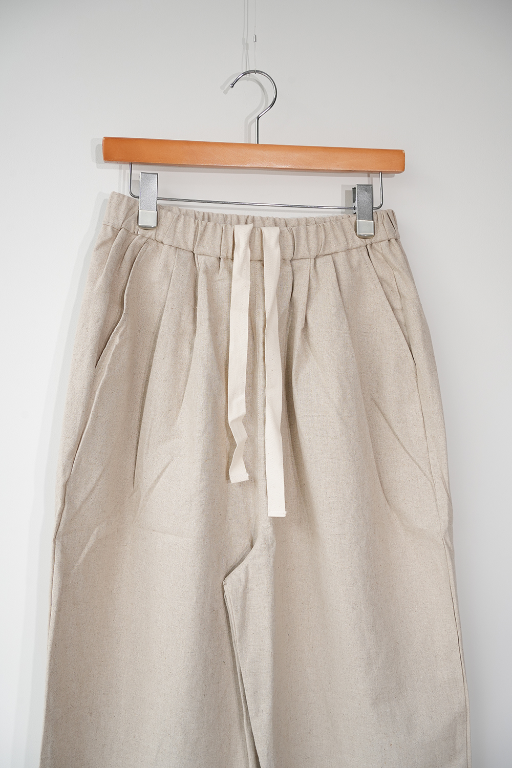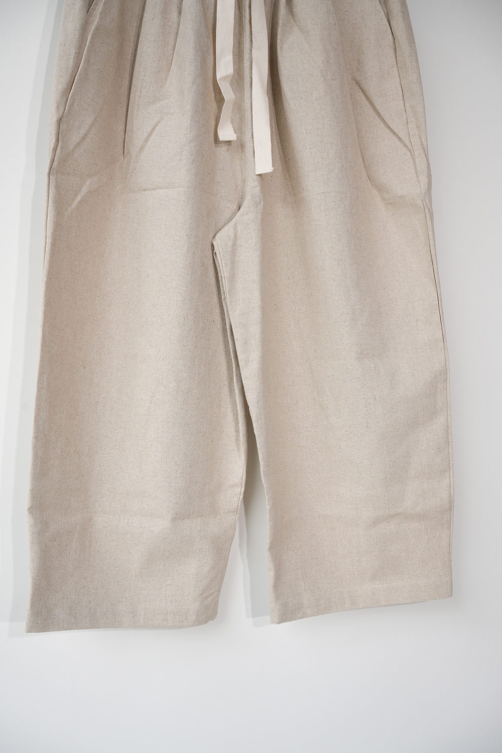 コットンリネンのキャンバス地、柔らかく膨らみがあり透けずらい素材感です。少し短めのイージーパンツ、小柄な方にもオススメです。