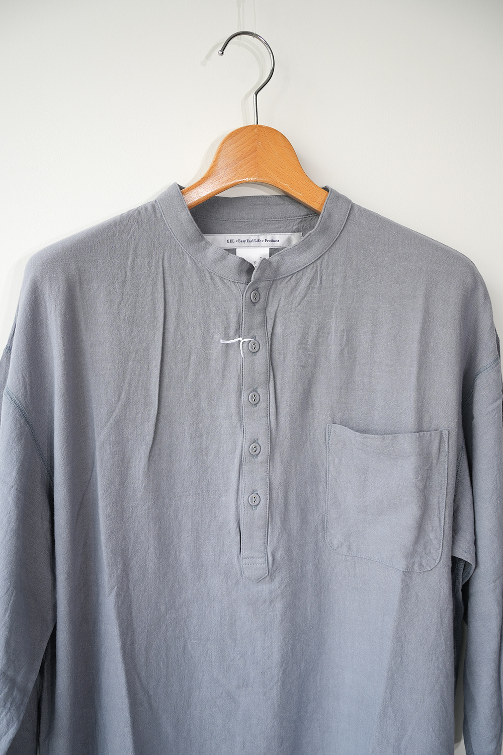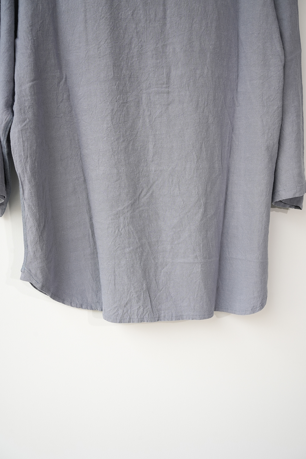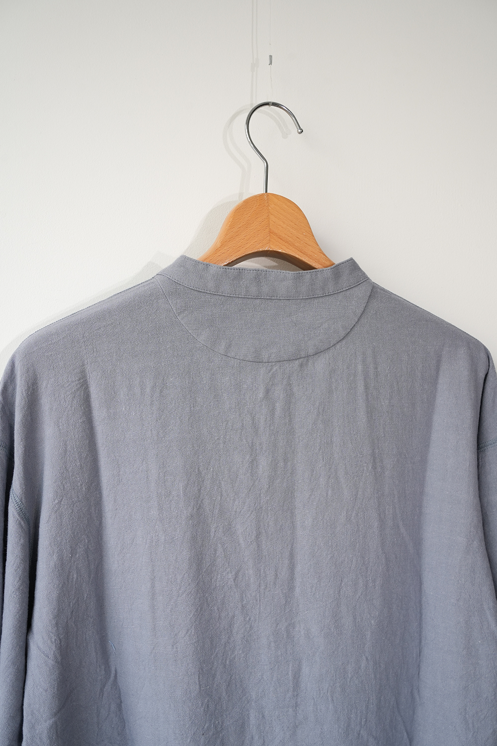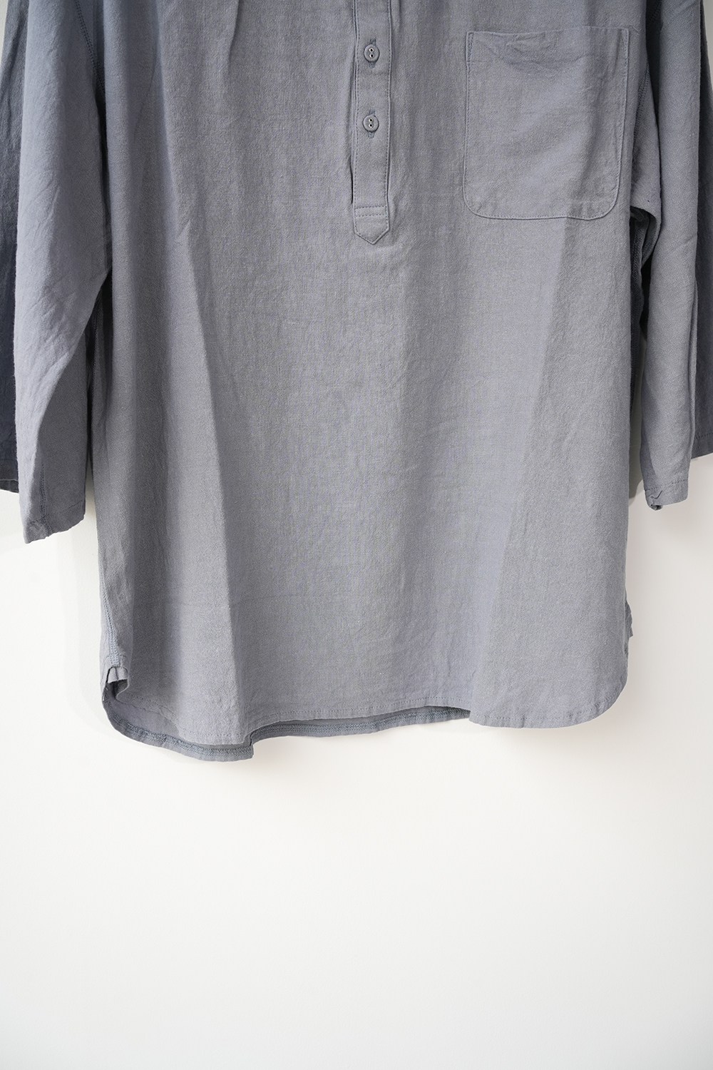 ヘンリーネックデザインのプルオーバーシャツ”チャコールヘンリー”、シャツ生地を用い、フラットシーマ縫製などカットソー縫製で仕上げたシャツとカットソーそれぞれの良さを組み合わせた一枚。ゆったりとしたゆとりのあるドロップショルダー、裾ラウンドカット、7分袖。
