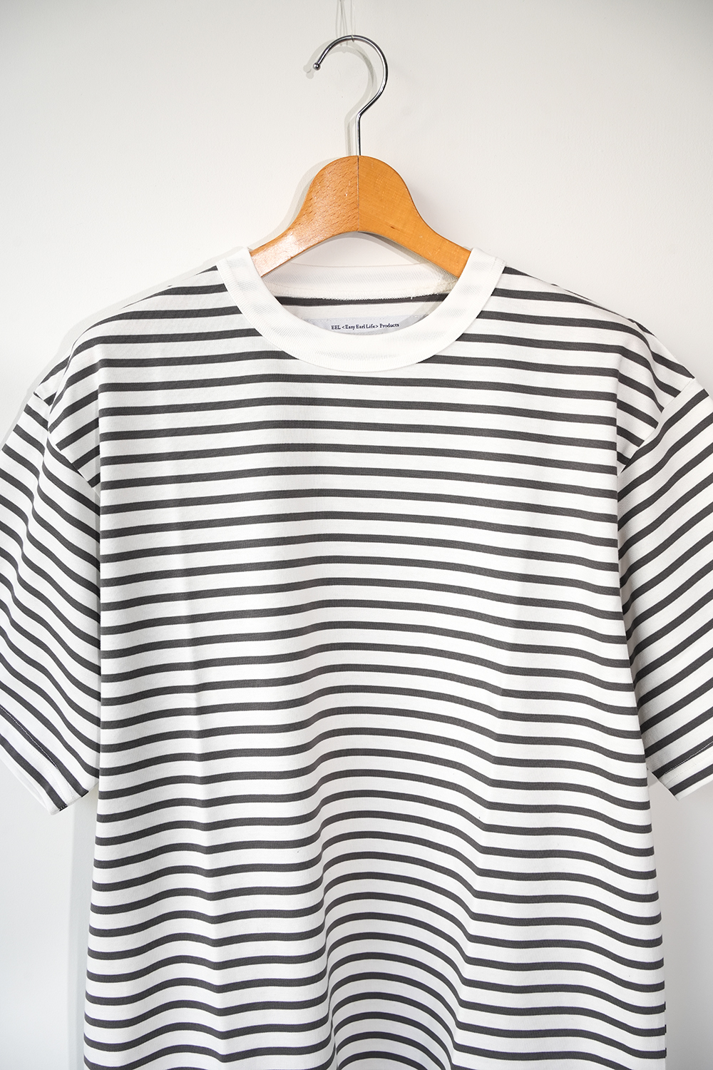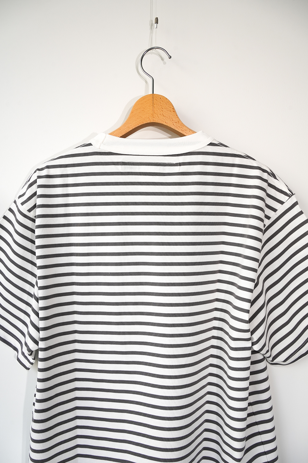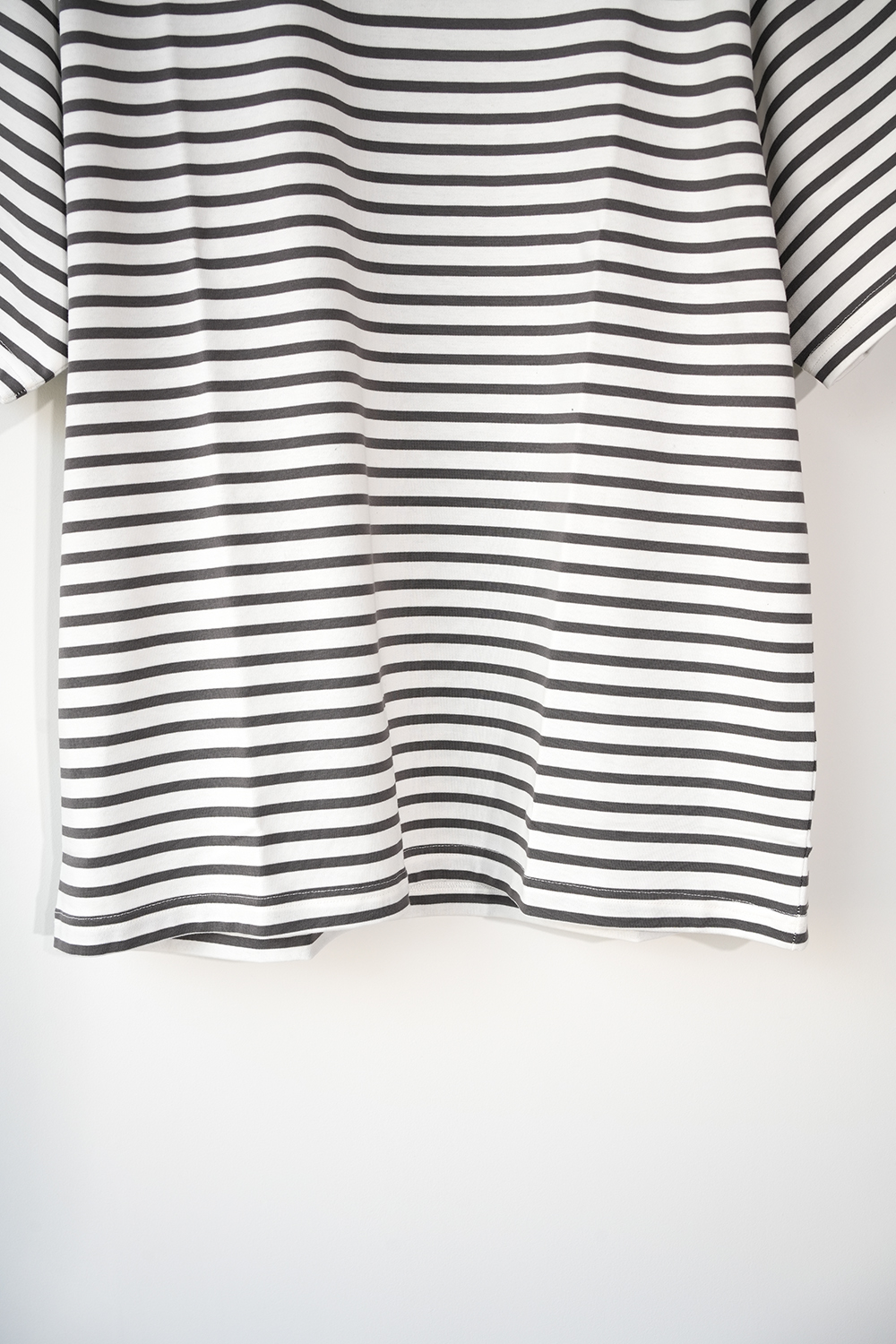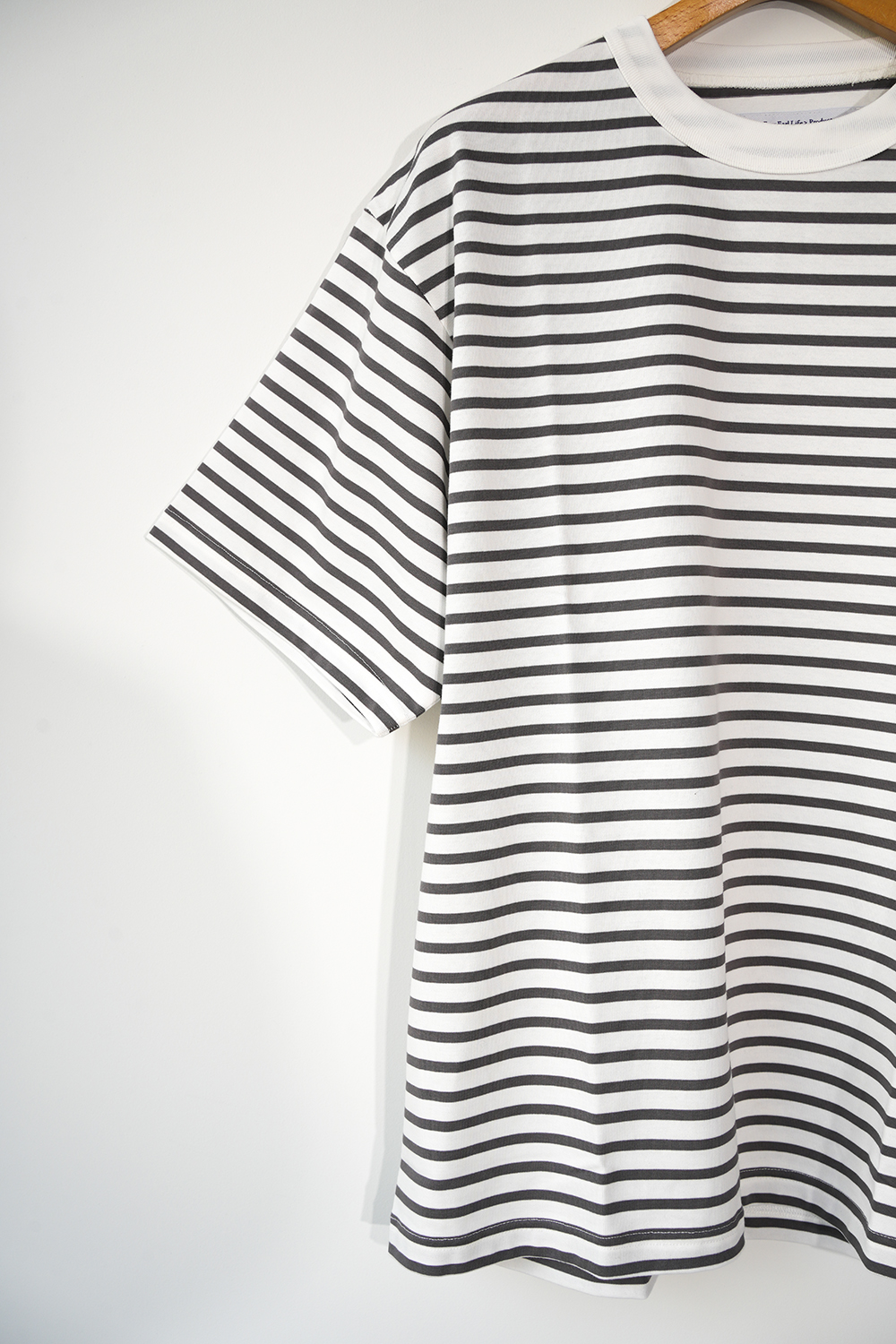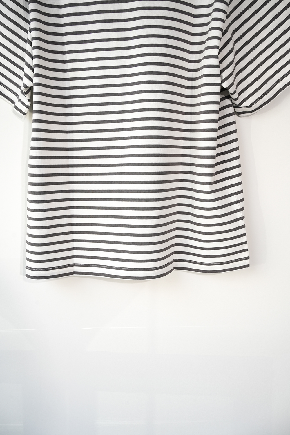 強撚糸を極限までハイゲージで編んだ天竺。透け感がなく綺麗なハイゲージニットのような光沢がある生地です。身幅・袖幅ゆったりシルエット。