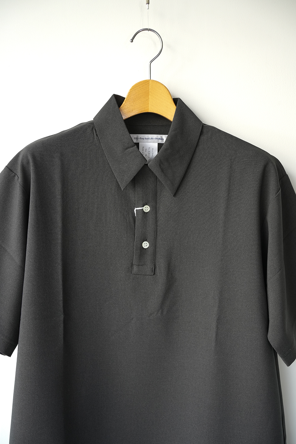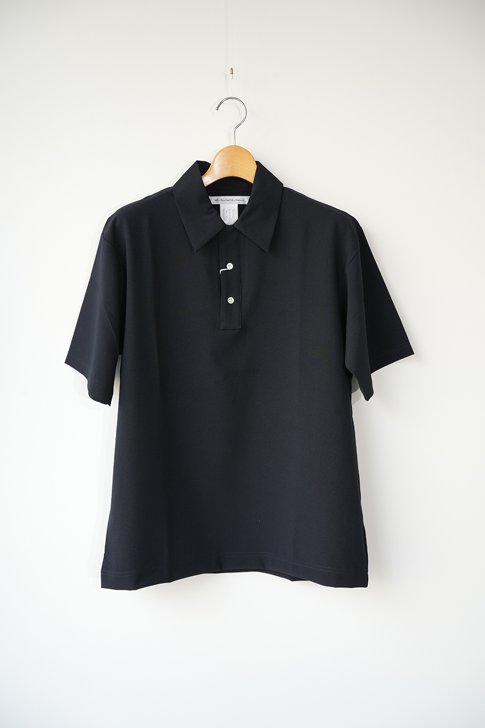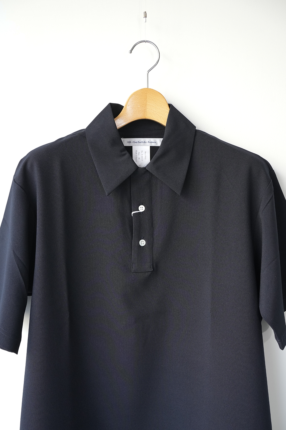 ドライタッチで速乾性に優れたEEL Prodcuts定番のポロシャツ。第一ボタンをループにした開襟デザイン、ポリエステル素材の快適さ。きめ細かな綺麗な表情と滑らかな肌触りのポリエステル生地、綺麗な襟、無駄のないシンプルなデザインはカジュアルで扱いやすいポリエステル素材でありつつも上品な印象。シルエットはオーバーサイズ過ぎないゆったりさ。ポロシャツでありながらカジュアルになりすぎない綺麗さ。