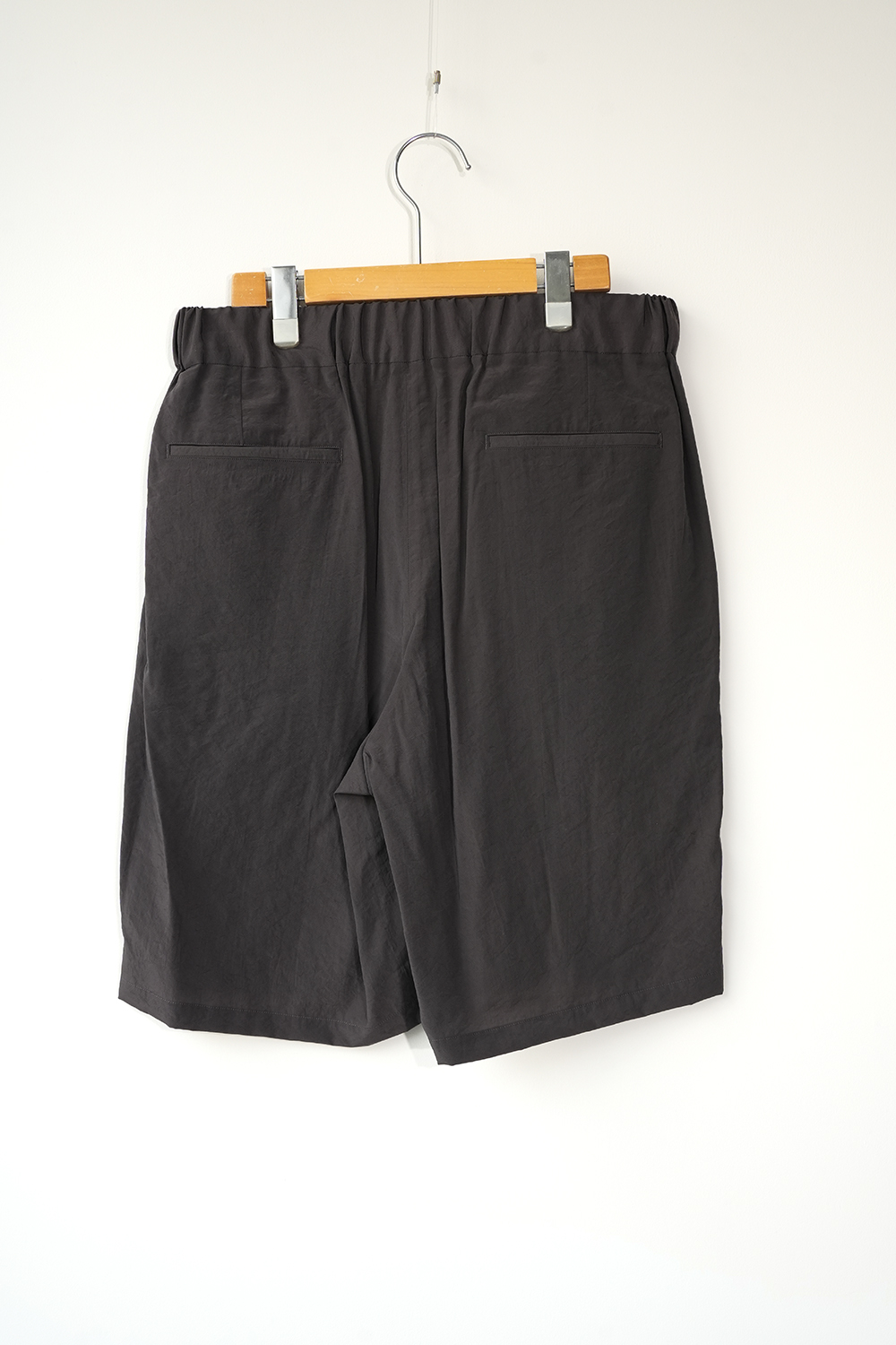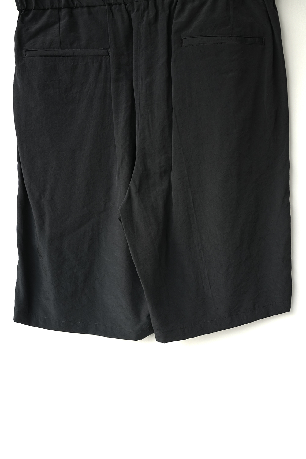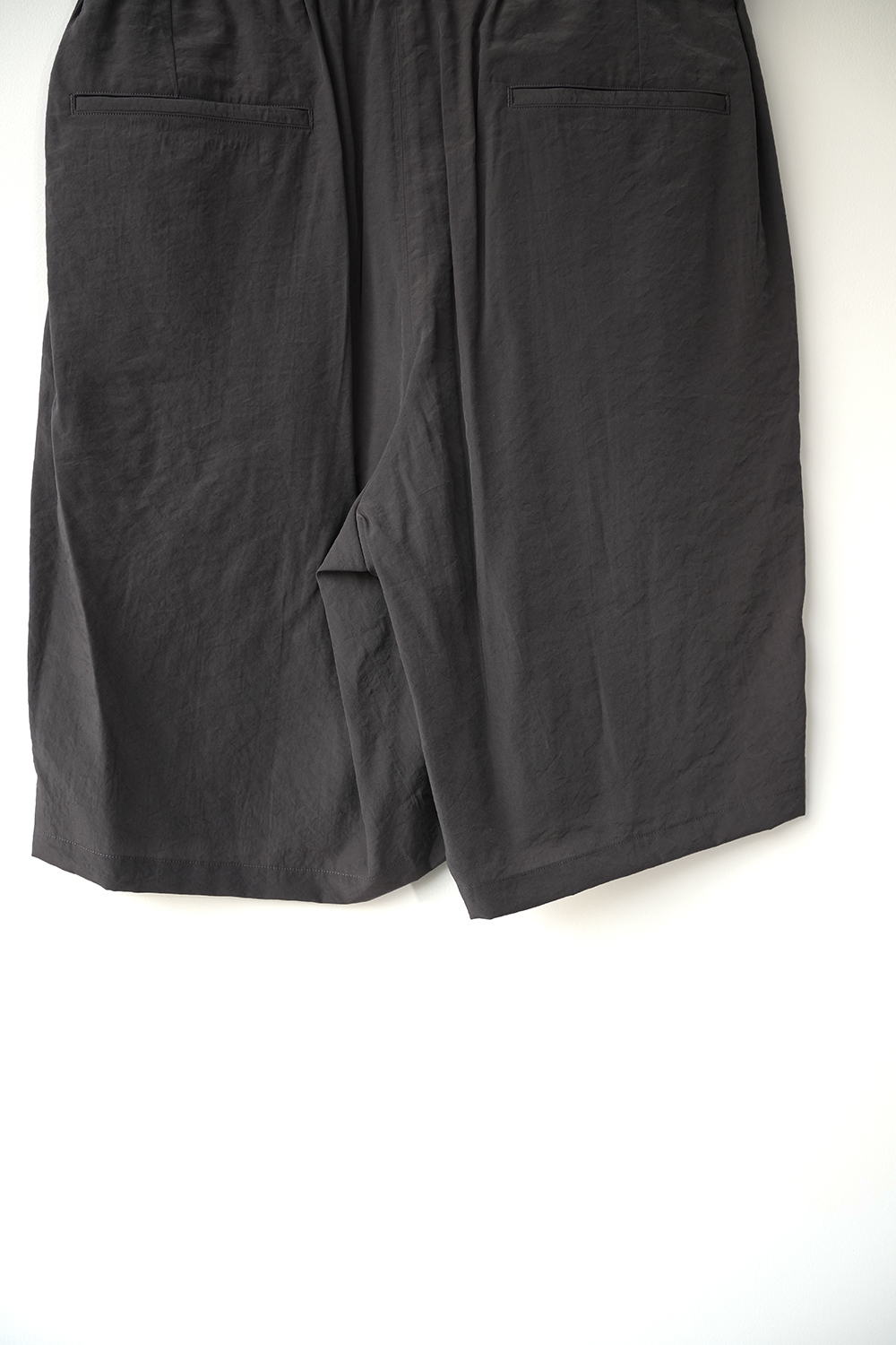 オーバーサイジングのワイドハーフパンツ。ウエストはイージー仕様の為、膝丈ほどのレングスと相まってリラックス感があります。股上はやや深めで全体的にやや A ライン気味のシルエットです。ウエストにはベルトループ風のキーループも御座います。肌との設置面も少なく夏場に重宝する1着です。北陸地方の老舗の機屋でおられた経糸キュプラ×緯糸リサイクルナイロンのタフタ素材。上品な光沢とドレープ性がありエレガントな印象ながら塩縮加工を施すことでヴィンテージの様なシュリンク感、柔らかな風合いに仕上げています。適度な照感と塩縮加工により、何処か90sのスポーツウェア感とモード感も同居します。