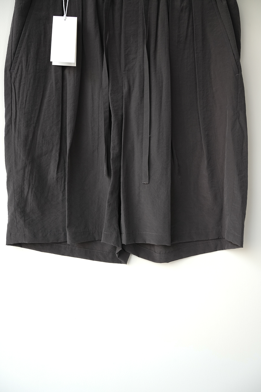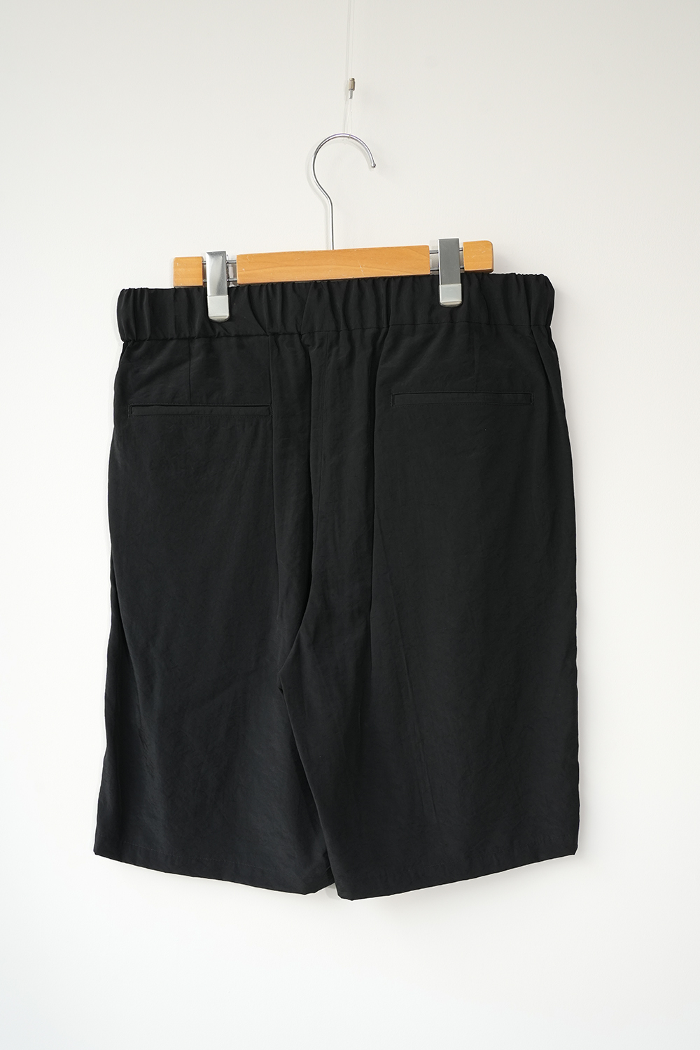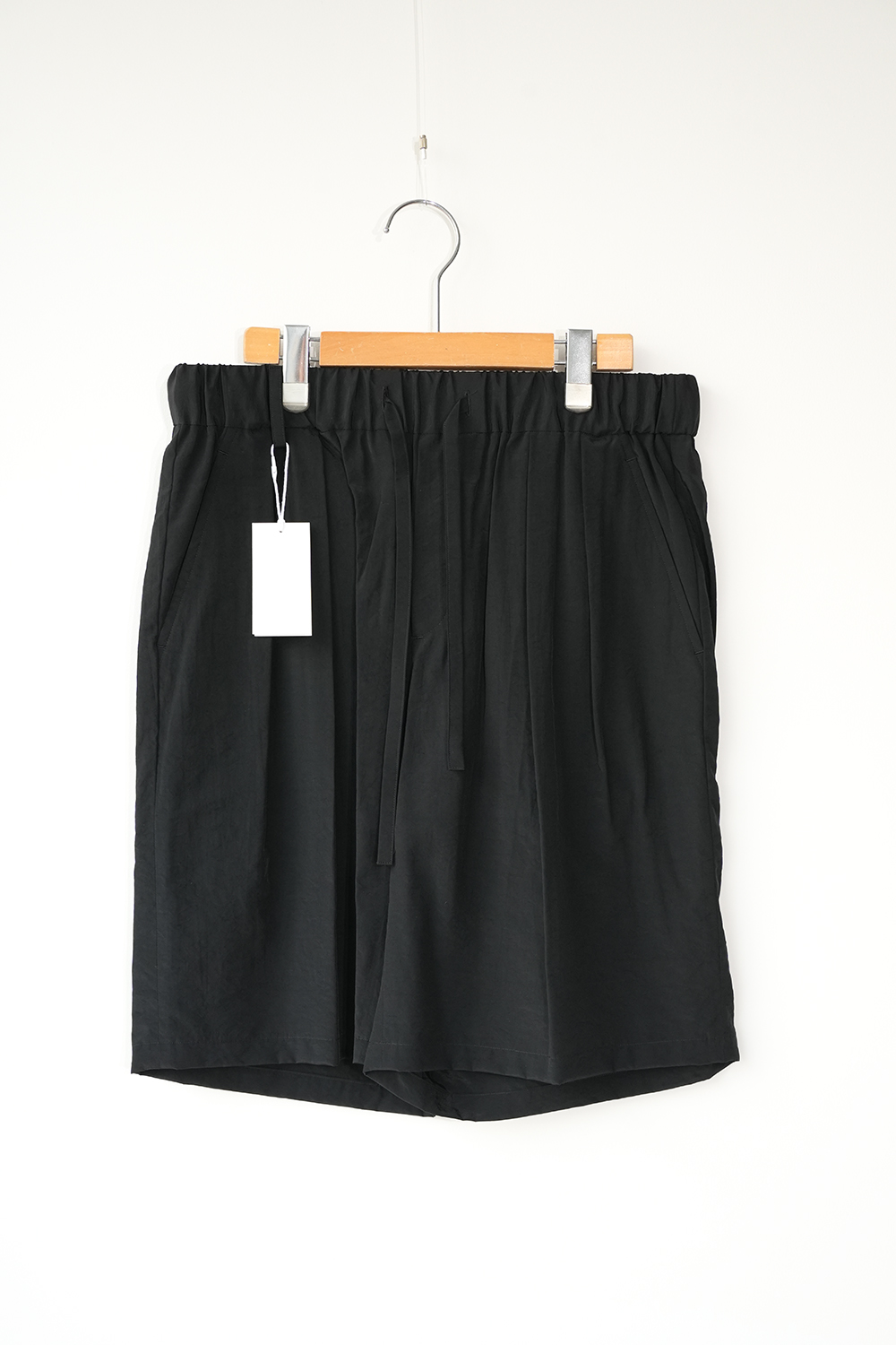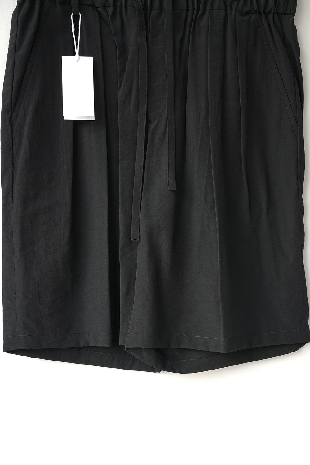 オーバーサイジングのワイドハーフパンツ。ウエストはイージー仕様の為、膝丈ほどのレングスと相まってリラックス感があります。股上はやや深めで全体的にやや A ライン気味のシルエットです。ウエストにはベルトループ風のキーループも御座います。肌との設置面も少なく夏場に重宝する1着です。北陸地方の老舗の機屋でおられた経糸キュプラ×緯糸リサイクルナイロンのタフタ素材。上品な光沢とドレープ性がありエレガントな印象ながら塩縮加工を施すことでヴィンテージの様なシュリンク感、柔らかな風合いに仕上げています。適度な照感と塩縮加工により、何処か90sのスポーツウェア感とモード感も同居します。