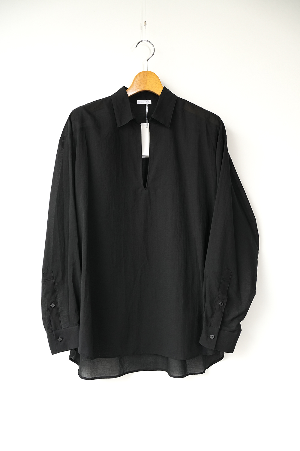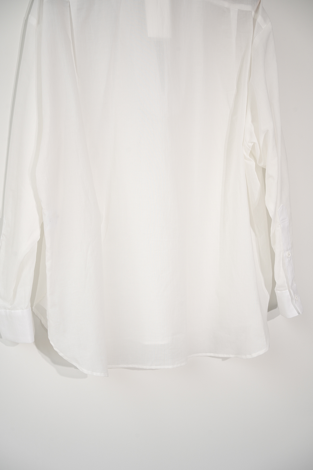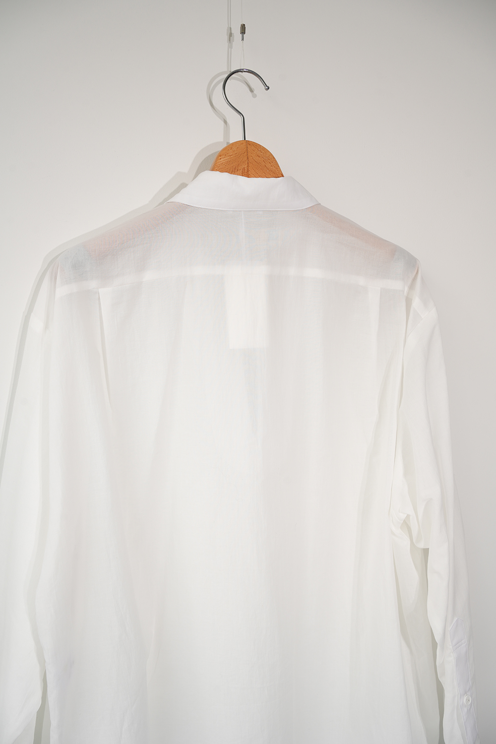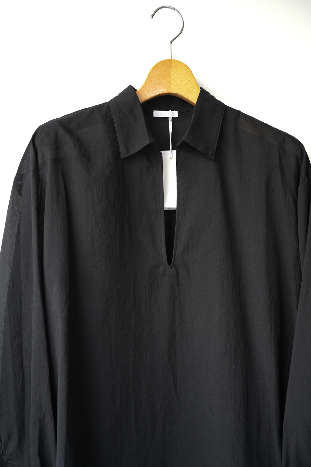 Blanc YM 定番のスキッパーシャツ。ワイドシャツ同様に後ろ身頃は通常よりもやや大きめにとり、横、後ろ姿はシャツの範疇ながらライトアウターの様な雰囲気もございます。襟元は程良い空き具合でインナー次第で見え方も変わる為スタイリングの幅があります。また切り替えも無く、ステッチも極力抑え、柔らかな生地がドレープする仕様が魅力です。静岡の遠州地方で織られた100%コットン生地を使用。糸はスーピマ超長綿。ほんの僅かに毛羽を残した柔らかな質感とスーピマコットン特有の光沢があり、光を通す様な適度な透け感があります。洗い晒しで着用しても馴染む程良いシワ感で着用できる素材です。またとても計量な素材でSSシーズンのレイヤードとしてはストレスフリーです。
