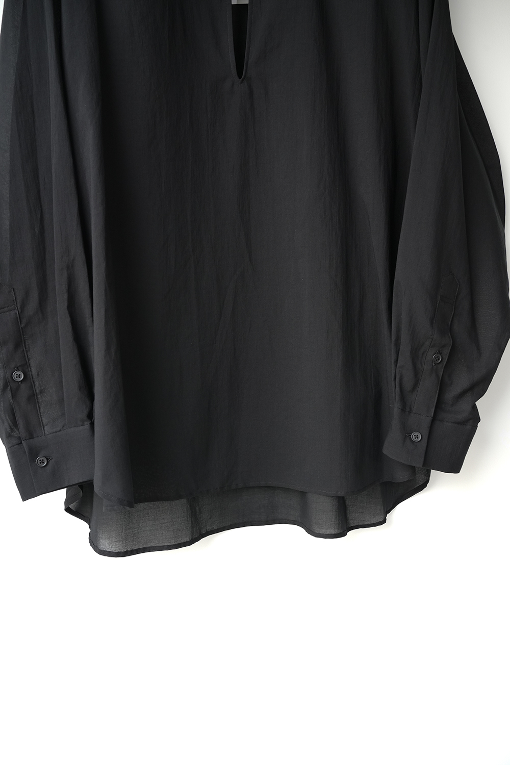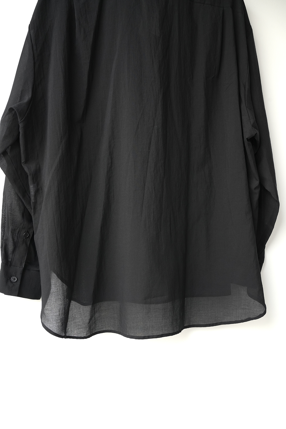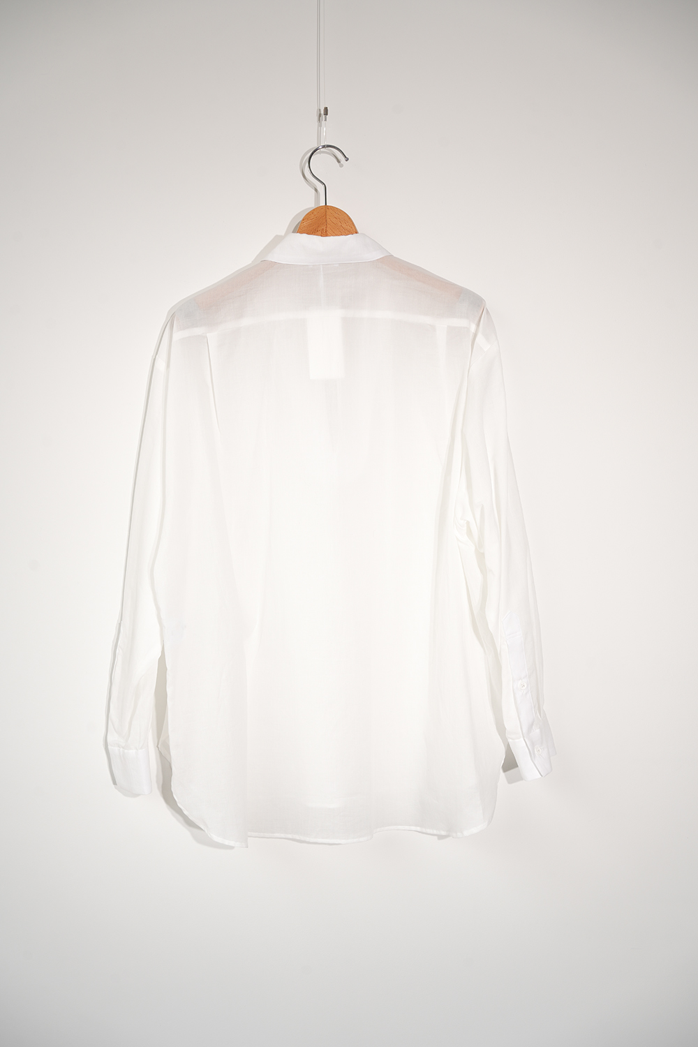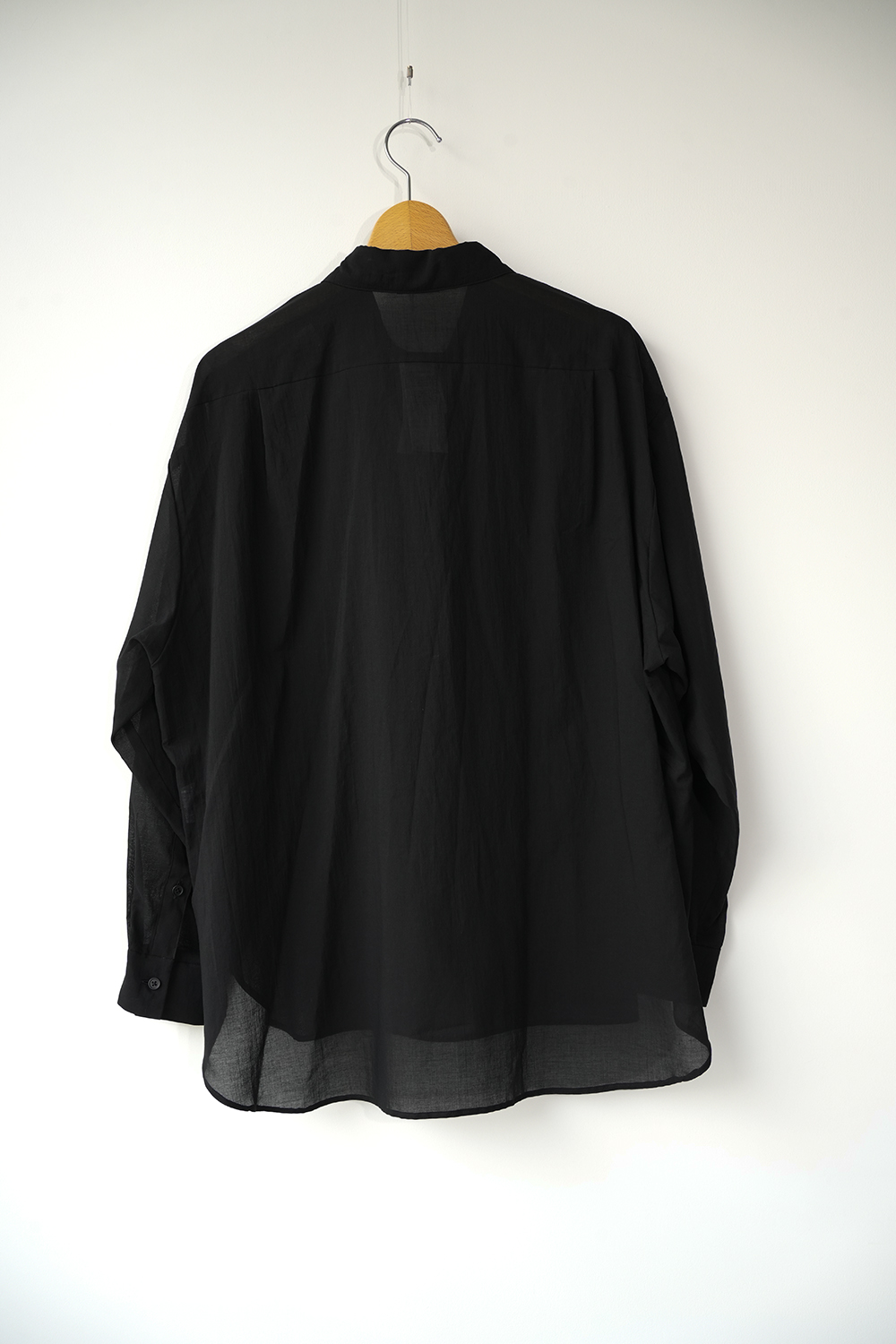 Blanc YM 定番のスキッパーシャツ。ワイドシャツ同様に後ろ身頃は通常よりもやや大きめにとり、横、後ろ姿はシャツの範疇ながらライトアウターの様な雰囲気もございます。襟元は程良い空き具合でインナー次第で見え方も変わる為スタイリングの幅があります。また切り替えも無く、ステッチも極力抑え、柔らかな生地がドレープする仕様が魅力です。静岡の遠州地方で織られた100%コットン生地を使用。糸はスーピマ超長綿。ほんの僅かに毛羽を残した柔らかな質感とスーピマコットン特有の光沢があり、光を通す様な適度な透け感があります。洗い晒しで着用しても馴染む程良いシワ感で着用できる素材です。またとても計量な素材でSSシーズンのレイヤードとしてはストレスフリーです。