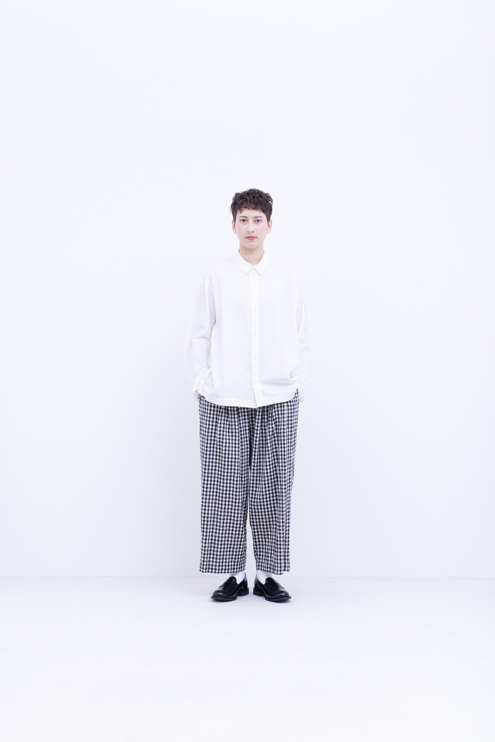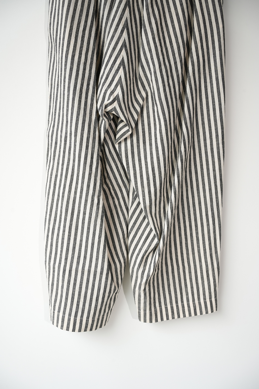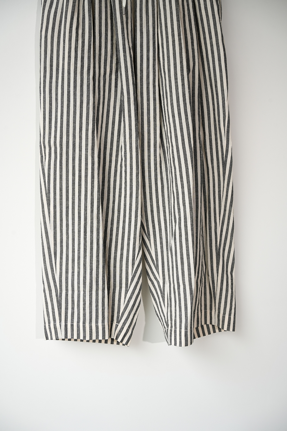 コットン糸と綿麻混紡糸で仕立てた風合いある平織シーチング生地、3タックを配したゆったりテーパードシルエット。フルレングス、ウェスト紐とゴム仕様。