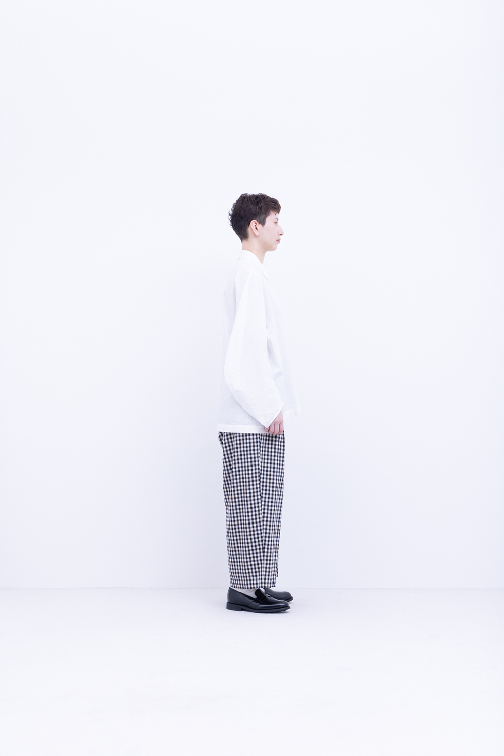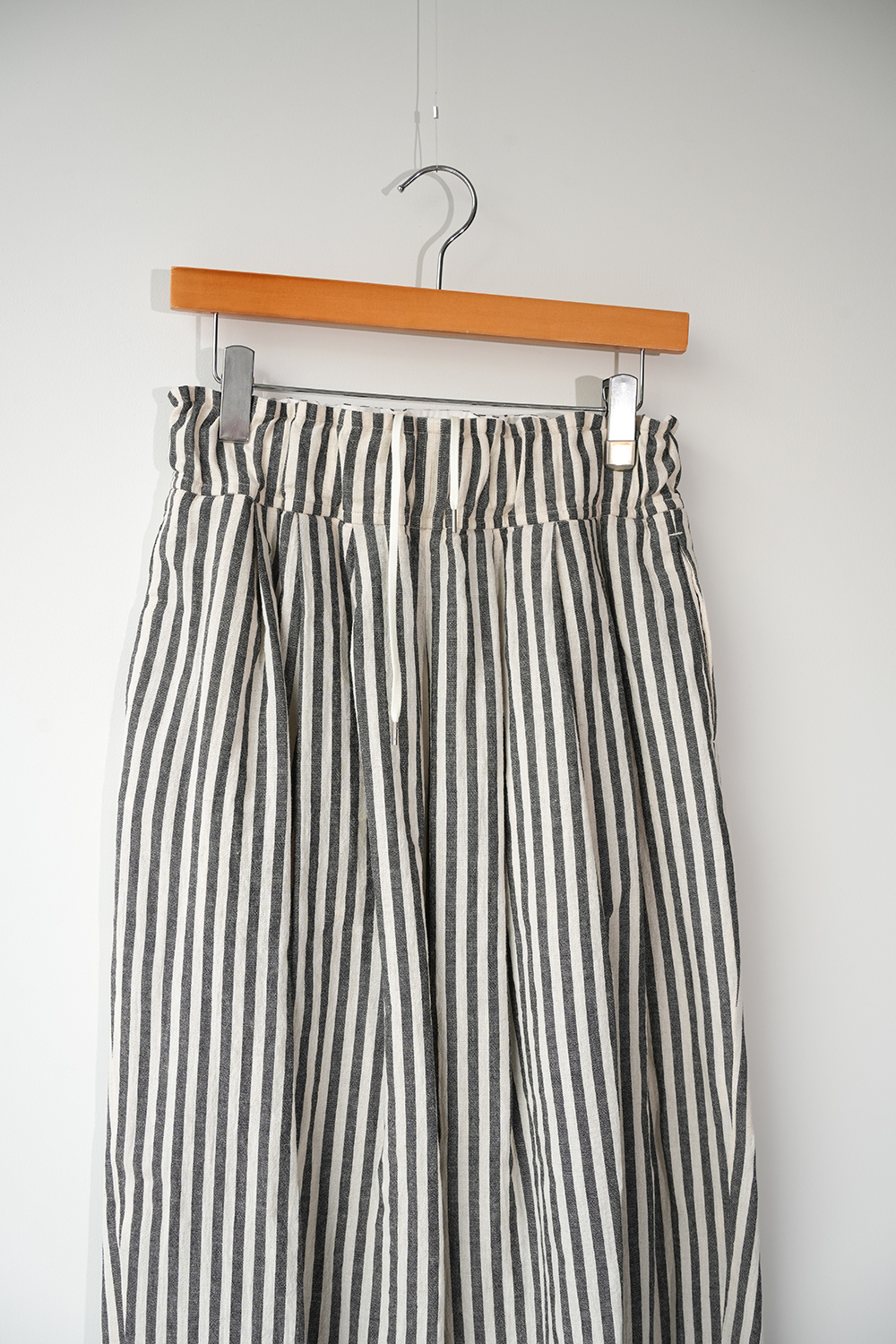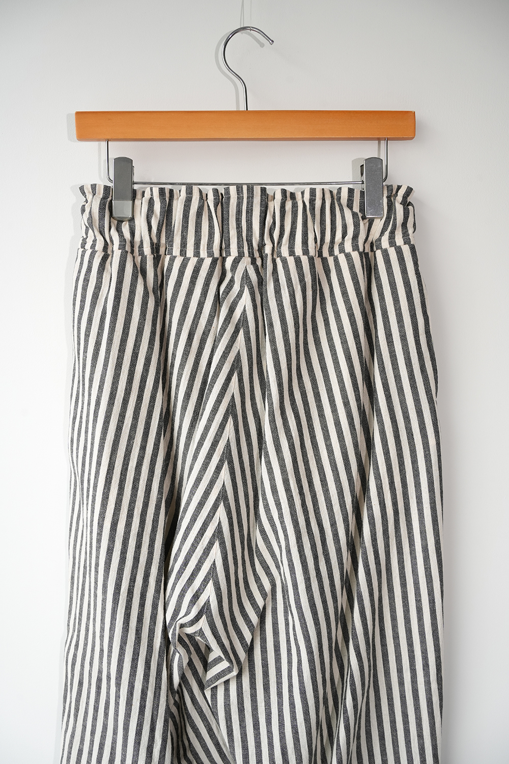 コットン糸と綿麻混紡糸で仕立てた風合いある平織シーチング生地、3タックを配したゆったりテーパードシルエット。フルレングス、ウェスト紐とゴム仕様。