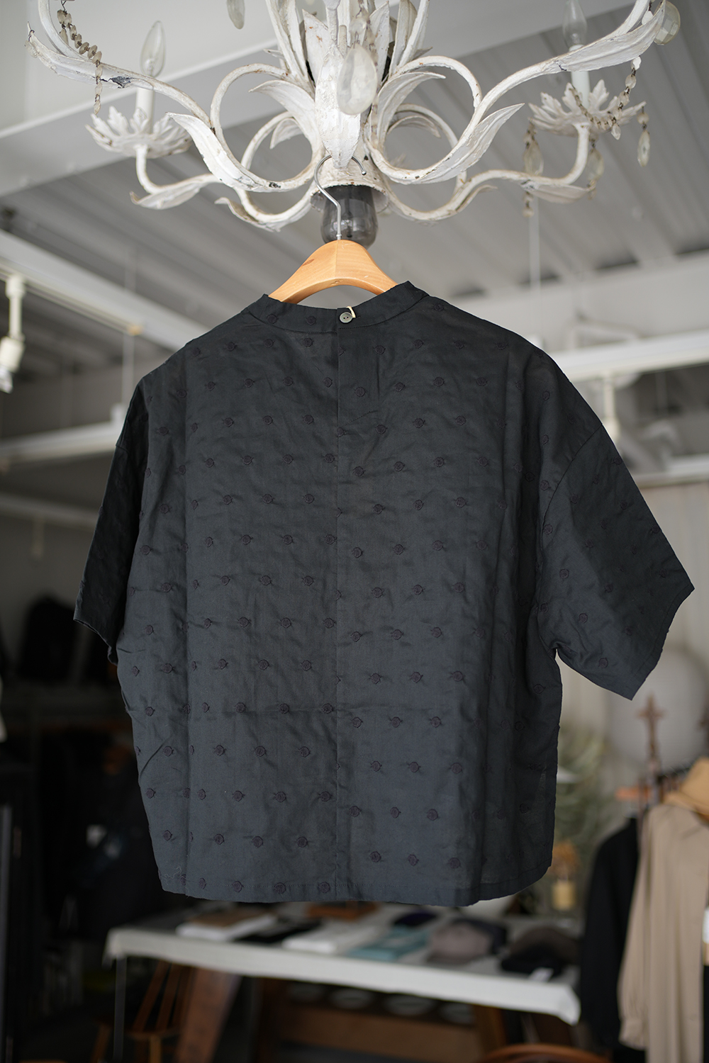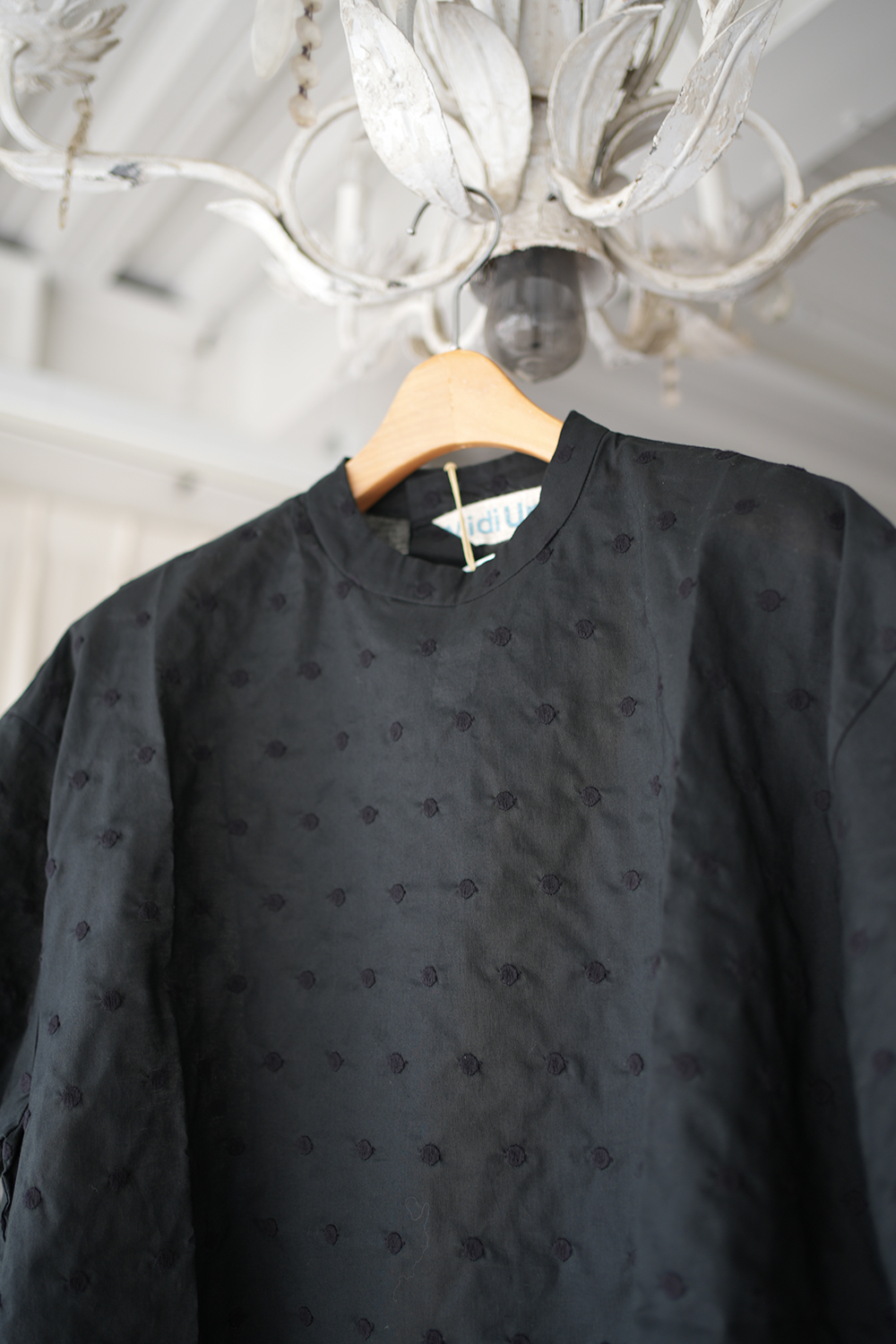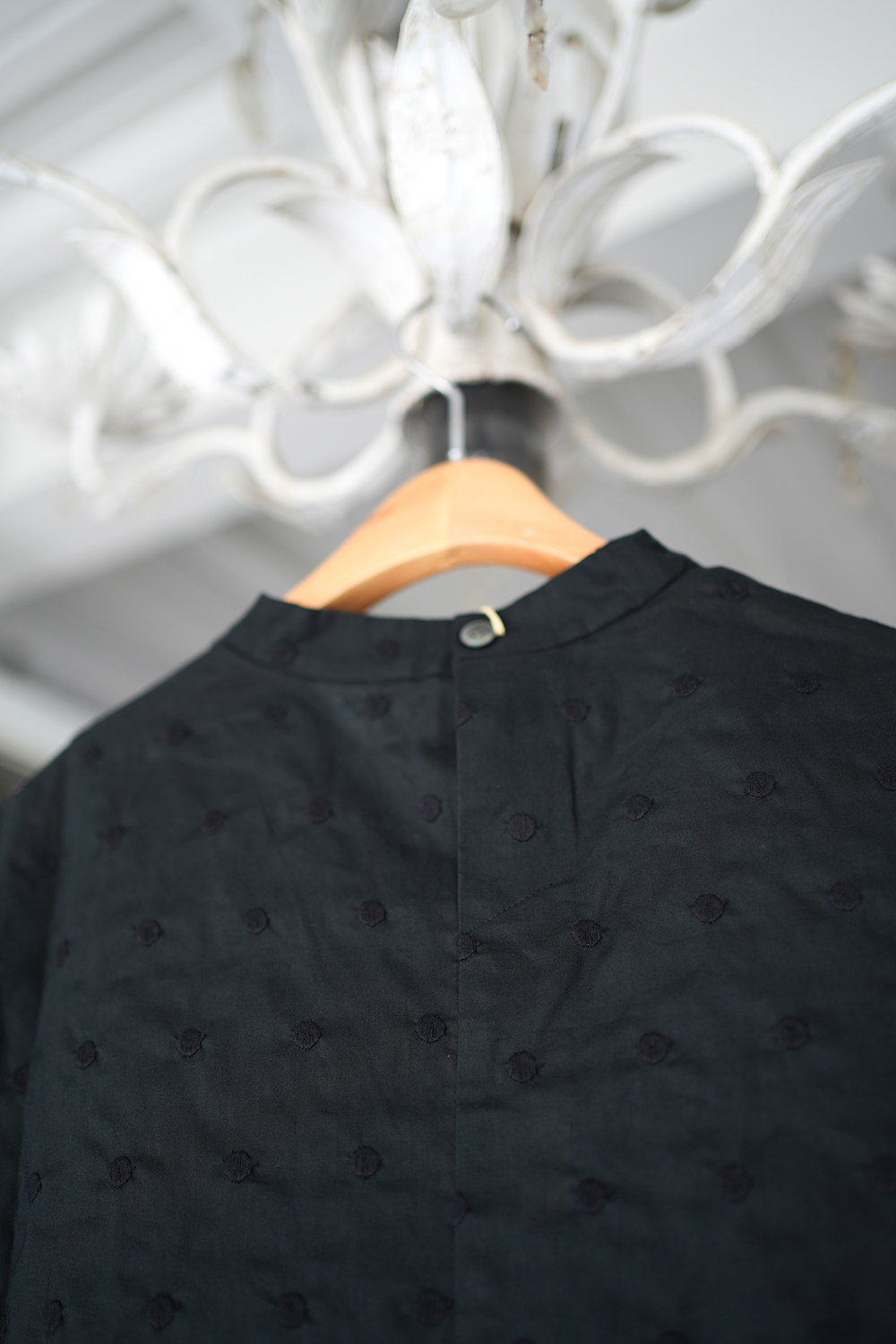 60ローン×ドット刺繍の素材を使用、刺繍は北陸地方で施しております。後ろ開きのプルオーバー、着丈短め。
