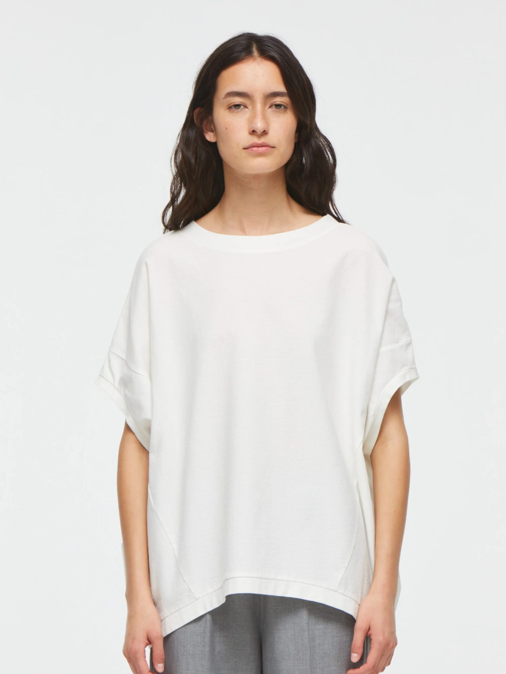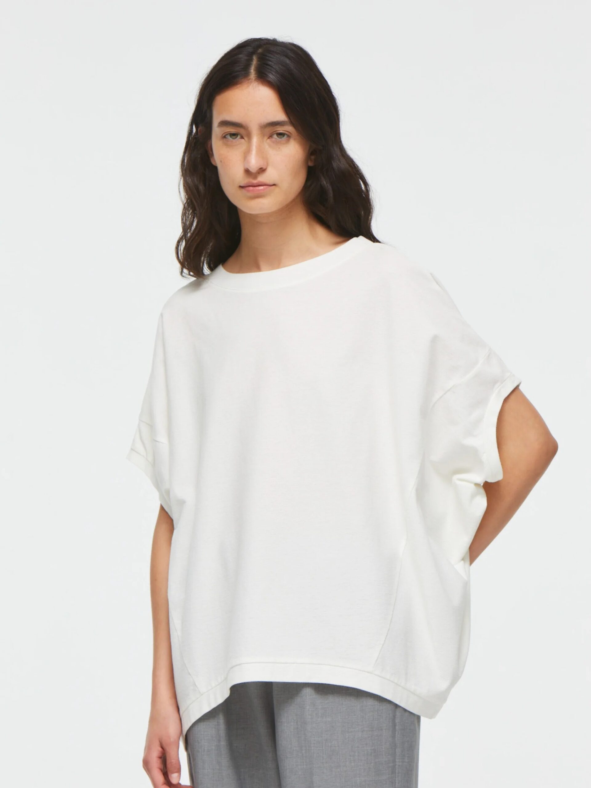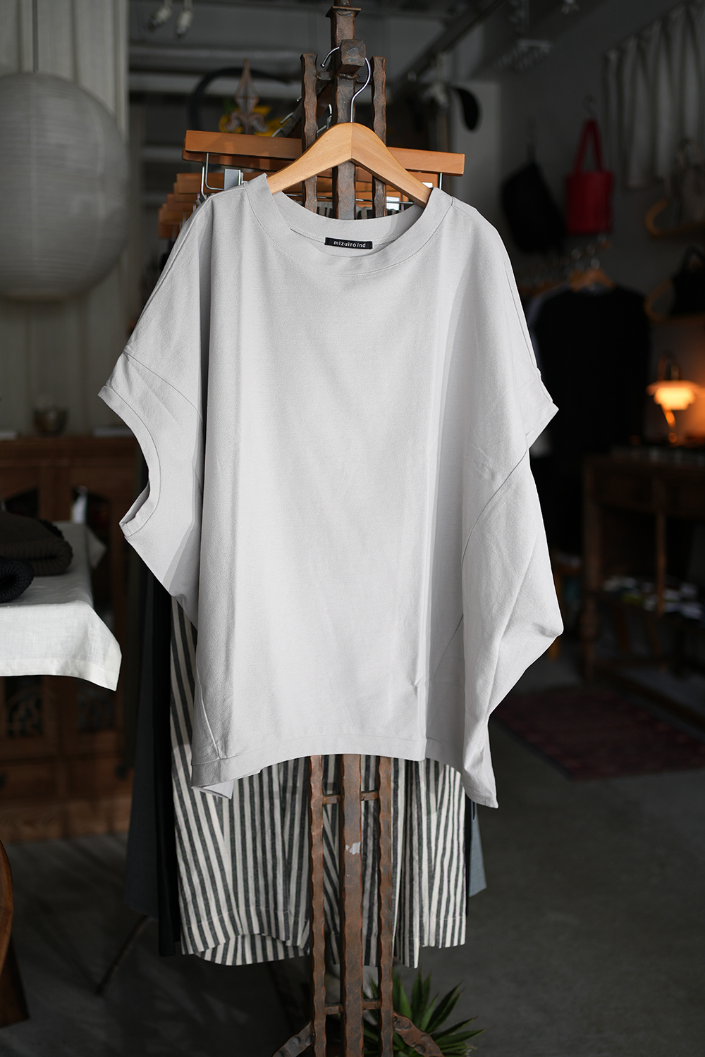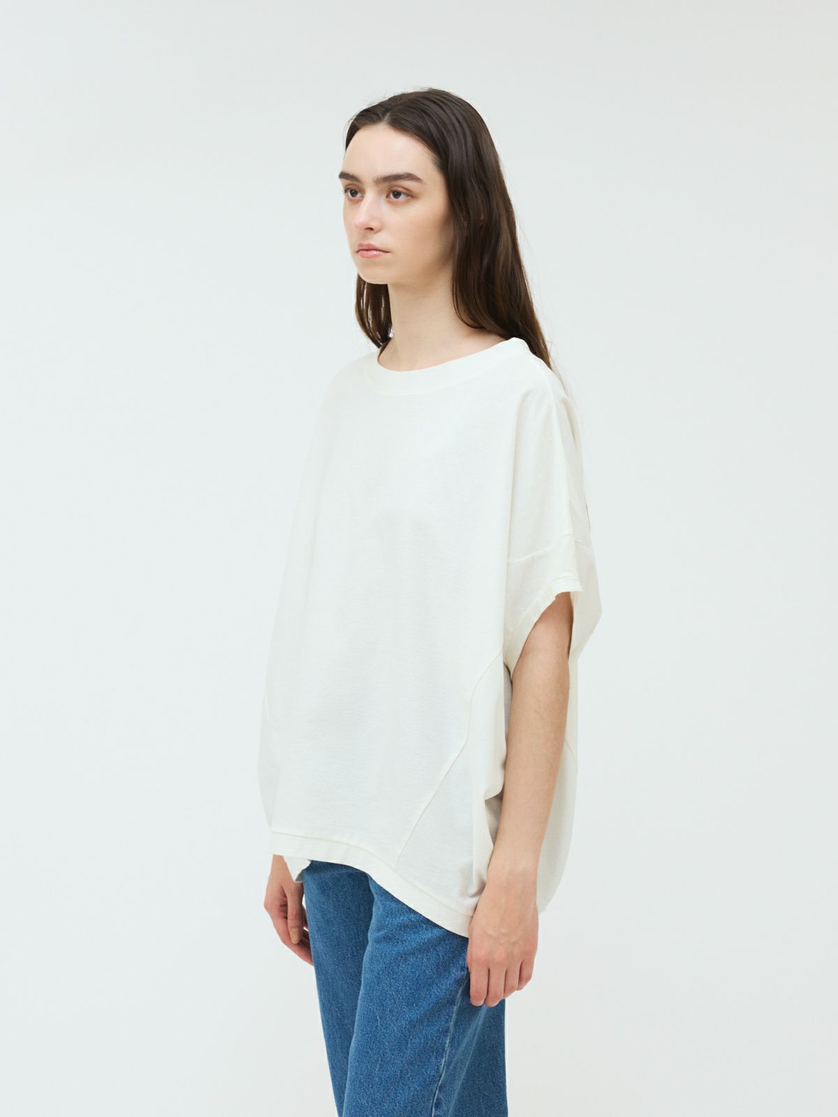 mizuiro indの定番人気、コクーンシルエットのワイドプルオーバー。丸みを帯びたシルエットがやさしい印象を与え、ゆったりとした5分袖は、ベストのようにも着こなせるデザイン。季節を問わず、ロングシーズンで活躍します。生地には、細かな凹凸のある梨地織りのアムンゼンを採用。陰影が美しく浮かび上がり、ほどよいハリ感とドレープが調和した上品な素材感に仕上がっています。シワになりにくく、お手入れがしやすい点も嬉しいポイント。肌離れがよく、暑い時季にもさらりと快適。淡色はやや透け感がございます。