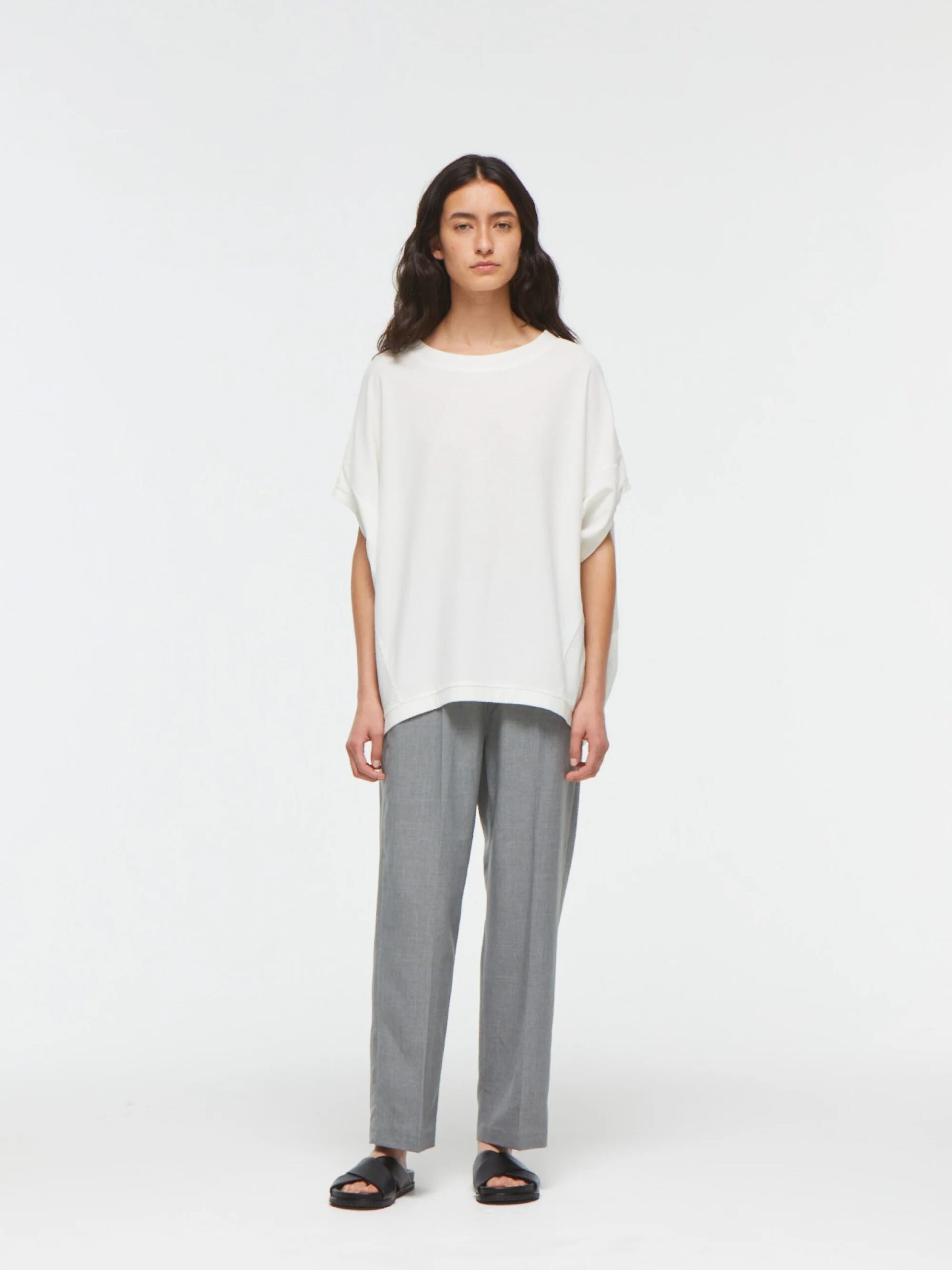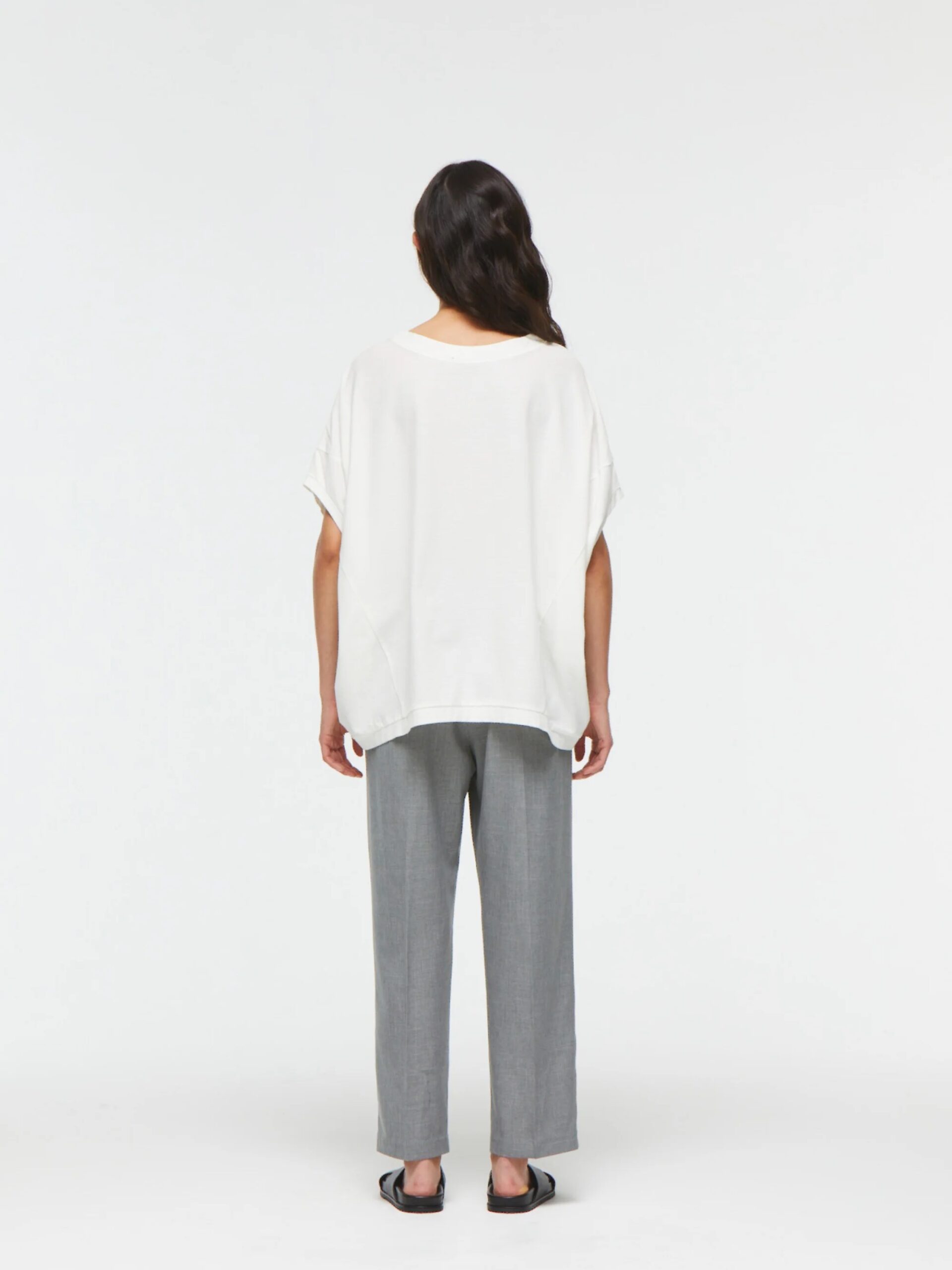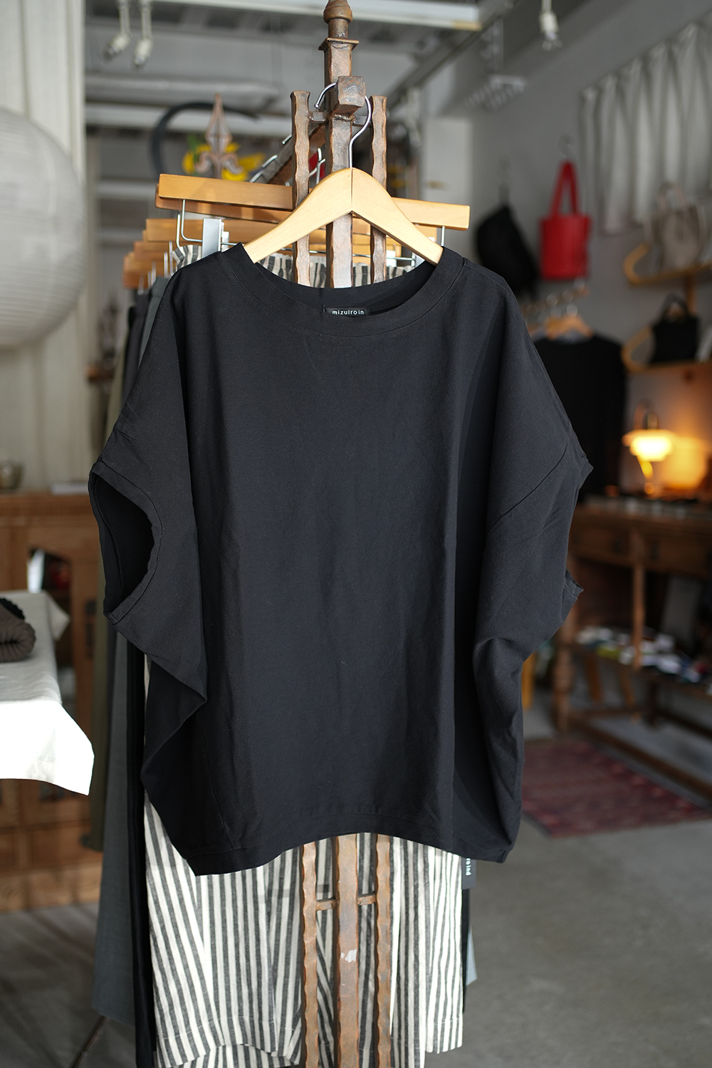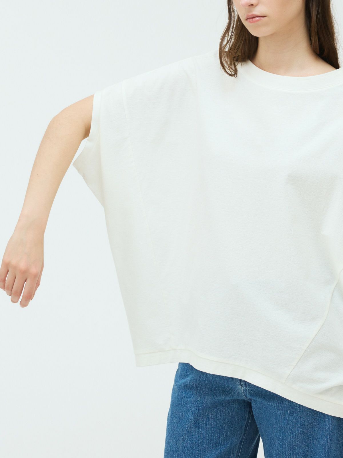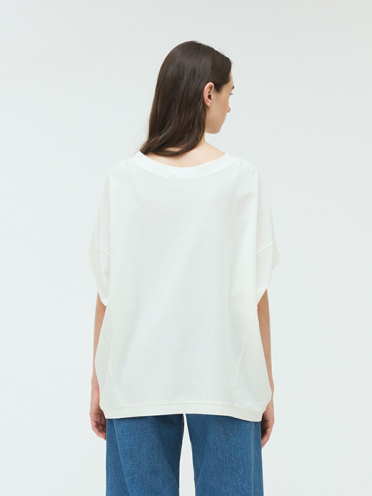 mizuiro indの定番人気、コクーンシルエットのワイドプルオーバー。丸みを帯びたシルエットがやさしい印象を与え、ゆったりとした5分袖は、ベストのようにも着こなせるデザイン。季節を問わず、ロングシーズンで活躍します。生地には、細かな凹凸のある梨地織りのアムンゼンを採用。陰影が美しく浮かび上がり、ほどよいハリ感とドレープが調和した上品な素材感に仕上がっています。シワになりにくく、お手入れがしやすい点も嬉しいポイント。肌離れがよく、暑い時季にもさらりと快適。淡色はやや透け感がございます。