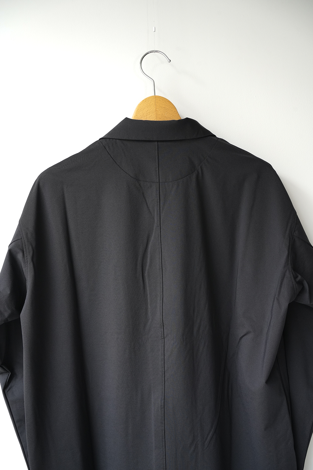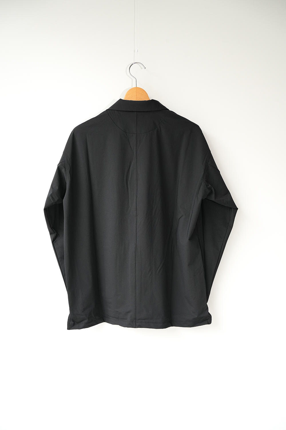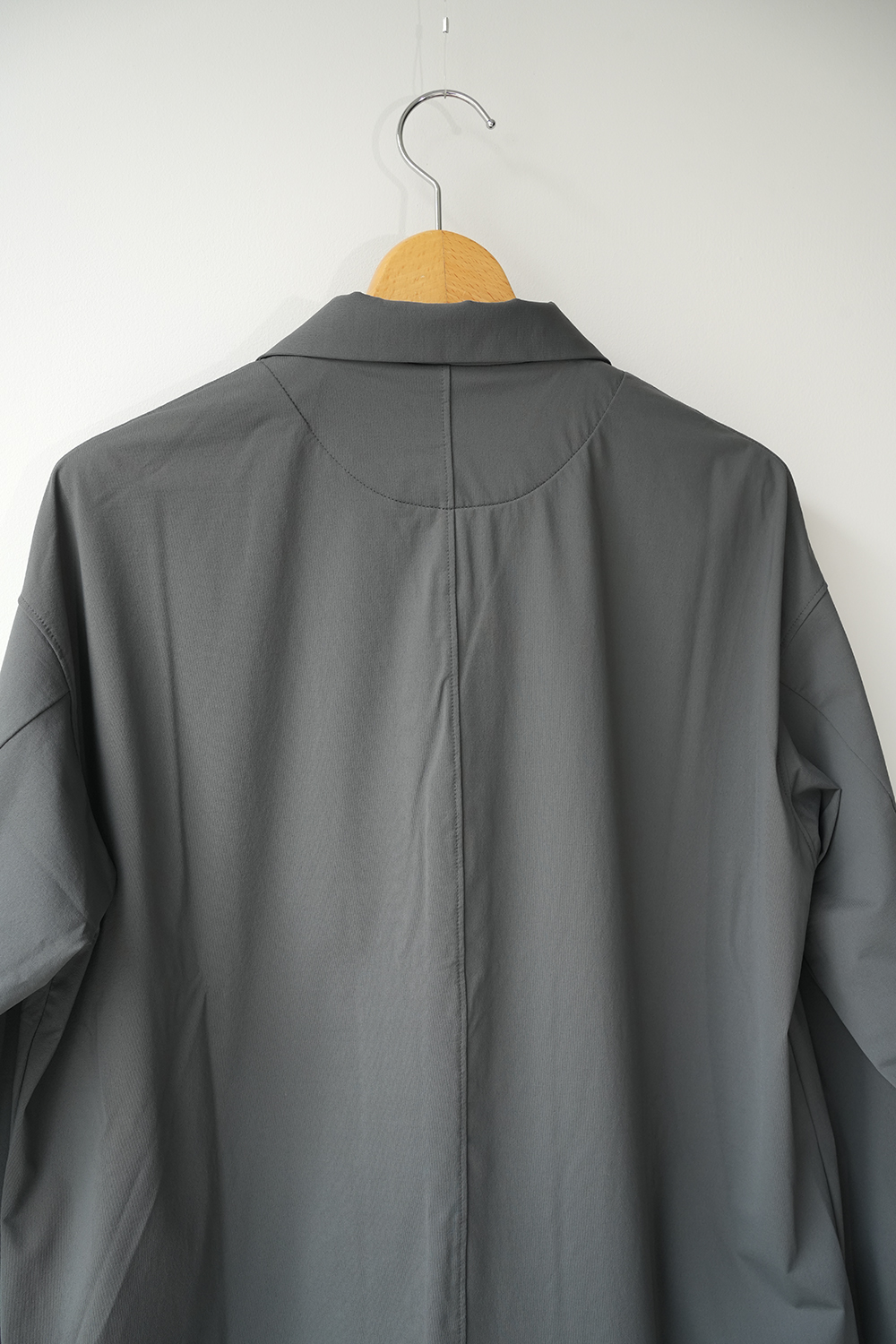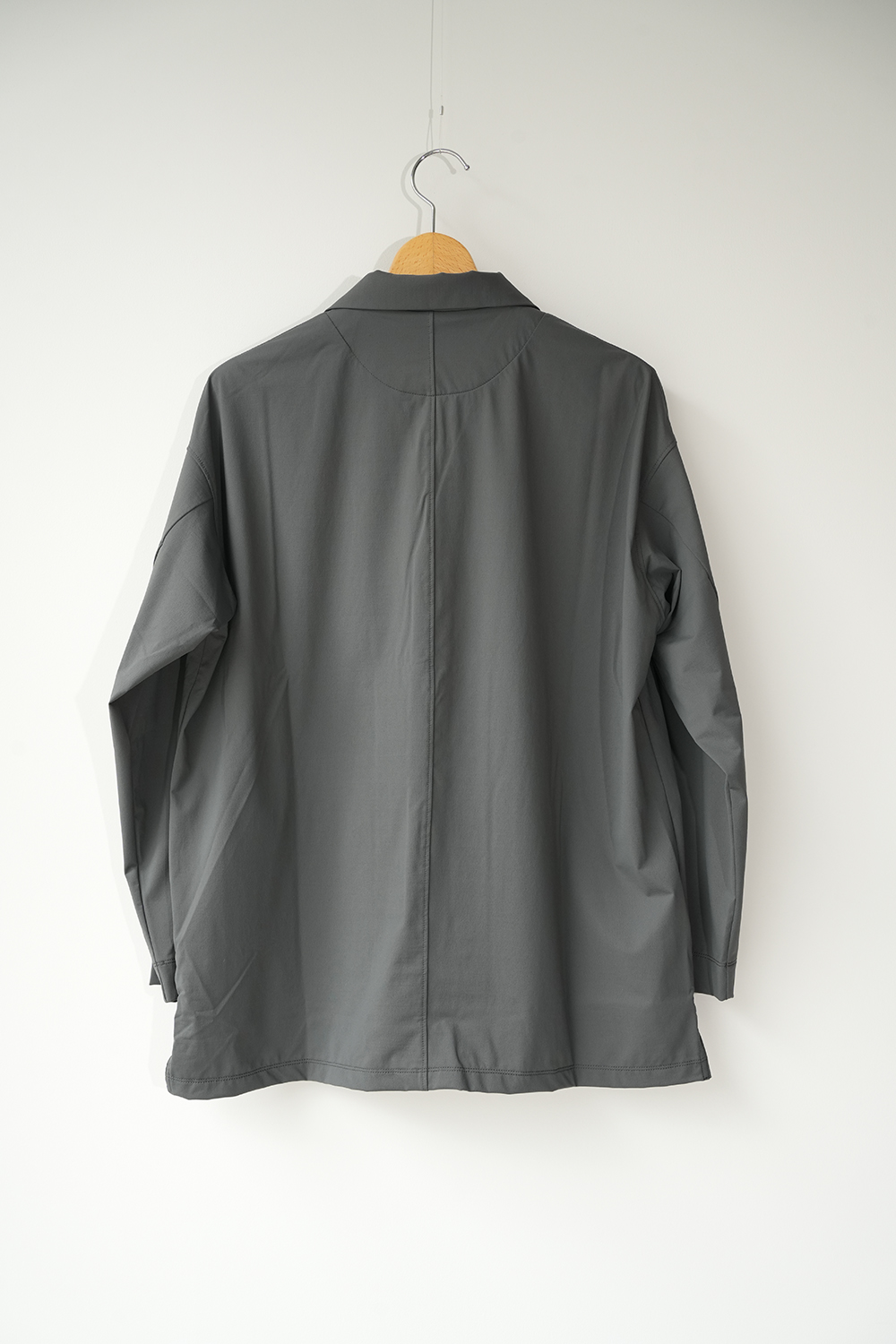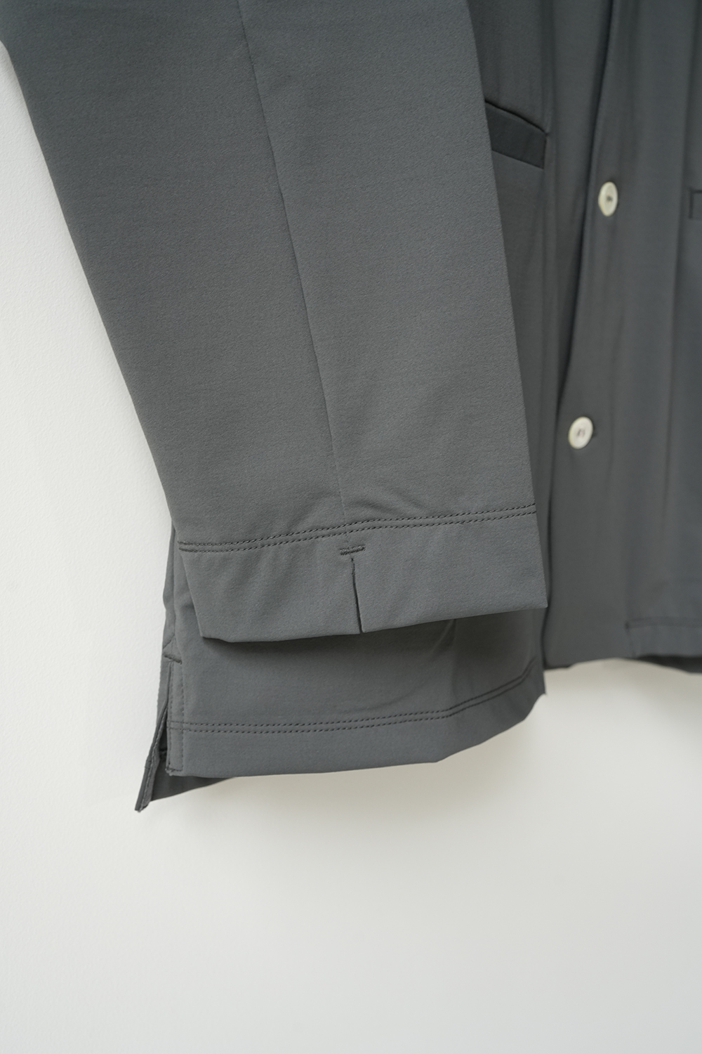 ストレッチナイロントリコット素材を用いたシャツジャケット。32ゲージの高密度で編み上げ、ポリウレタンを高含有率にてブレンドしたため、50%を超えるストレッチを持ちながらもキックバックにも長けています。また、シワにもなりにくく接触冷感機能もあるので寒暖差のある環境でコンパクトにまとめてカバンに入れて頂くこともできます。デザインはシャツとジャケットの要素をハイブリッドしているのでカーディガン感覚で軽く羽織ることができます。