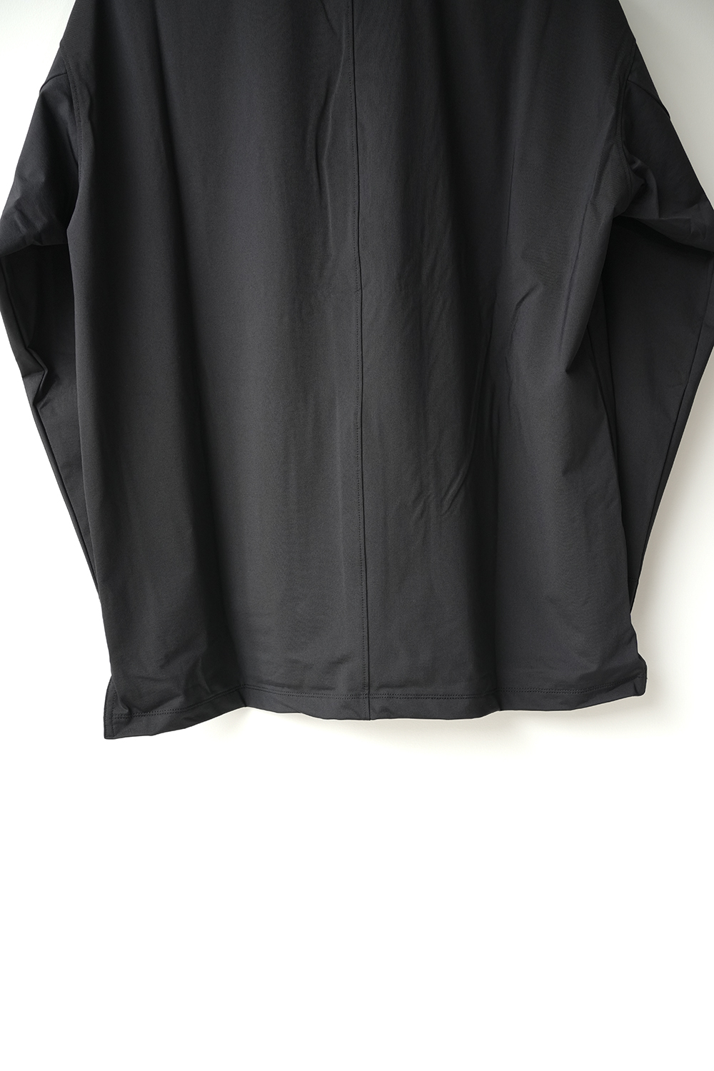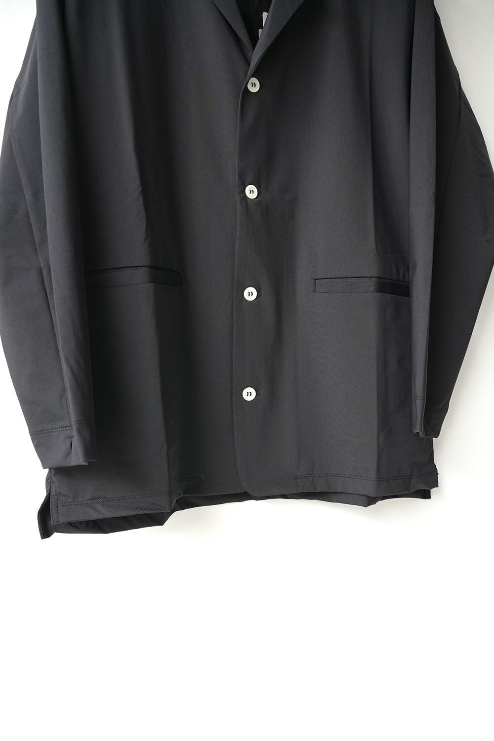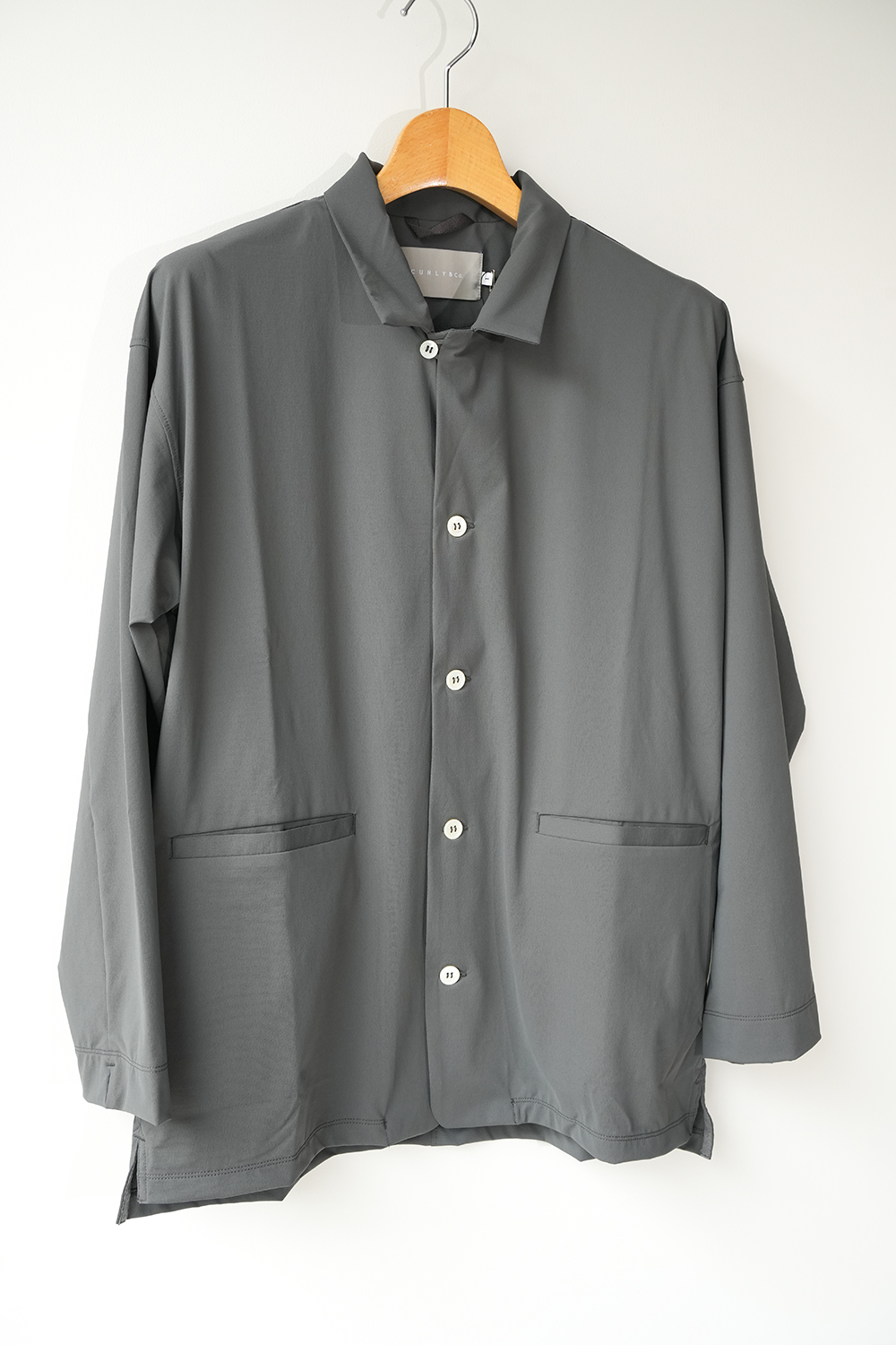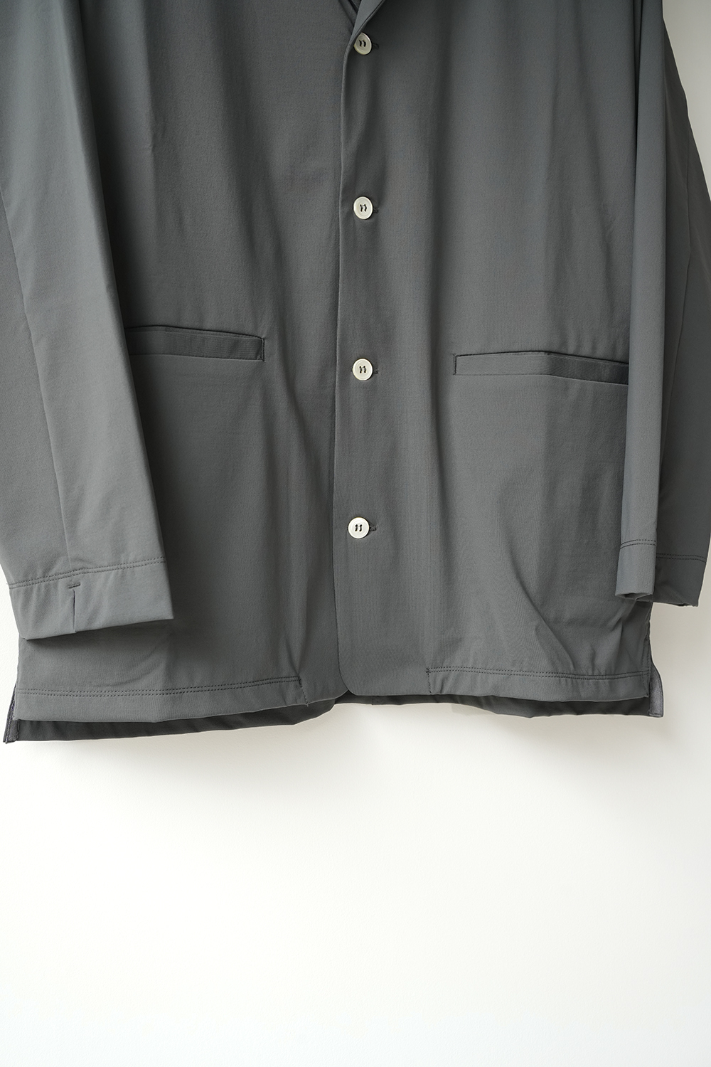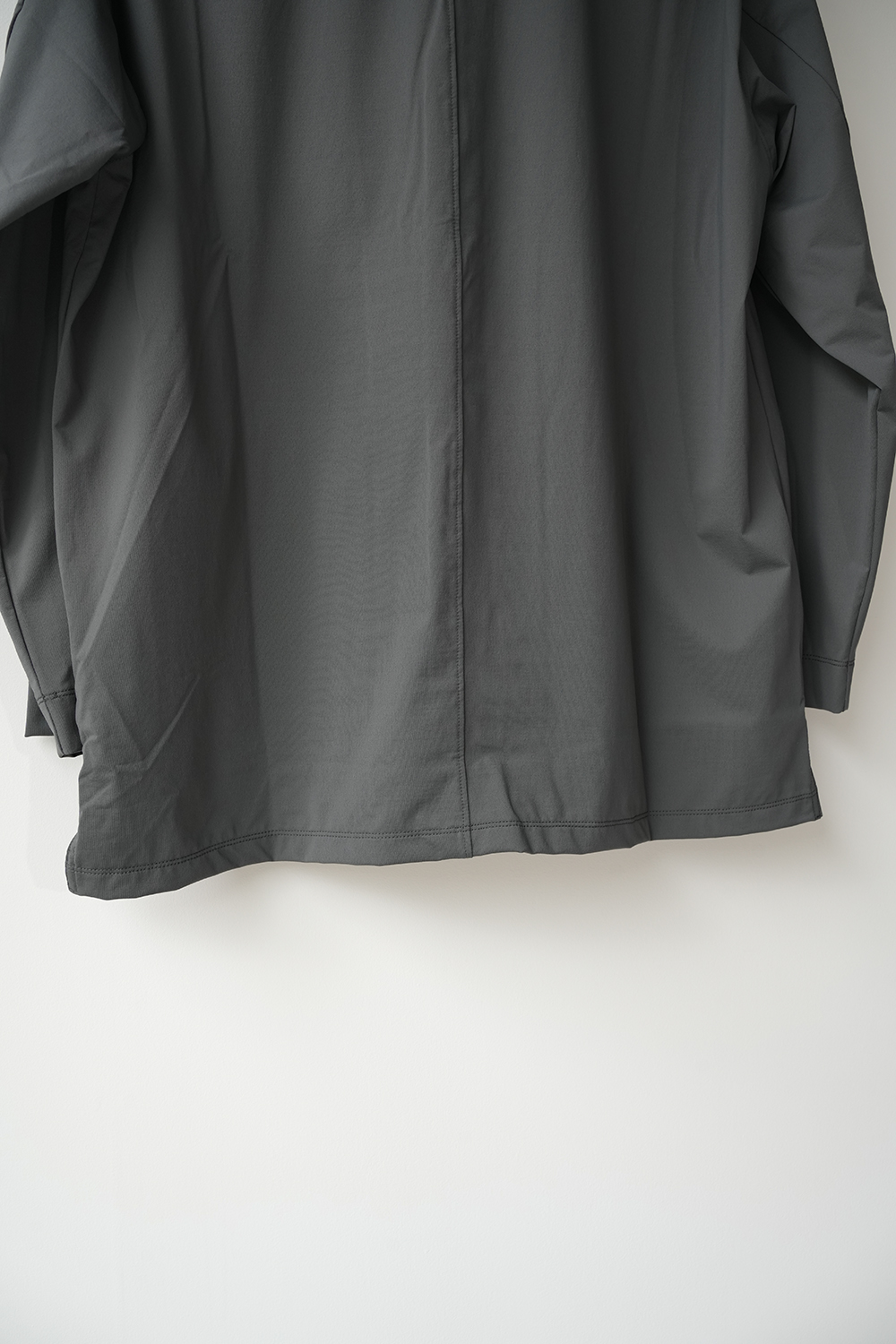 ストレッチナイロントリコット素材を用いたシャツジャケット。32ゲージの高密度で編み上げ、ポリウレタンを高含有率にてブレンドしたため、50%を超えるストレッチを持ちながらもキックバックにも長けています。また、シワにもなりにくく接触冷感機能もあるので寒暖差のある環境でコンパクトにまとめてカバンに入れて頂くこともできます。デザインはシャツとジャケットの要素をハイブリッドしているのでカーディガン感覚で軽く羽織ることができます。