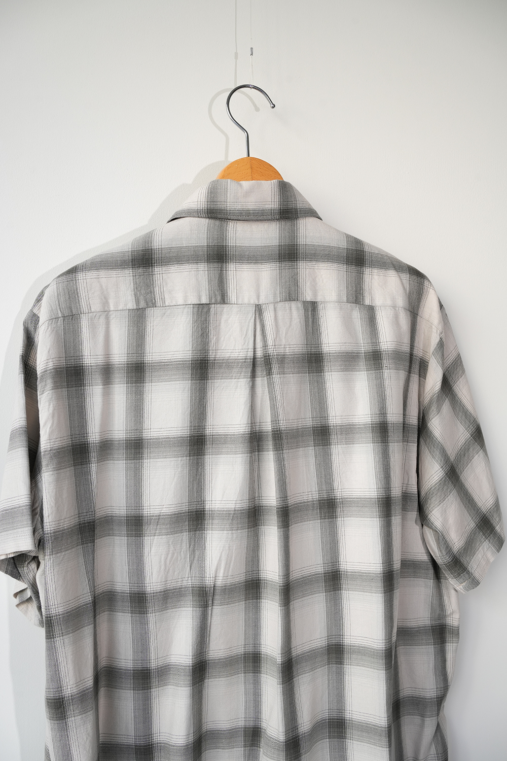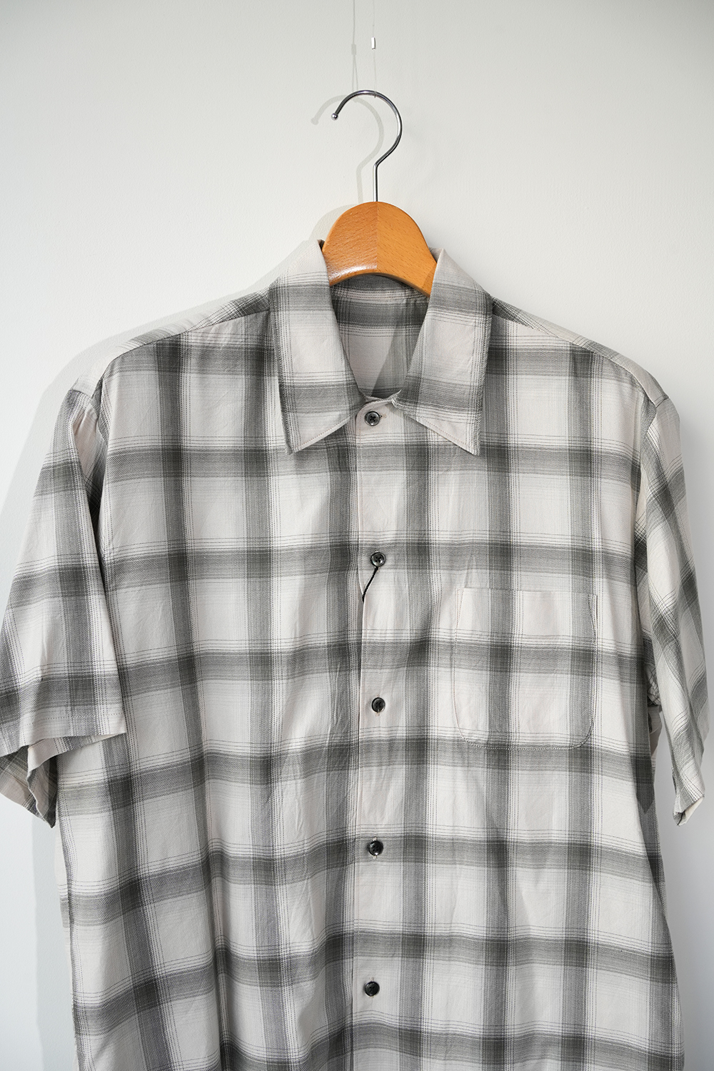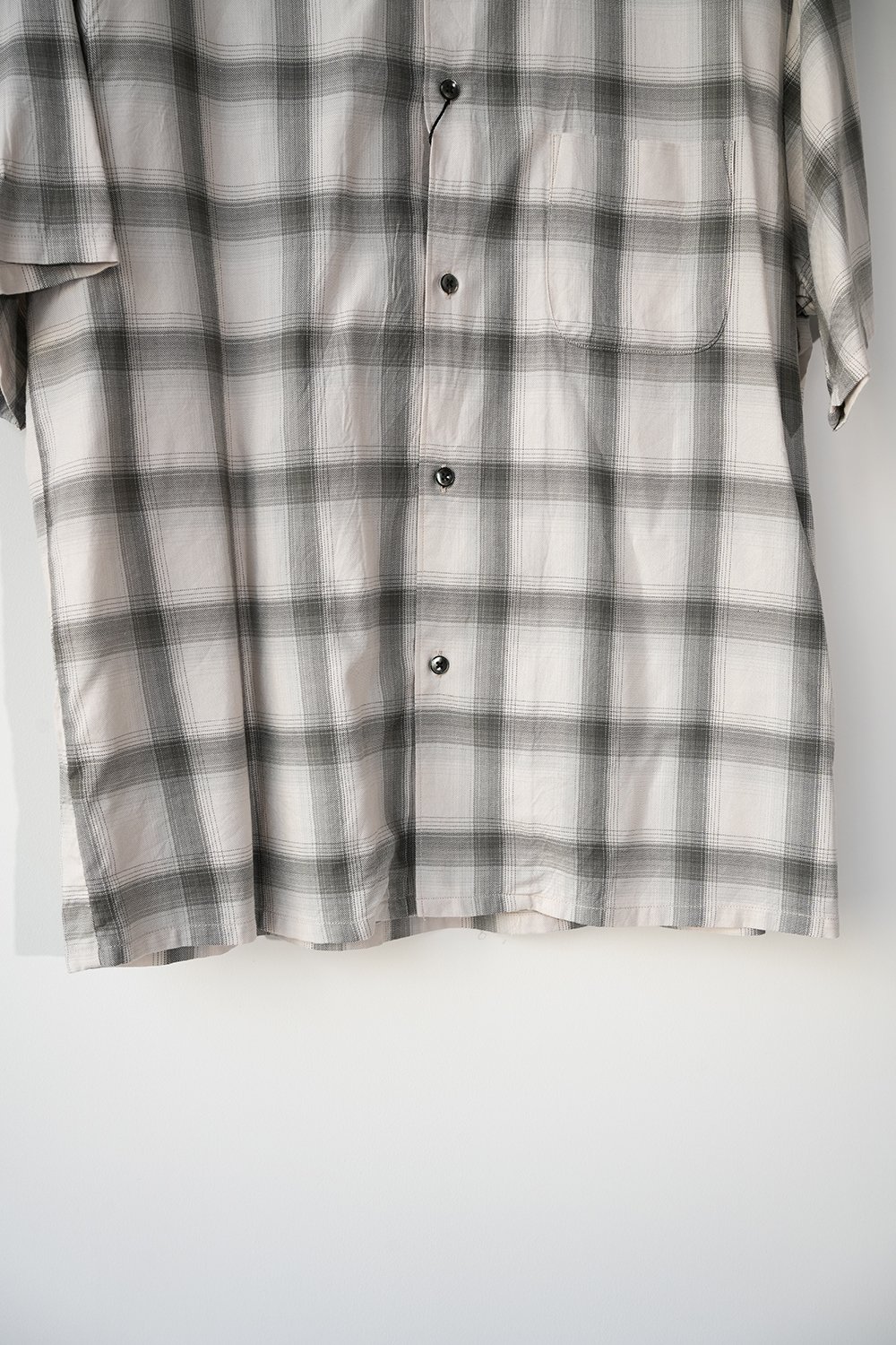 コットンレーヨン素材を使用したオープンカラーシャツ。レーヨンを織り交ぜた柔らかタッチと、落ち着いた配色のオンブレー柄が特徴です。ゆったりとリラックスしたボックスシルエットで、フロントにポケット付き。