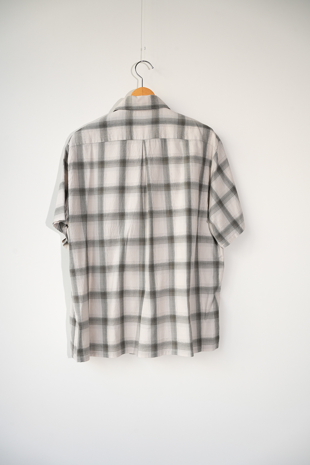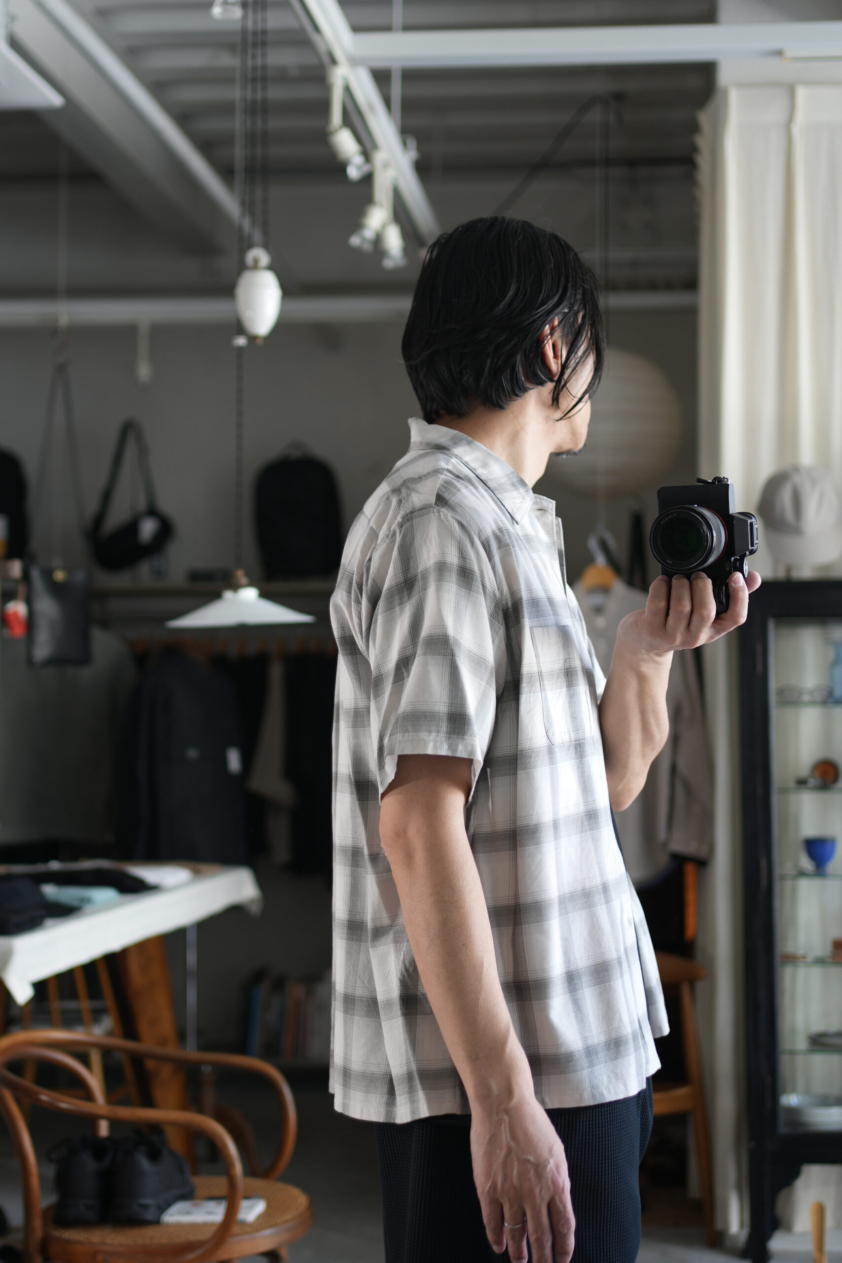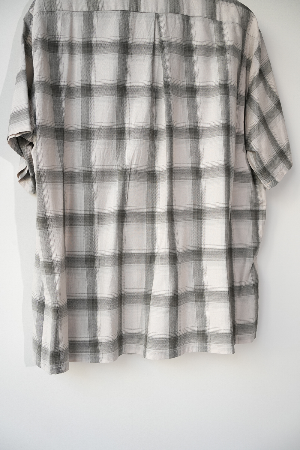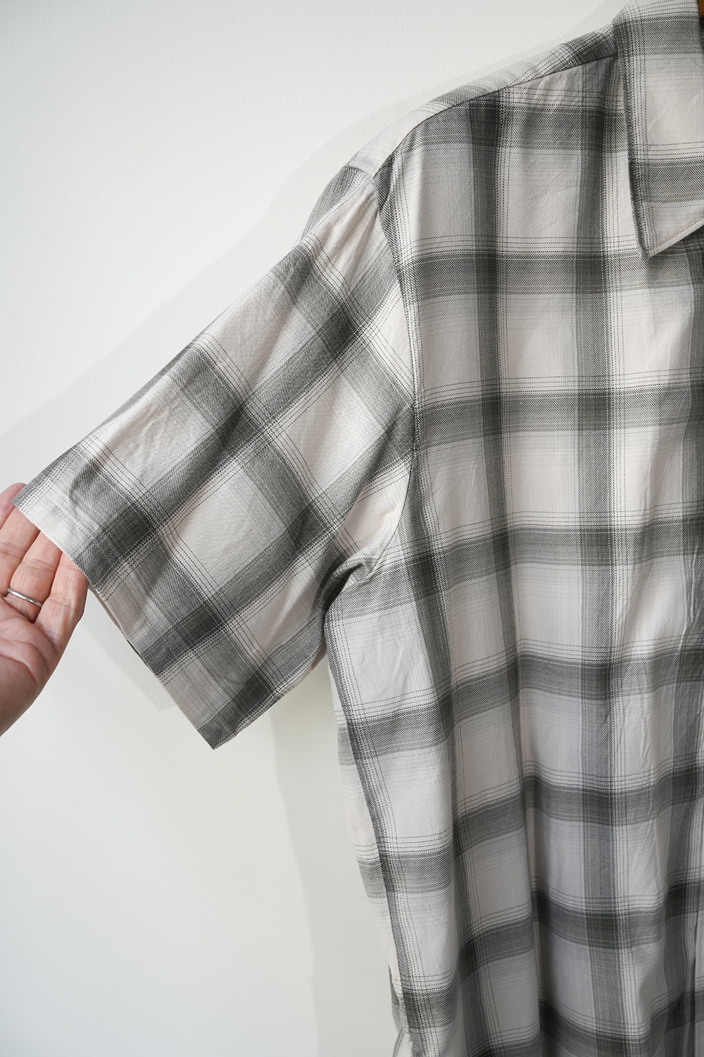コットンレーヨン素材を使用したオープンカラーシャツ。レーヨンを織り交ぜた柔らかタッチと、落ち着いた配色のオンブレー柄が特徴です。ゆったりとリラックスしたボックスシルエットで、フロントにポケット付き。