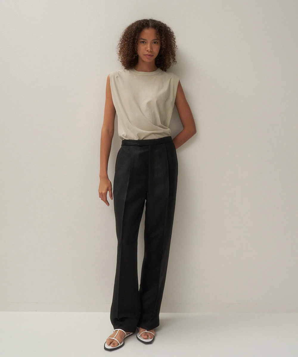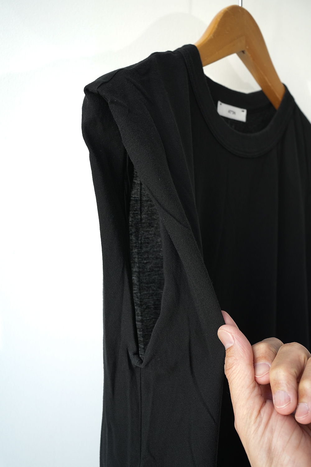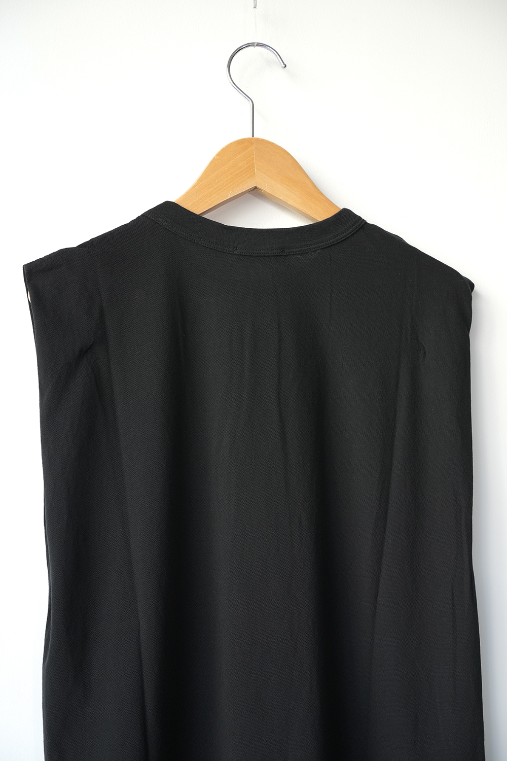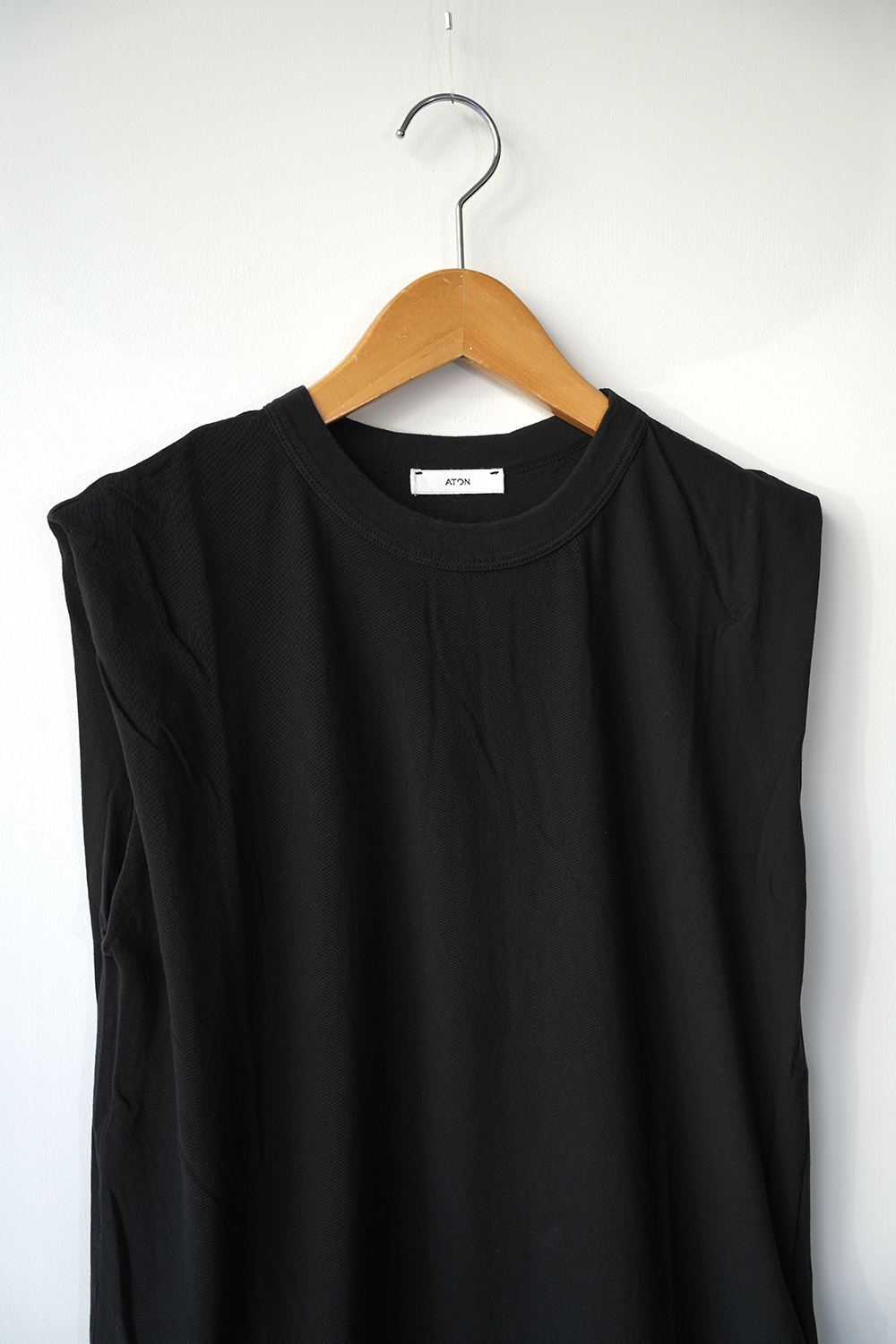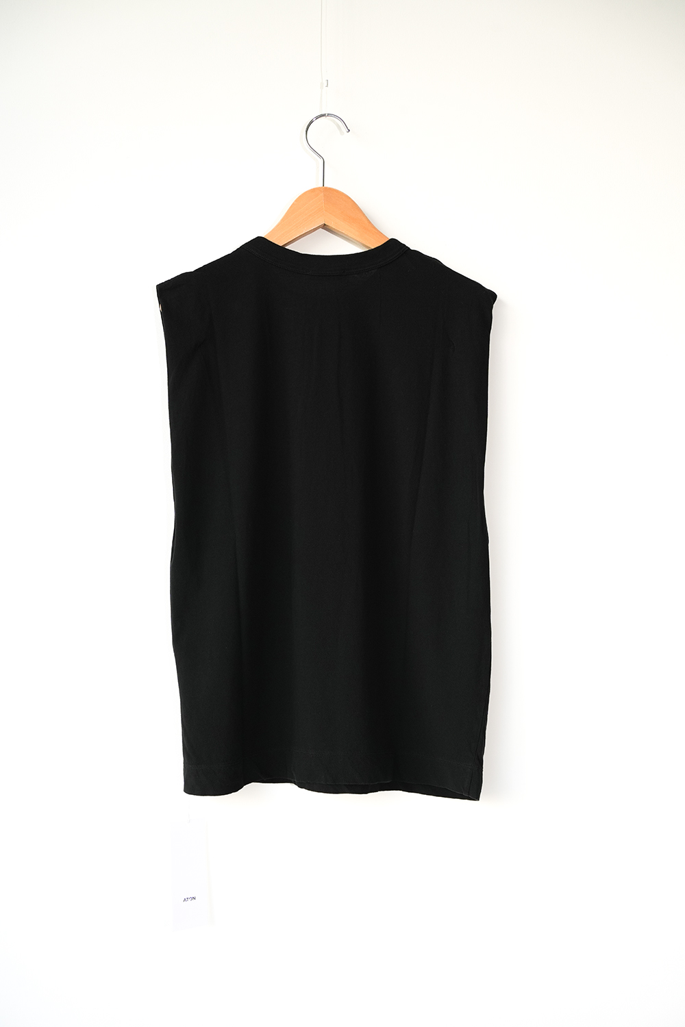 余裕のある身幅と太めのバインダー仕上げのスリーブレスカットソー。折りあげたような袖口のディテールがさりげなく二の腕をカバーします。インドの手積みのコットン強撚糸を和歌山で編み立てたサマーシーズンに最適なカットソーシリーズ。紡績の段階で特別な工程を入れる事で、強撚糸なのに美しい発色を実現しました。独特のシャリ感が暑い季節でもさらっと着られ、シワにもなりづらく洗濯後も乾きやすい、ATONオリジナル天竺素材です。