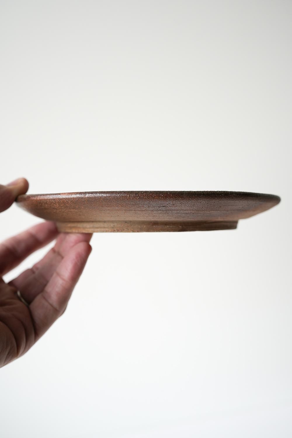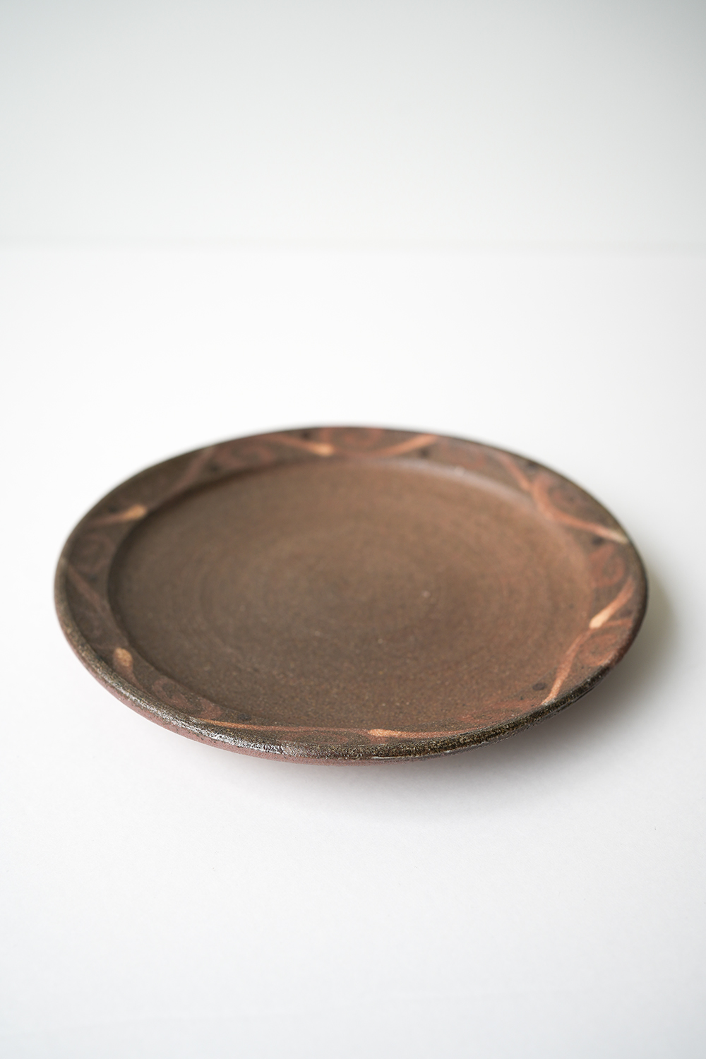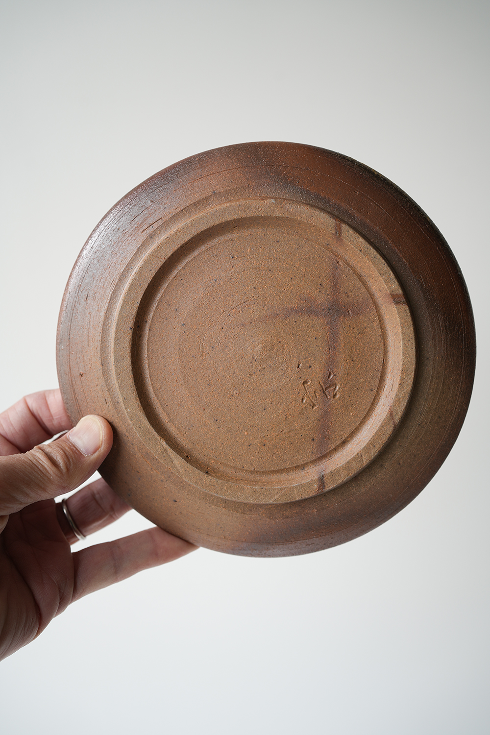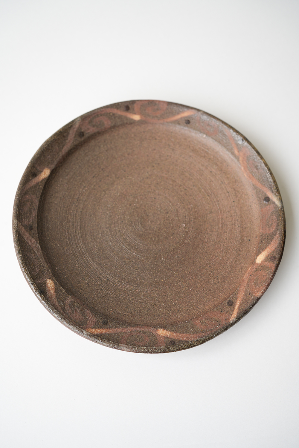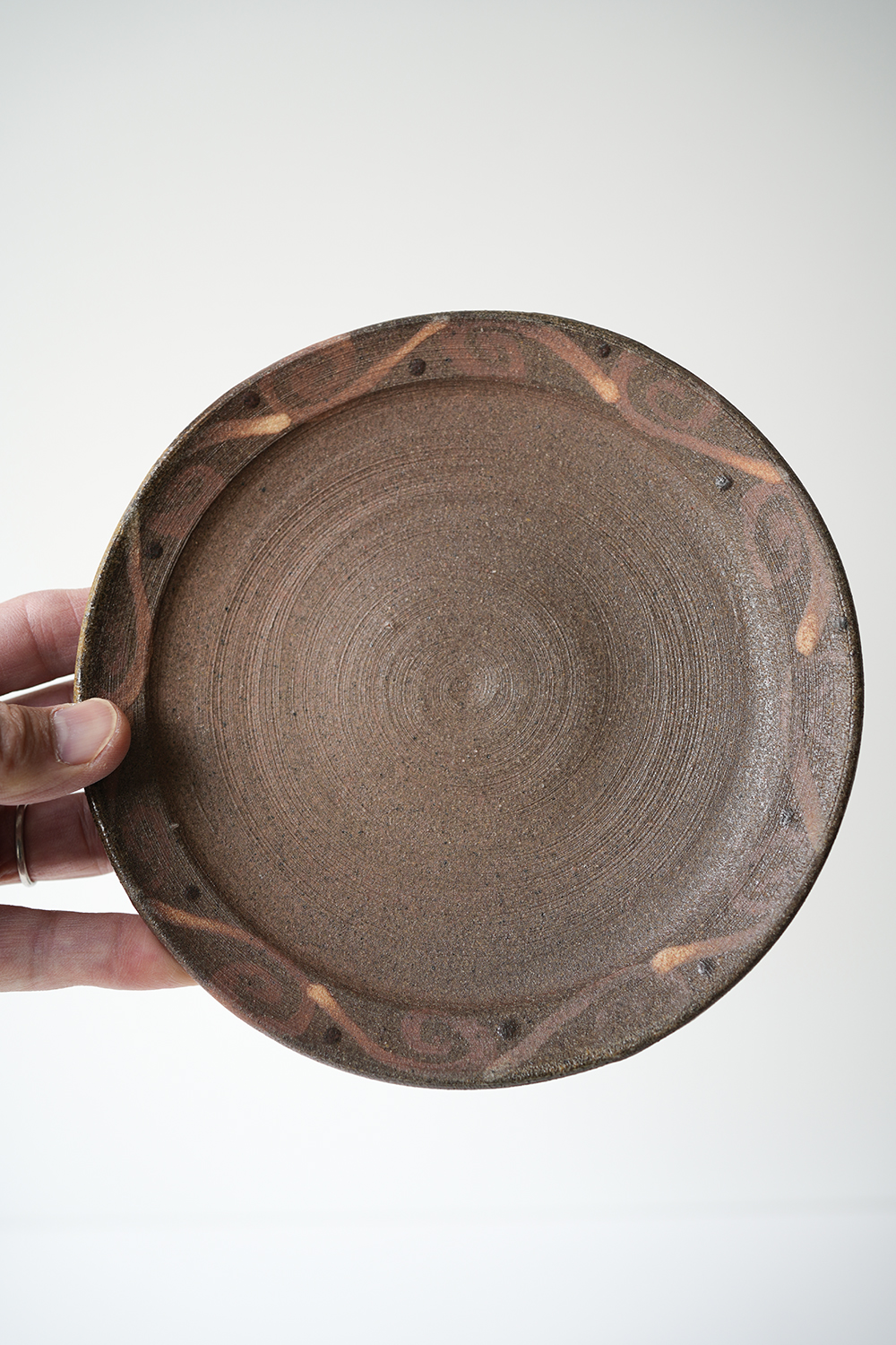 森岡宗彦さんとお父様の森岡光男さんお二人で営む「アツムイ窯」。森岡光男さんは神奈川県逗子市生まれ、鎌倉の名月窯で修業の後、萩、備前、沖縄など様々な窯をめぐり、ありとあらゆる技法や技術に習熟した。1972年、備前に落ち着き、イサム・ノグチと出会う。ノグチから刺激を受けて渡米。ニューヨークでは、何度もイサム・ノグチを訪問し、シアトルでアメリカ人の陶芸家エリック・ネルソン氏と窯を作る。米国滞在の後ヨーロッパ各地を旅し安曇野に登窯を築き、それ以来焼き締めのうつわ作りに没頭。息子である森岡宗彦さんは光男さんと共に幼き頃より陶芸に向き合い今に至る。鉱石などを使わない、薪窯(穴窯・登窯)で燃やされた木の灰が自然の釉薬となって表情を作る焼き締め技法。焼き締めのお皿のリム部分にスリップウェア技法で柄付けを施した皿。