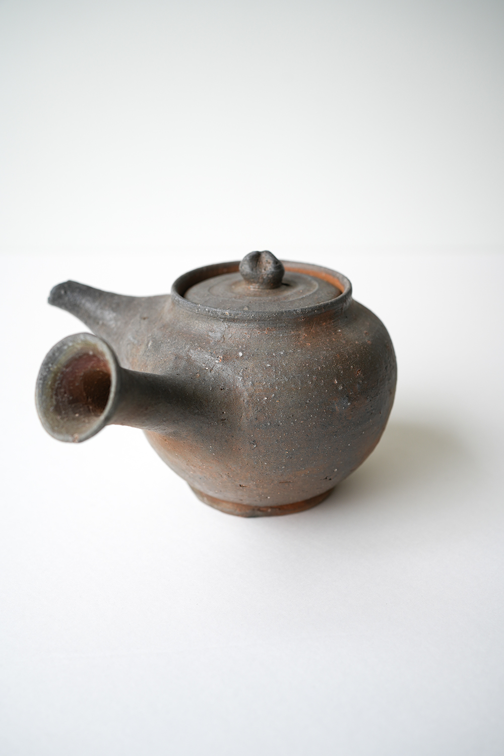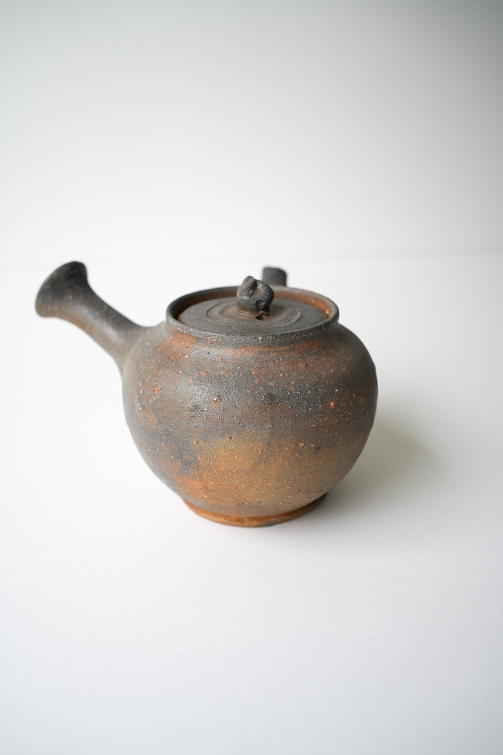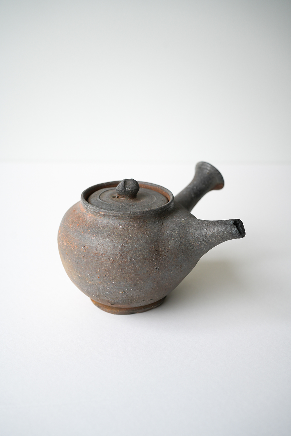「アツムイ窯」は、森岡光男さんと森岡宗彦さんお二人で営む安曇野の窯。森岡光男さんは神奈川県逗子市生まれ、鎌倉の名月窯で修業の後、萩、備前、沖縄など様々な窯をめぐり、ありとあらゆる技法や技術に習熟した。1972年、備前に落ち着き、イサム・ノグチと出会う。ノグチから刺激を受けて渡米。ニューヨークでは、何度もイサム・ノグチを訪問し、シアトルでアメリカ人の陶芸家エリック・ネルソン氏と窯を作る。米国滞在の後ヨーロッパ各地を旅し安曇野に登窯を築き、それ以来焼き締めのうつわ作りに没頭。1944年生まれ、1967年から陶芸を始められた名人 森岡光男さんのシグネチャープロダクトである急須。灰の中で焼き締められた灰色に輝く匠の急須と湯呑みをご覧ください。