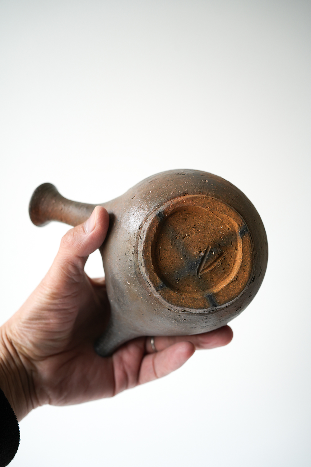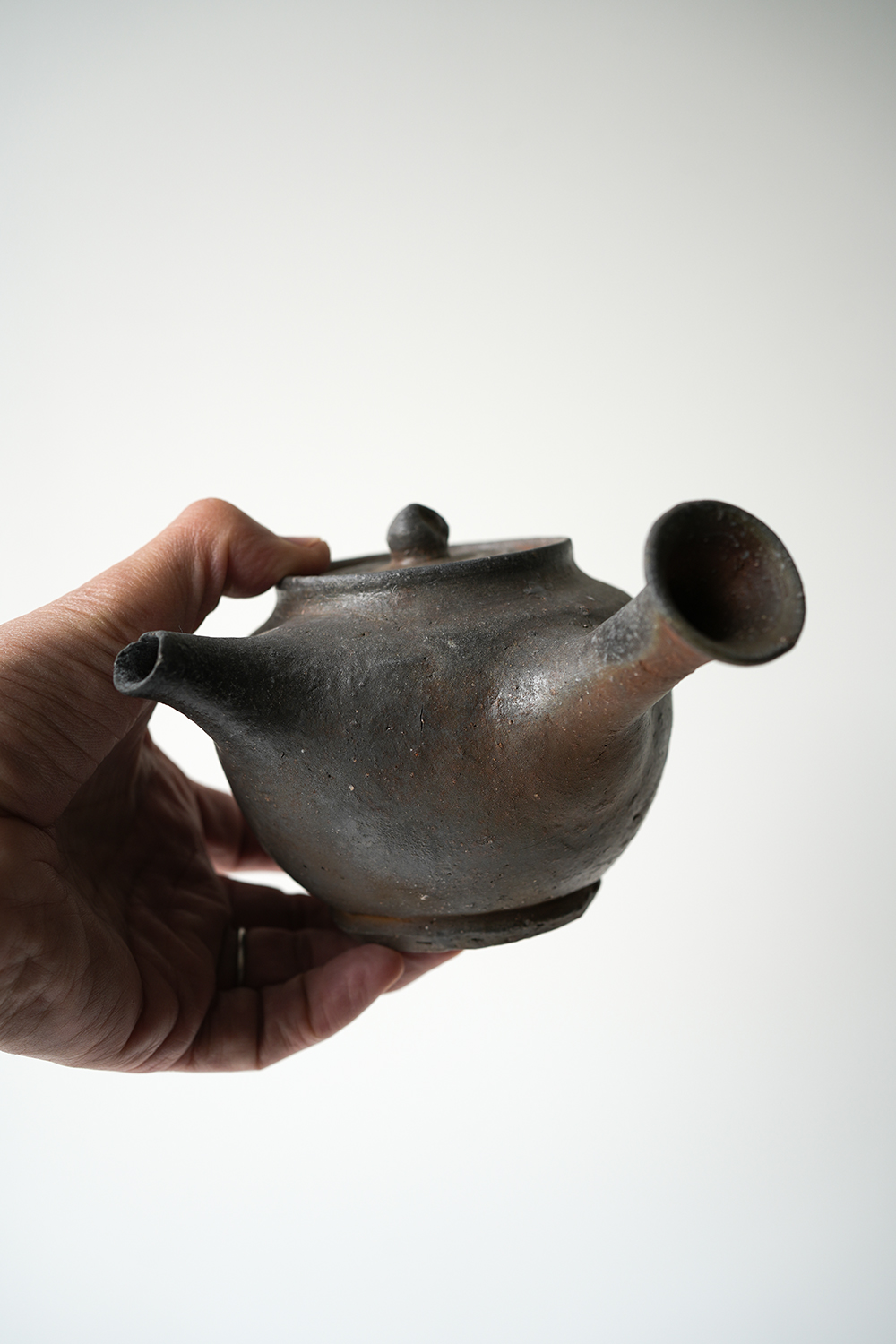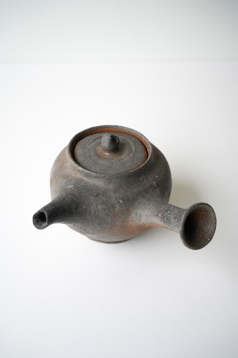 「アツムイ窯」は、森岡光男さんと森岡宗彦さんお二人で営む安曇野の窯。森岡光男さんは神奈川県逗子市生まれ、鎌倉の名月窯で修業の後、萩、備前、沖縄など様々な窯をめぐり、ありとあらゆる技法や技術に習熟した。1972年、備前に落ち着き、イサム・ノグチと出会う。ノグチから刺激を受けて渡米。ニューヨークでは、何度もイサム・ノグチを訪問し、シアトルでアメリカ人の陶芸家エリック・ネルソン氏と窯を作る。米国滞在の後ヨーロッパ各地を旅し安曇野に登窯を築き、それ以来焼き締めのうつわ作りに没頭。1944年生まれ、1967年から陶芸を始められた名人 森岡光男さんのシグネチャープロダクトである急須。灰の中で焼き締められた灰色に輝く匠の急須と湯呑みをご覧ください。