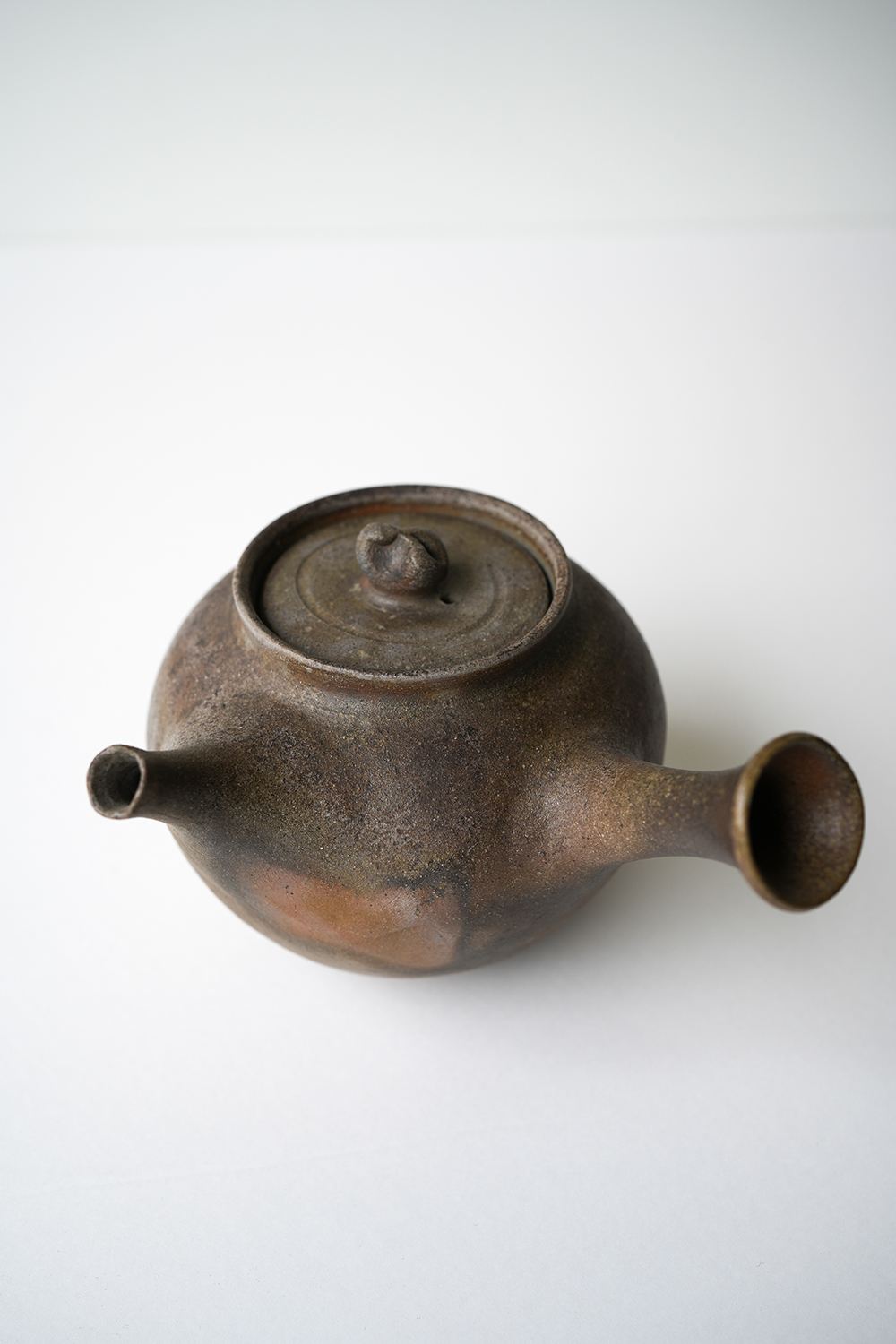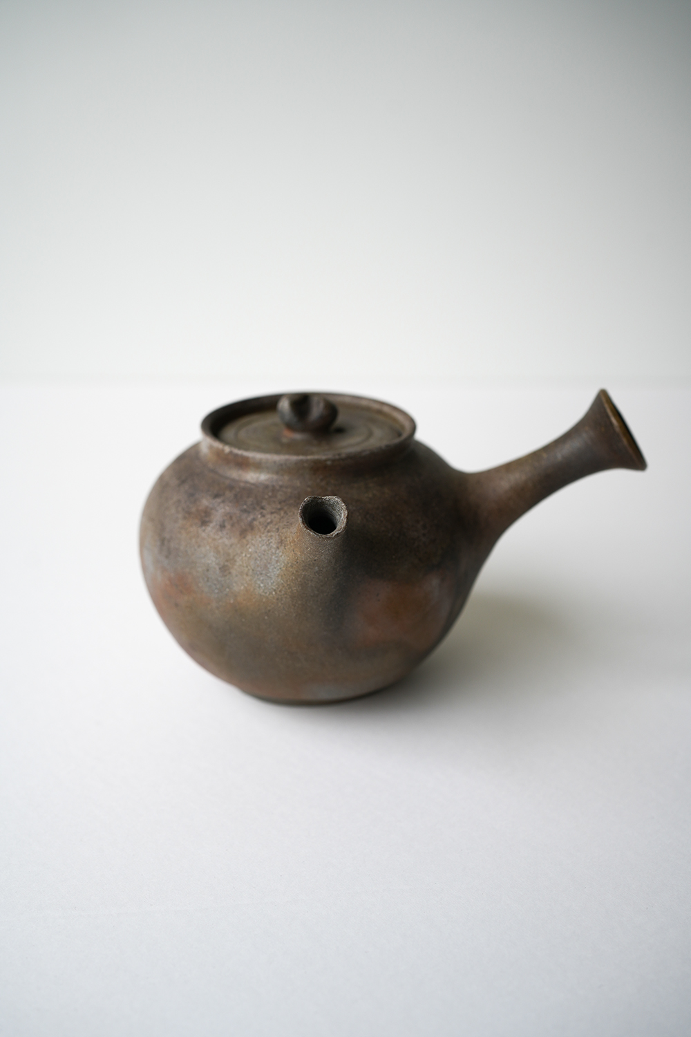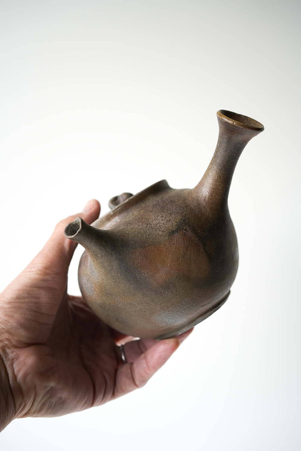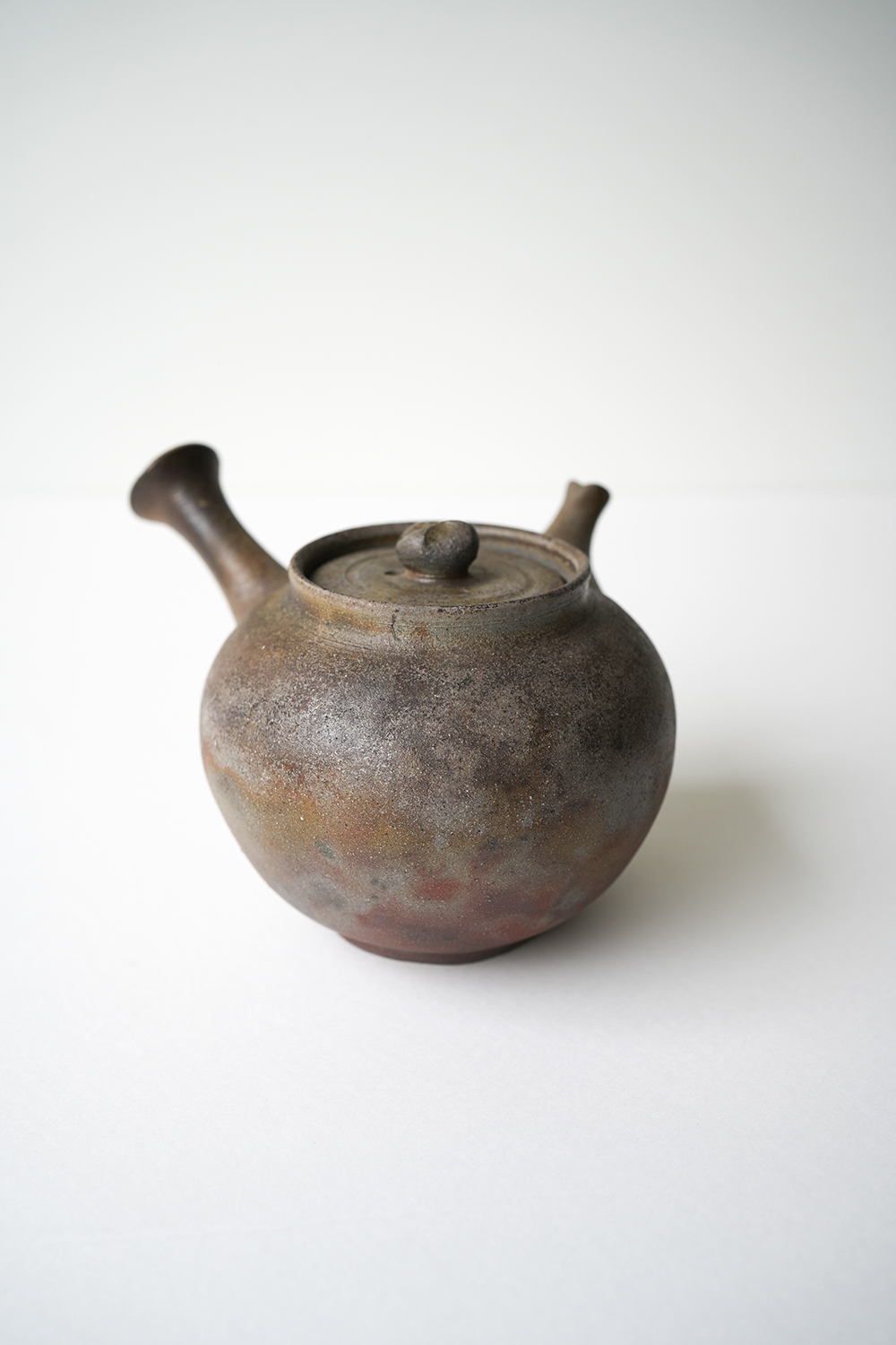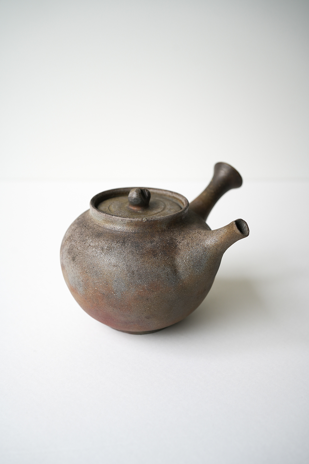 「アツムイ窯」は、森岡光男さんと森岡宗彦さんお二人で営む安曇野の窯。森岡光男さんは神奈川県逗子市生まれ、鎌倉の名月窯で修業の後、萩、備前、沖縄など様々な窯をめぐり、ありとあらゆる技法や技術に習熟した。1972年、備前に落ち着き、イサム・ノグチと出会う。ノグチから刺激を受けて渡米。ニューヨークでは、何度もイサム・ノグチを訪問し、シアトルでアメリカ人の陶芸家エリック・ネルソン氏と窯を作る。米国滞在の後ヨーロッパ各地を旅し安曇野に登窯を築き、それ以来焼き締めのうつわ作りに没頭。1944年生まれ、1967年から陶芸を始められた名人 森岡光男さんのシグネチャープロダクトである急須。灰の中で焼き締められた灰色に輝く匠の急須と湯呑みをご覧ください。