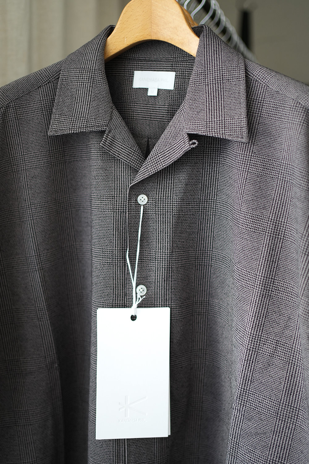 Ether”という新型を作成しました。オープンカラーの新型は、半袖にだけ採用。軽く包むような雰囲気程よいモダンフィットのシルエットから名付けました。ハイゲージで表面感のある素材をずっと作りたく糸を探していました。無いなら作ろうということで、34/-TCブークレ糸という絶妙な番手で作成。36Gハイゲージジャガード機でトラッドなギンガムチェック柄で編立ました。ハリ感とシャリ感のある風合い、ブークレによる凹凸のある表面感は、唯一無二の雰囲気がございます。ディティールは、ドレスシャツを採用し全て巻き伏せ本縫い仕様、貝蝶釦使いです。素材のハリ感、光沢感がある為、オーバーパターンですがカジュアルになりすぎない、生地が生み出すドレッシー感とパターンが生み出すカジュアル感を融合させた、ラグジュアリールーズな唯一無二のシャツ。