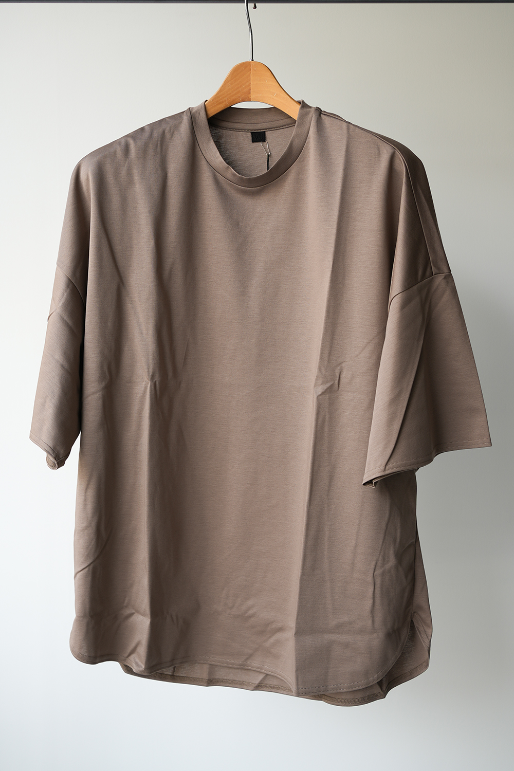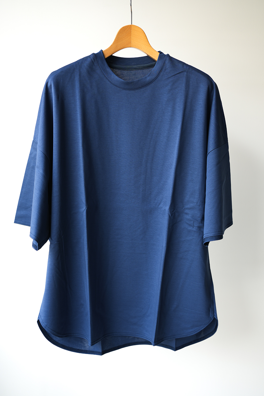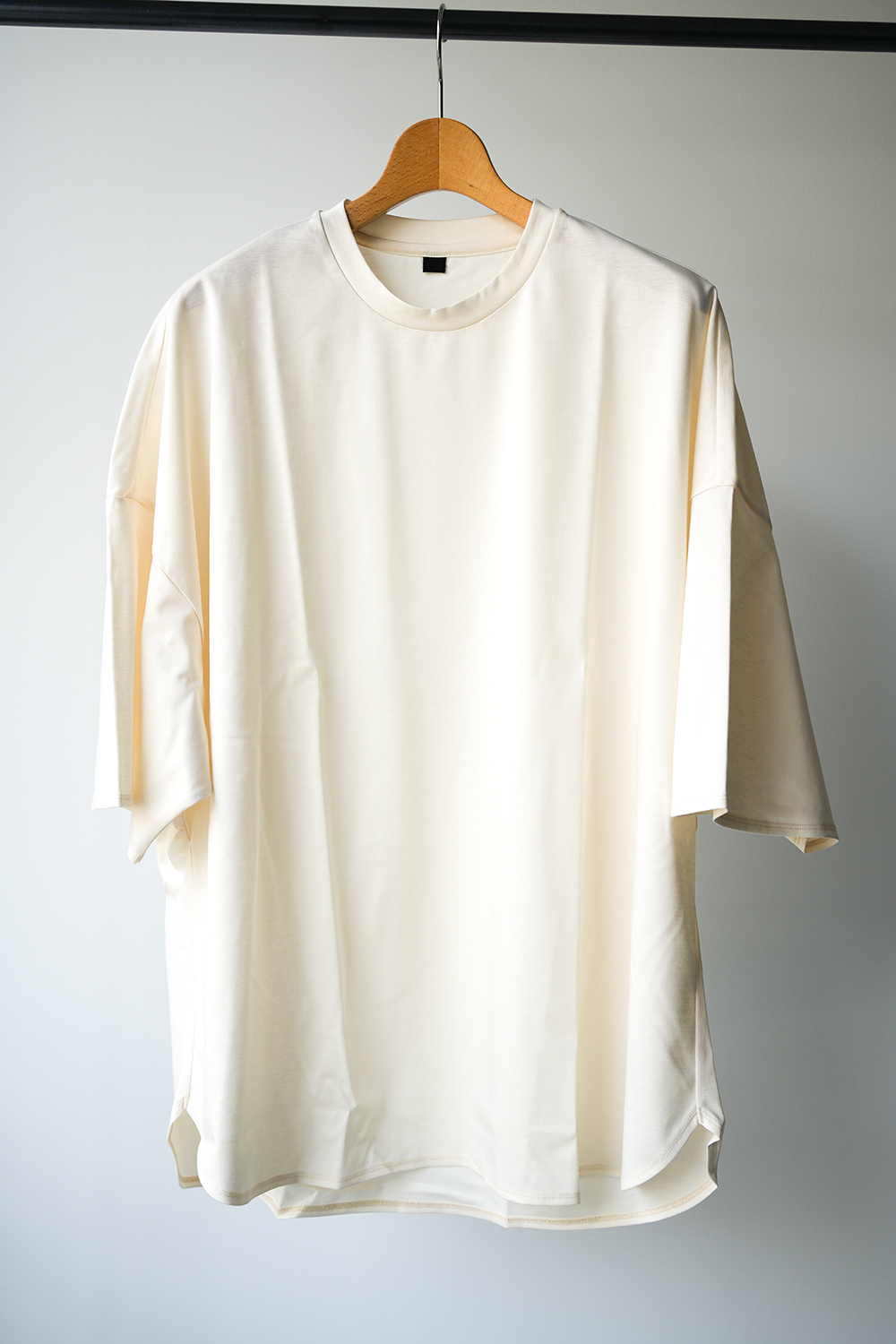 心地さわやかな素材感のワイドシルエットの6分丈のシンプルなTシャツ。 高級超長綿のスーピマコットンを32Gのハイゲージであむことにより今までにないシャープを表現しました。また、ロイヤルクール加工を施すことにより、極限まで毛羽を削ぎ落し、上品な光沢を表現しました。綿であるのにドレープ感があり、透けにくく、ストレッチ性の高い生地です。 袖の内側を削って独特な袖のシルエットにしています。 MADE IN JAPAN (縫製:日本、生地:日本)。