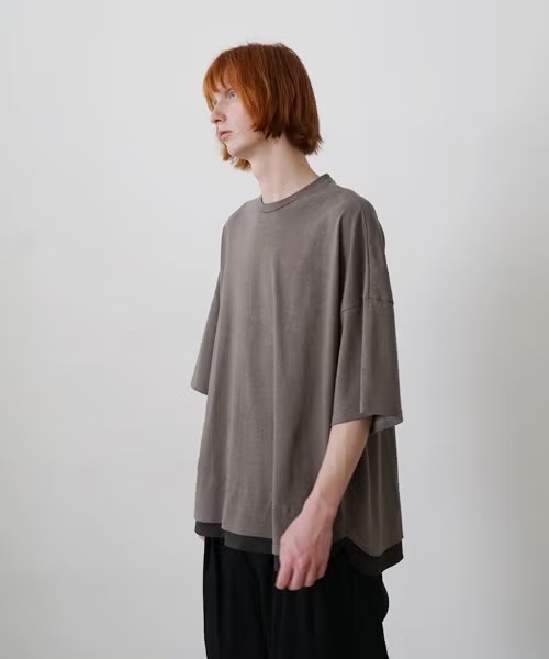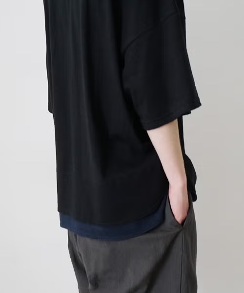裾の2枚配色とサイドスリット、自然なレイヤード感を生むTシャツ。裾の配色切替とサイドスリットにより、1枚で重ね着したような印象に仕上げたTシャツ。動きの中で自然なレイヤード感が生まれるデザインです。ゆったりとしたリラックスシルエット、肘下まで届く6〜7分丈スリーブ。 HEMP 55% / COTTON 45%、凹凸感のあるナチュラルな表情、ドライタッチで肌離れの良い質感、通気性に優れた春夏向け素材、コットンの柔らかさにヘンプ特有の凹凸感とさらりとした肌触りを加えています。暑い季節でも快適に着用できる通気性の良さが特徴です。