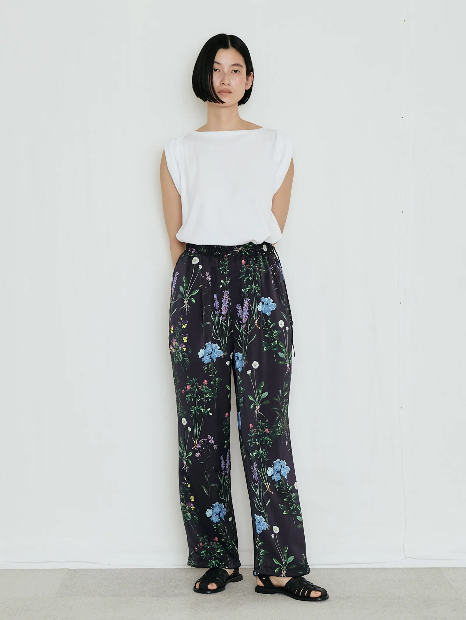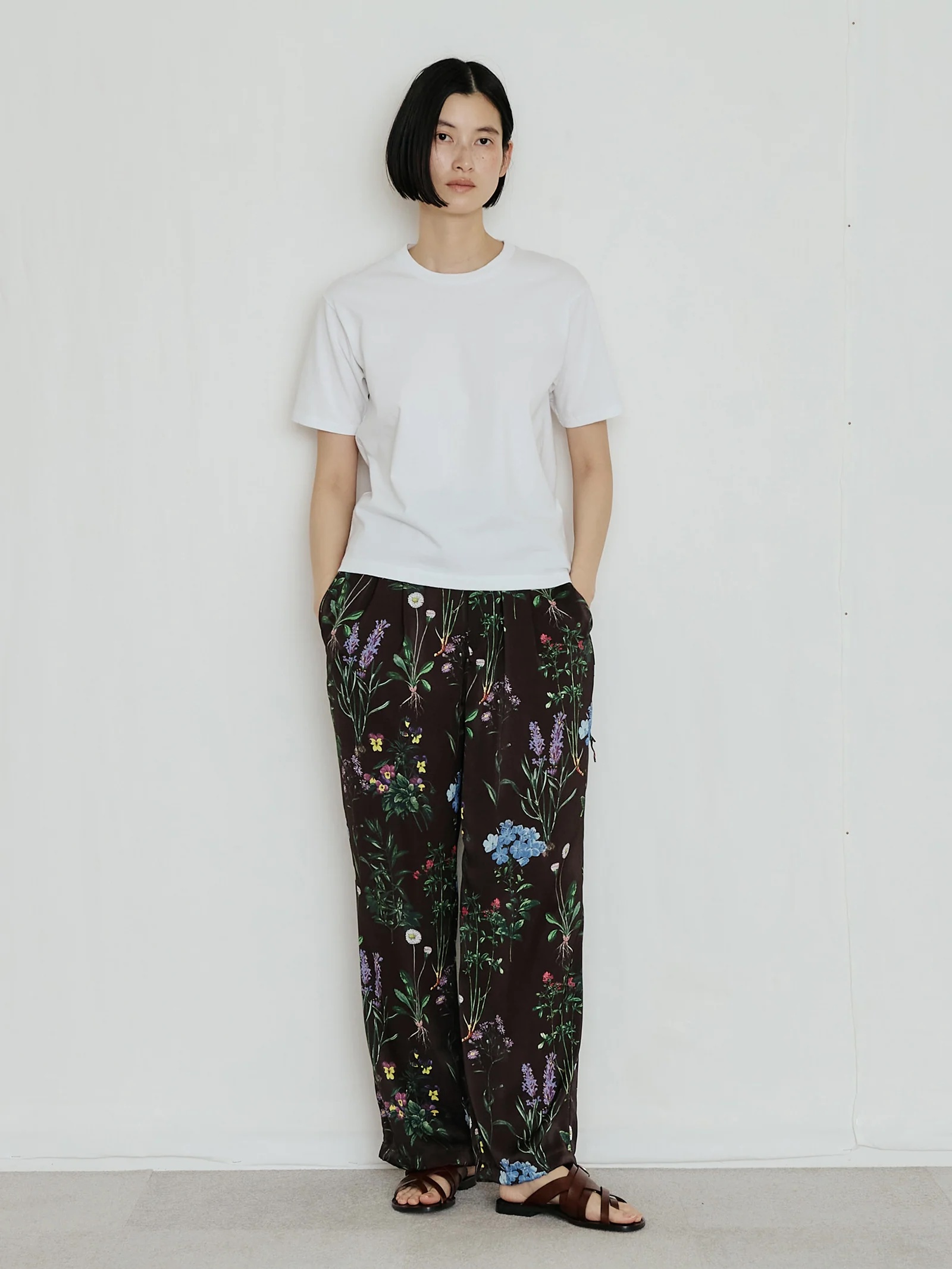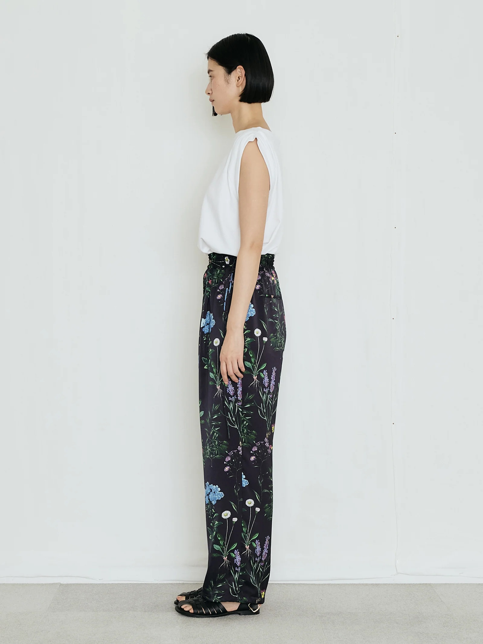 繊細かつ鮮やかでラフなフラワープリントパンツ。素材の美しさを生かしたミニマルなデザイン、とろみのあるドレープと桃のような柔らかい肌触りが魅力、リラクシーながらも、すっきりとした上品なシルエット。オリジナルのインクジェットプリントによる繊細なフラワーモチーフ、ヴィンテージ図鑑を思わせる花々が、大人の装いに華を添える、ウエストゴムで左部分にはドローコードを施しています。裾部分も絞れるようになっています。ポリエステル繊維を柔らかくシルクのようなしなやかなドレープ感のある風合いを持たせるために加工を施しています。非常に繊細な技術力が必要な加工です。桃のような肌触りとしなやかな柔らかさを持った素材です。プリントはダイレクトインクジェットという手法を使っています。TICCAらしい濃色のベースカラーに可憐な野草のモチーフを散りばめた、華やか且つどんな色とも相性のいい柄です。同素材のフラワープリントビスチェを合わせて、セットアップとして着こなすのがおすすめ。Tシャツやノースリーブシャツを合わせれば、抜け感のあるリラックススタイルに。シンプルなリネンシャツやジャケットを羽織っても、プリントがほどよいアクセントになります。足元はサンダルやフラットシューズで軽やかに、ヒールを合わせれば上品なサマールックに仕上がります。