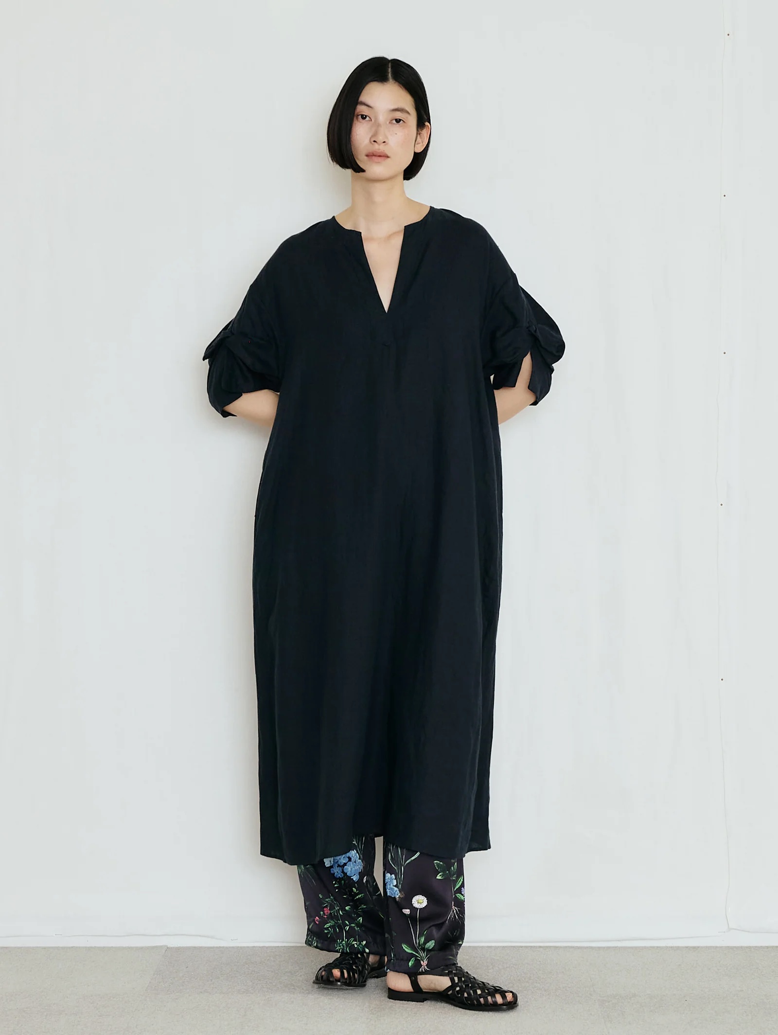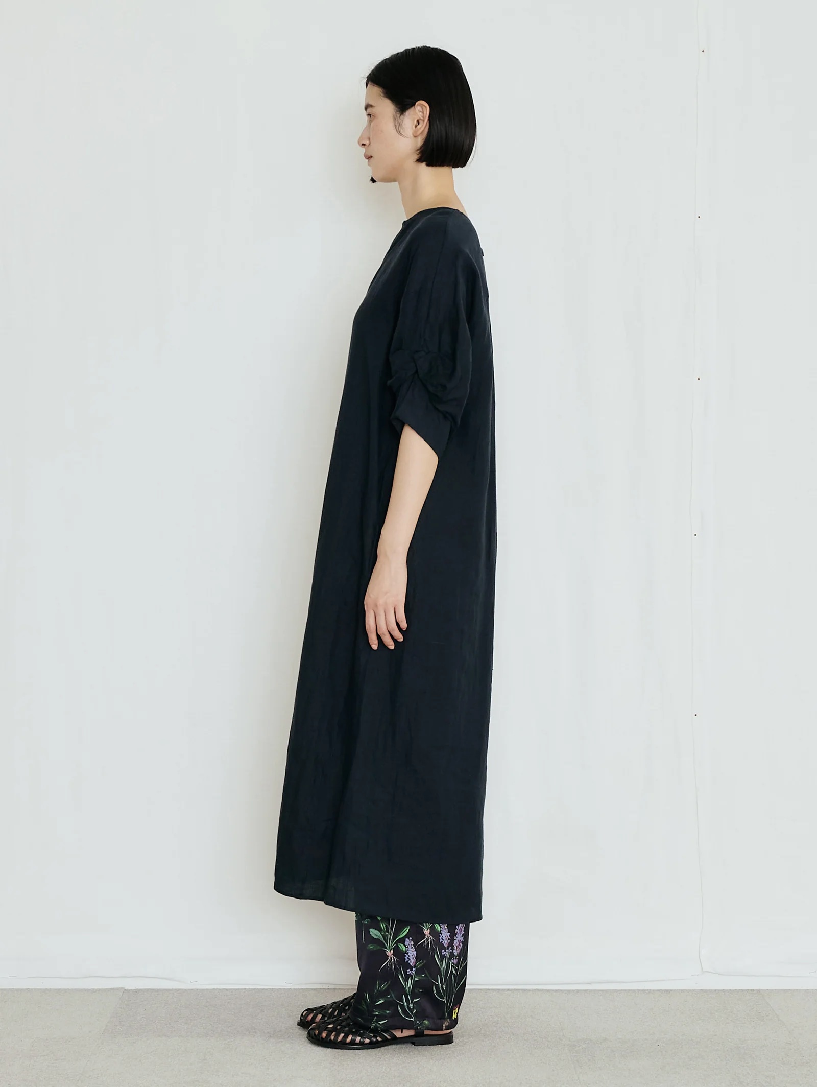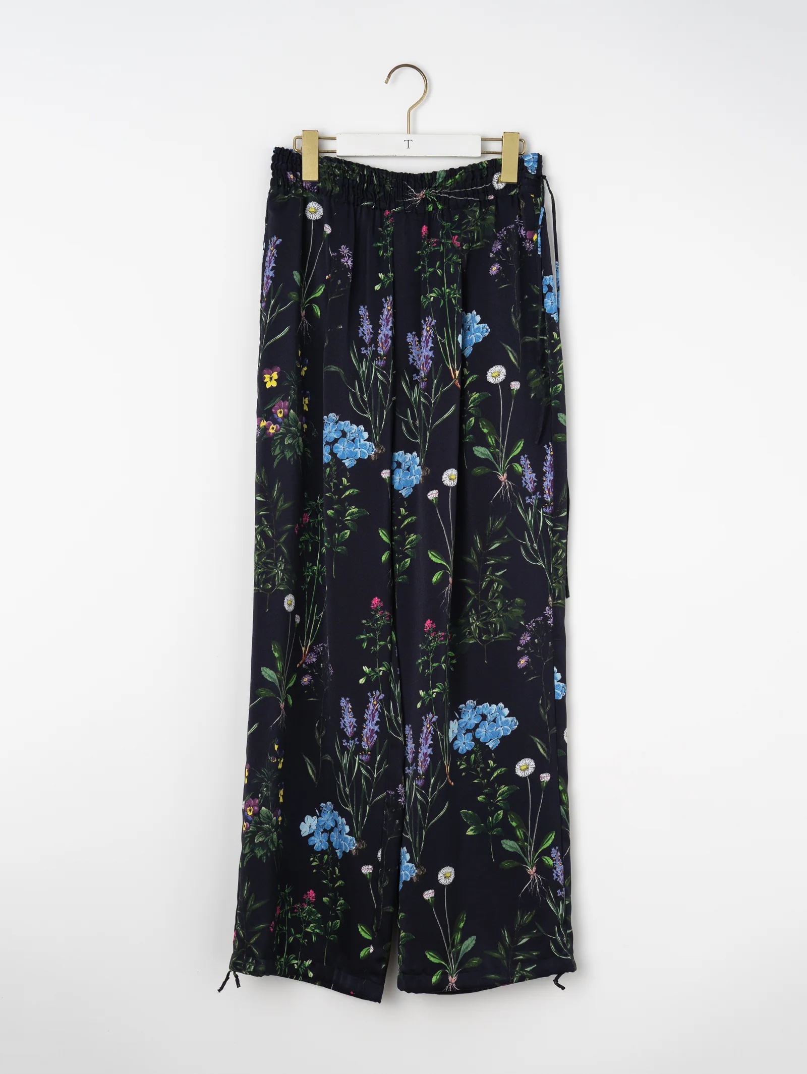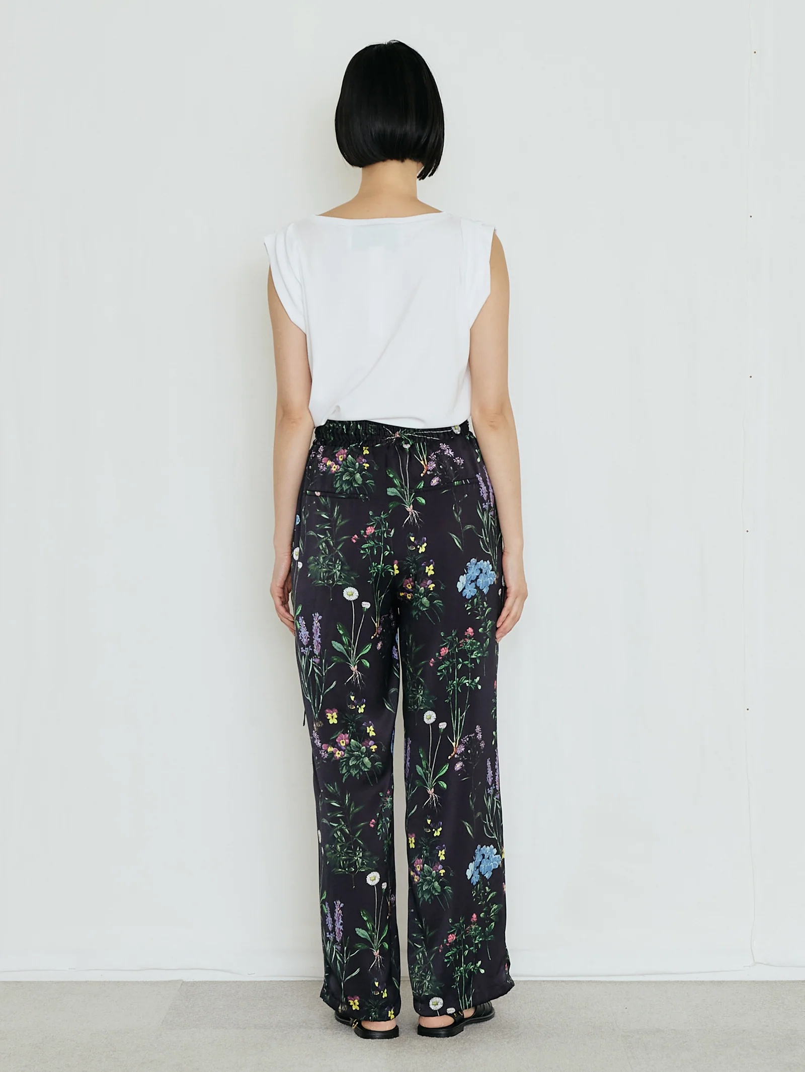 繊細かつ鮮やかでラフなフラワープリントパンツ。素材の美しさを生かしたミニマルなデザイン、とろみのあるドレープと桃のような柔らかい肌触りが魅力、リラクシーながらも、すっきりとした上品なシルエット。オリジナルのインクジェットプリントによる繊細なフラワーモチーフ、ヴィンテージ図鑑を思わせる花々が、大人の装いに華を添える、ウエストゴムで左部分にはドローコードを施しています。裾部分も絞れるようになっています。ポリエステル繊維を柔らかくシルクのようなしなやかなドレープ感のある風合いを持たせるために加工を施しています。非常に繊細な技術力が必要な加工です。桃のような肌触りとしなやかな柔らかさを持った素材です。プリントはダイレクトインクジェットという手法を使っています。TICCAらしい濃色のベースカラーに可憐な野草のモチーフを散りばめた、華やか且つどんな色とも相性のいい柄です。同素材のフラワープリントビスチェを合わせて、セットアップとして着こなすのがおすすめ。Tシャツやノースリーブシャツを合わせれば、抜け感のあるリラックススタイルに。シンプルなリネンシャツやジャケットを羽織っても、プリントがほどよいアクセントになります。足元はサンダルやフラットシューズで軽やかに、ヒールを合わせれば上品なサマールックに仕上がります。