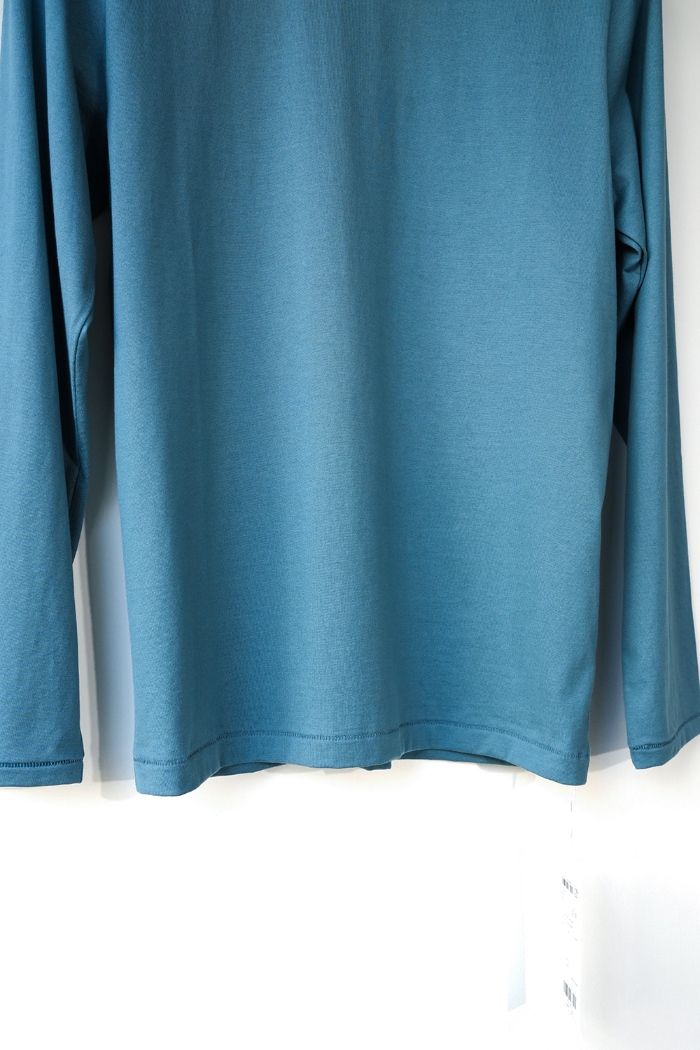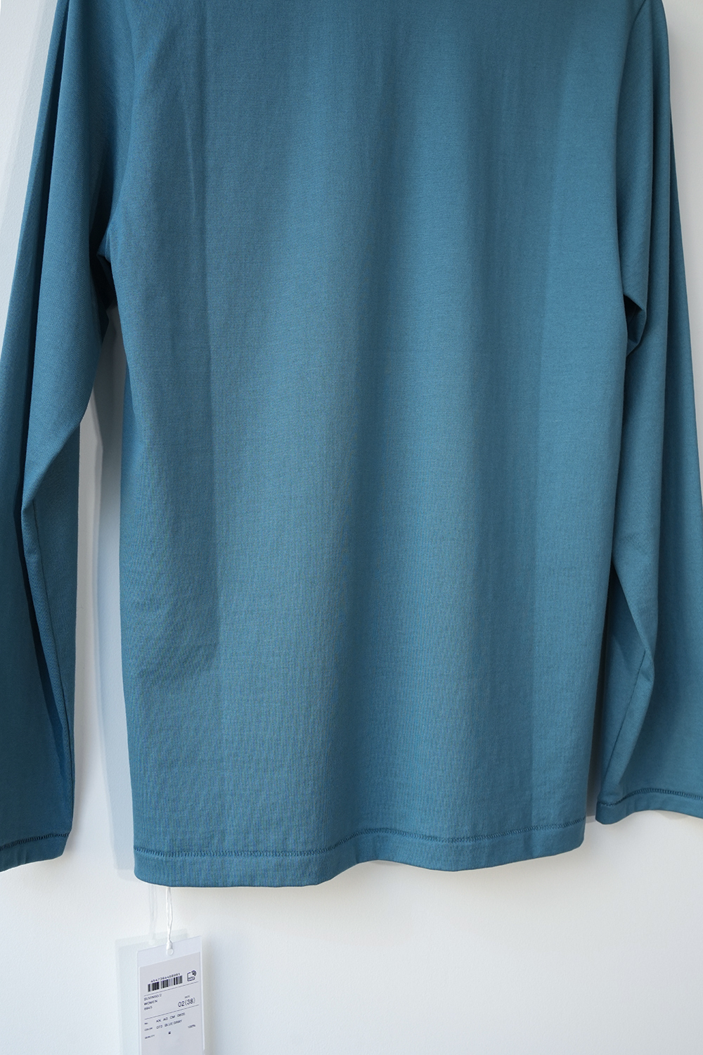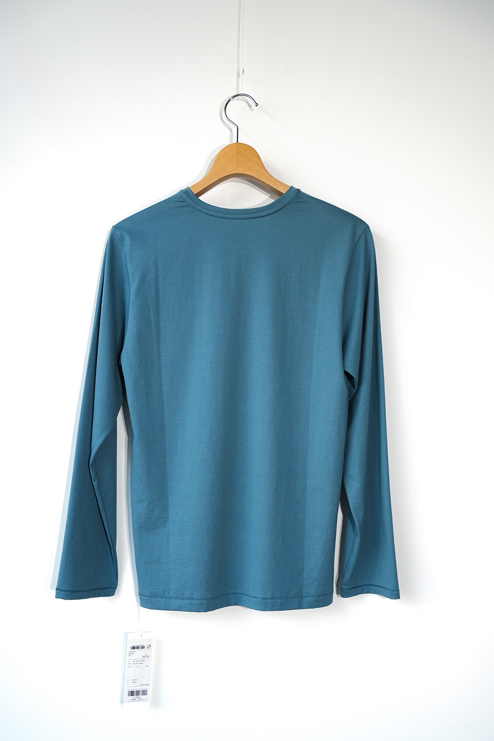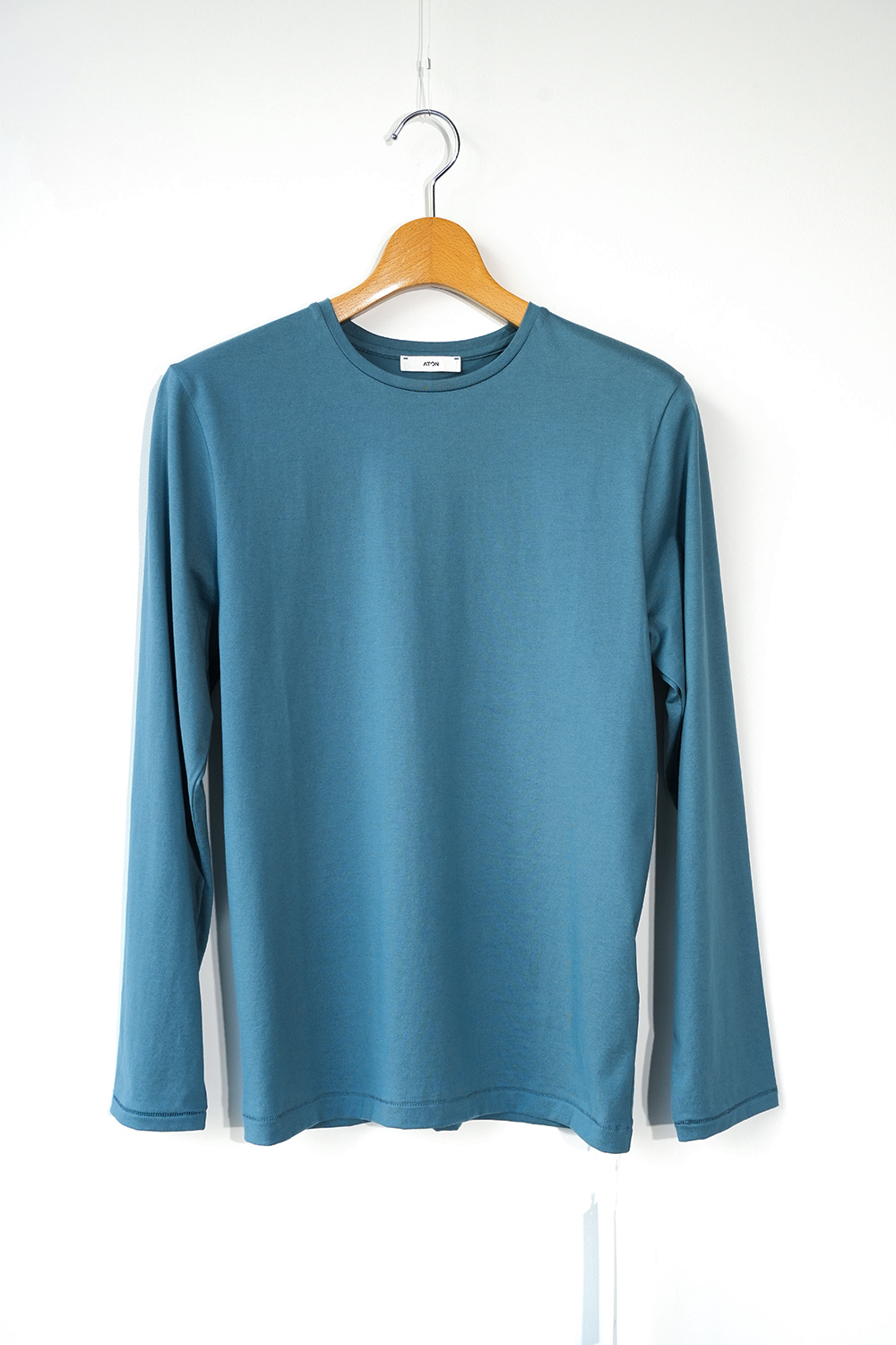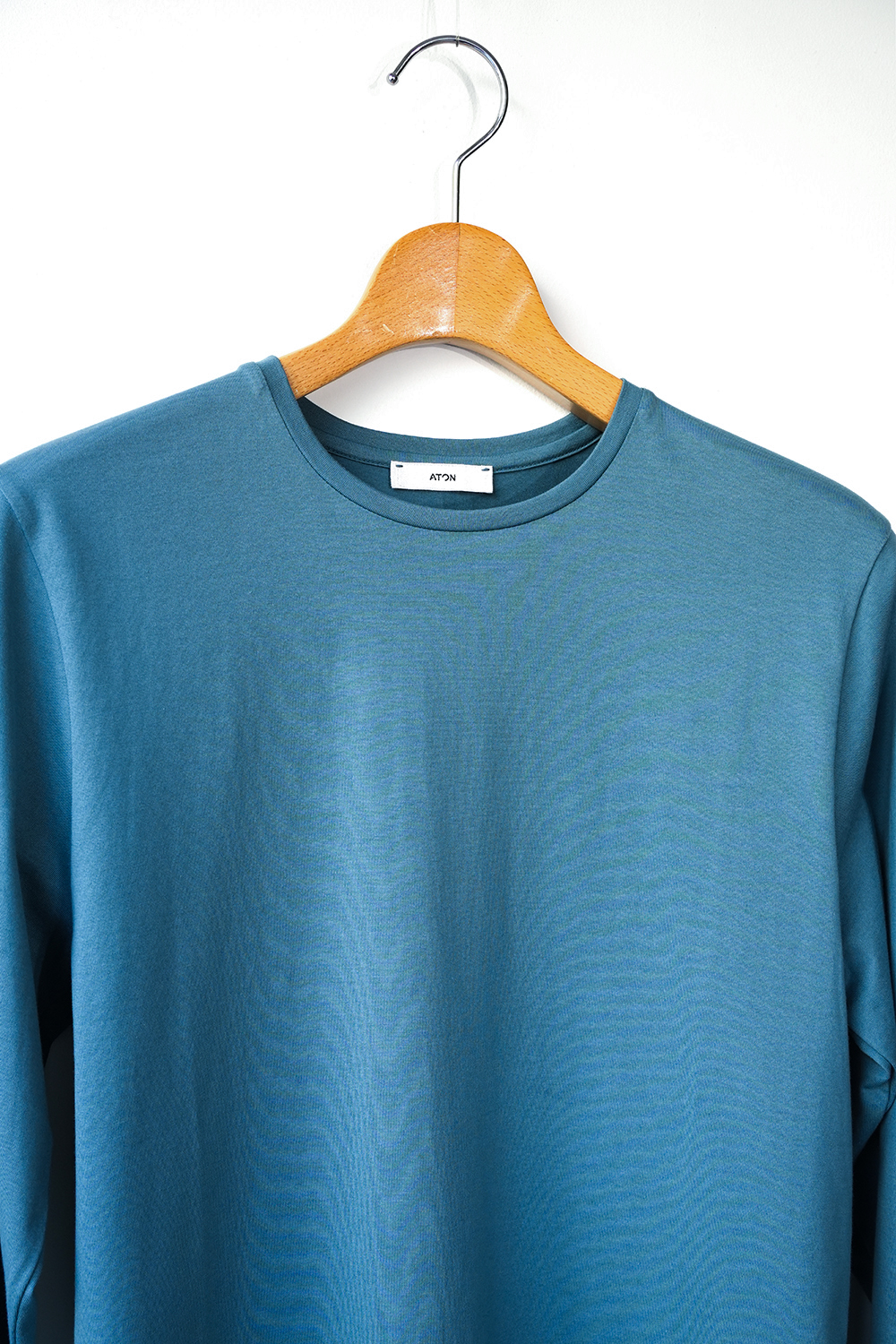 通常のTシャツと異なり、袖山を高くしたロングスリーブTシャツ。腕の納まりが良く、肩から肘にかけてのラインがすっきりと見える為、上品な印象に仕上がっています。インドで手摘みされたSUVIN COTTONを、和歌山市のニッターの手で編まれており、双糸にすることで、光沢感としなやかさを備えたATONオリジナルのジャージー素材です。SUVIN COTTONは綿花を丁寧に手摘みしている為、油分が失われること無く、繊維に傷が付いていない為、薬剤など化学的な加工を一切せずに美しい光沢があります。