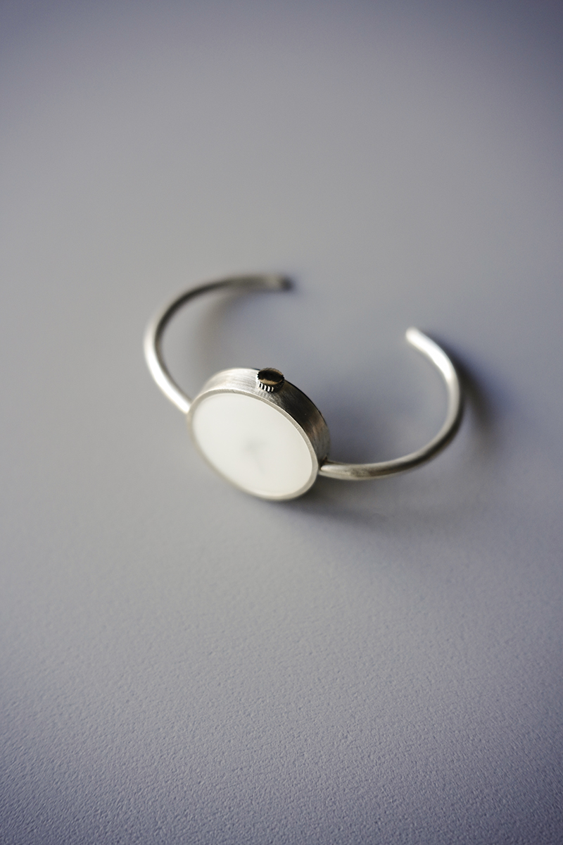 真鍮に14kゴールドコーティングを施したベルトバングルとケース仕様、文字盤と針は真鍮。時計とブレスレットの両方の要素を持ったミニマルデザインのアイテムです。