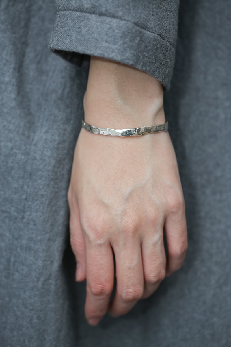 湖のほとりに生える草木やゴツゴツとした風景や様子をイメージした、さりげなくも波を模した表情がアクセントとなるシルバー925のバングル。不規則に起伏したラフなフォルム。素材はシルバー925、女性サイズ。