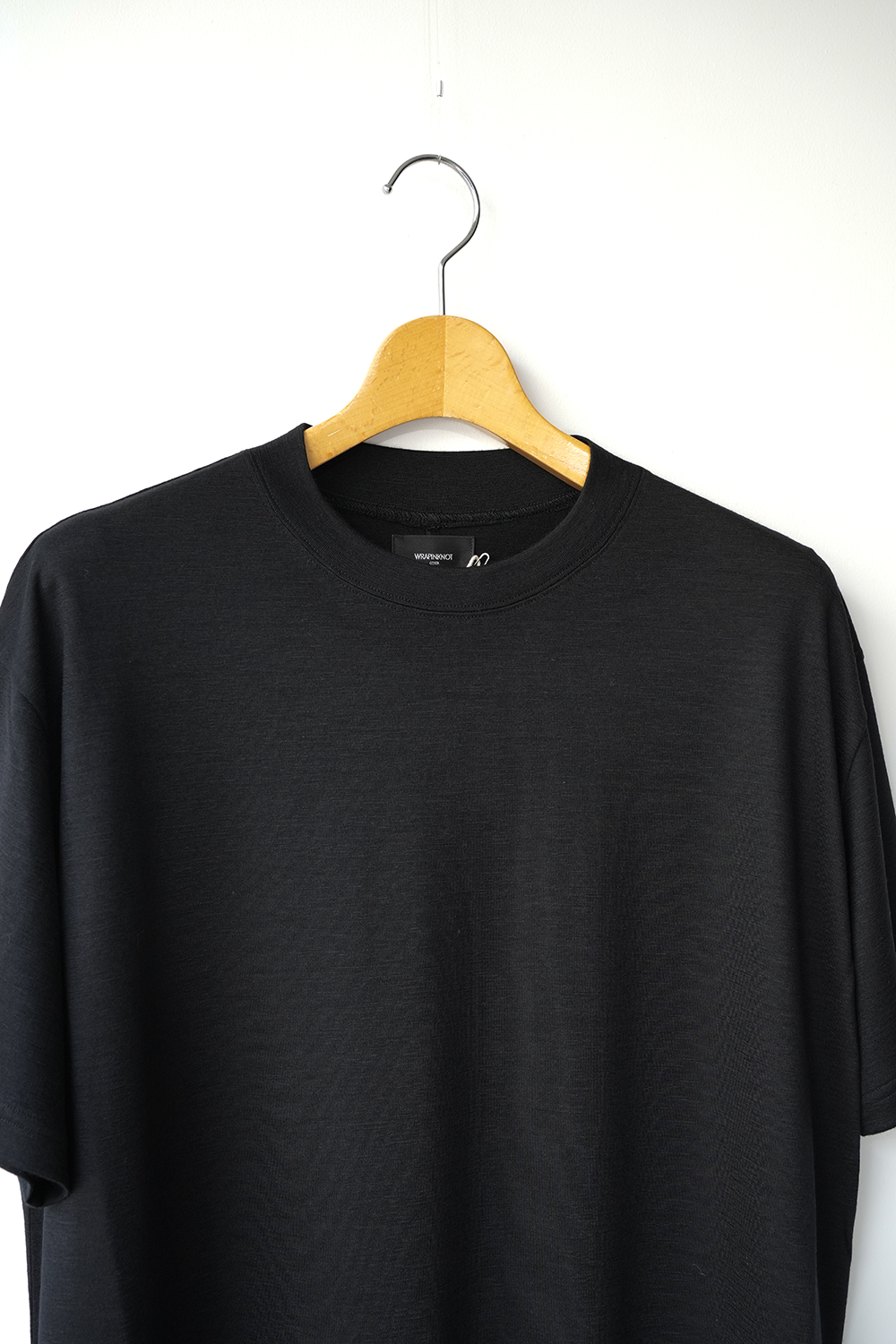 メリノウール100%生地を使用したロングスリーブTシャツ。絶妙なリラックスフィットのシルエットで1枚着としてもインナーとしても最適。裾の太めのステッチが良いアクセント。天然の機能素材であるウールの吸放湿性や消臭性に再着目し、年間を通じて様々なシーンで使えるアイテムに落としこんだウールウェアコレクション。微光沢のある上品なウールジャージー素材を、その類稀なニット素材の縫製力を活かして端正な顔つきに仕立てている。各アイテムには洗濯耐久性があり、その美しさを長く損わず、中でもクルーネックのラインの美しさには定評がある。夏の一枚使いはもちろんのこと、他シーズンにはインナーとしても重宝される。新たに黒一色に絞ったこのコレクションは、日常と日々に添える少しのラグジュアリーである。