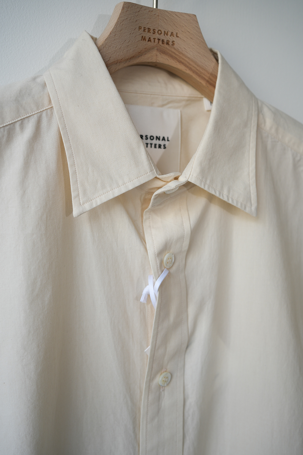 長年「niuhans 」ブランドを手掛けてこられたデザイナー濱田大輔さんが、一つのアイテムに拘って物作りを行いたい気持ちから2023SSからスタートしたブランド「PERSONAL MATTERS|パーソナルマター 」。コンパクトなコレクションのプロジェクトでありながら、お店との対話から生まれる特別なプロダクト、お客様にとって大切なピースになるような私的なプロダクトを目指す。個人的な関心の事柄を指す”PERSONAL MATTERS”に複数を表す“S”が語尾に付くことで、デザイナーである濱田さん個人の事象だけでなくお店やお客様にとって特別なモノになることを願い名付けられました。従来のブランド的手法である毎シーズン、トータルルックで提案するコレクションの考え方ではなく、ひとつのアイテムにフォーカスを当て、そのモノに対して時間を掛けてリサーチを行い、試作を重ね、ひとつのプロダクトのみを提案していくプロジェクト。またシーズンを示す表記はなくプロジェクト(プロダクト)としてのナンバー(Nº01, Nº02, Nº03…)を用る。そんなプロジェクト第一弾に選らばれたこちらのシャツ、クラシックでありながら実用性の高いシャツを改めて見つめ直し、新旧・国籍(ブランド)問わず様々なシャツをリサーチ。これから5年、10年着たいシルエット、素材、仕様を探り、試作を重ねる中で生まれたのが今回発表されたオーガニックコットンブロードシャツ。お買い物くださいました際には写真にあるオリジナル木製ハンガーも添えて。素材は無染色の超長綿、オーガニックペルーピマ。滑らかで艶やかなピマコットン生地を製品洗いをし落ち着いた印象でフィニッシュ。レギュラーカラー、オリジナルボタン。