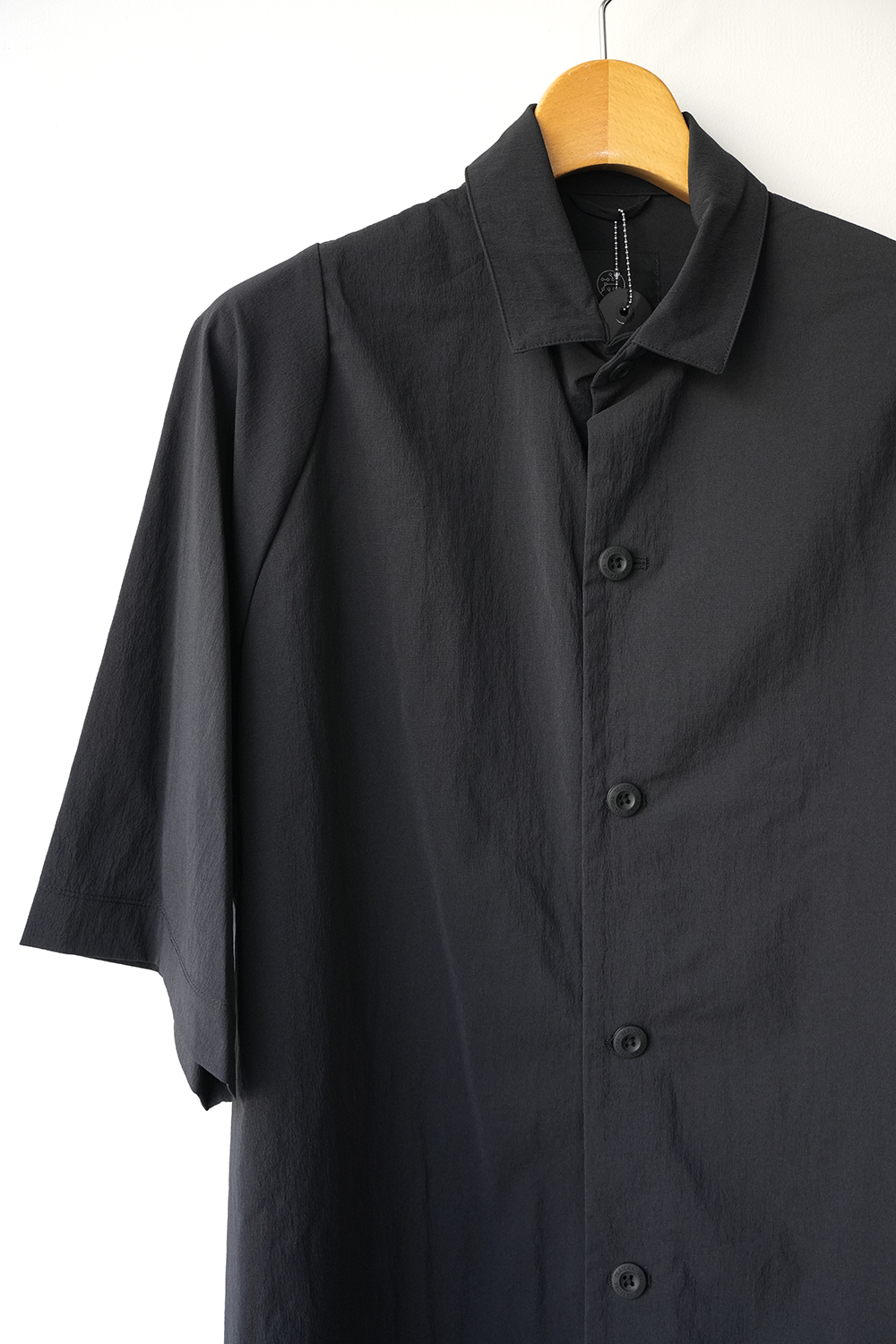 夏に涼しく快適に着られる事をコンセプトにしたアイテム。外遊びからビジネスシーンまで、真夏の様々なシーンに対応。様々な色を織り交ぜて表現した深みのあるブラック。特殊放熱仕様により体験出来る接触冷感。風通しを良くし、不快なムレ等を軽減。弱ストレッチで快適な可動域。重量も軽く、カリッとした軽やかでドライなタッチ。洗濯後も速乾。ゆったりとした身幅・着丈のシャツ。身幅にゆとりを持たせて全体に膨らみのある印象になるシルエット。少し長めの袖丈。ショルダー部分の特殊な切り替えにより肩周りの可動域を広げ快適性を高めると共に、テアトラ独自のシルエットを表現。小振りな襟。ポケットは無し。