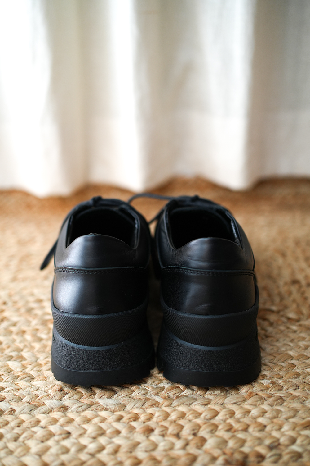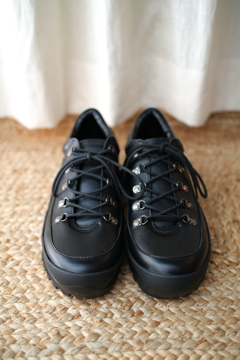 新型、オールブラックレザーとヴィブラムソールのトレッキングシューズ。革靴でありスニーカーであり、ローカットの丈感とヴィブラムソールの組み合わせがデザインが素晴らしい。オールブラックレザーの引き締まり感がスタイリッシュな一足です。セメンテッド製法。