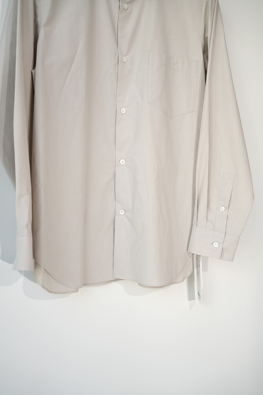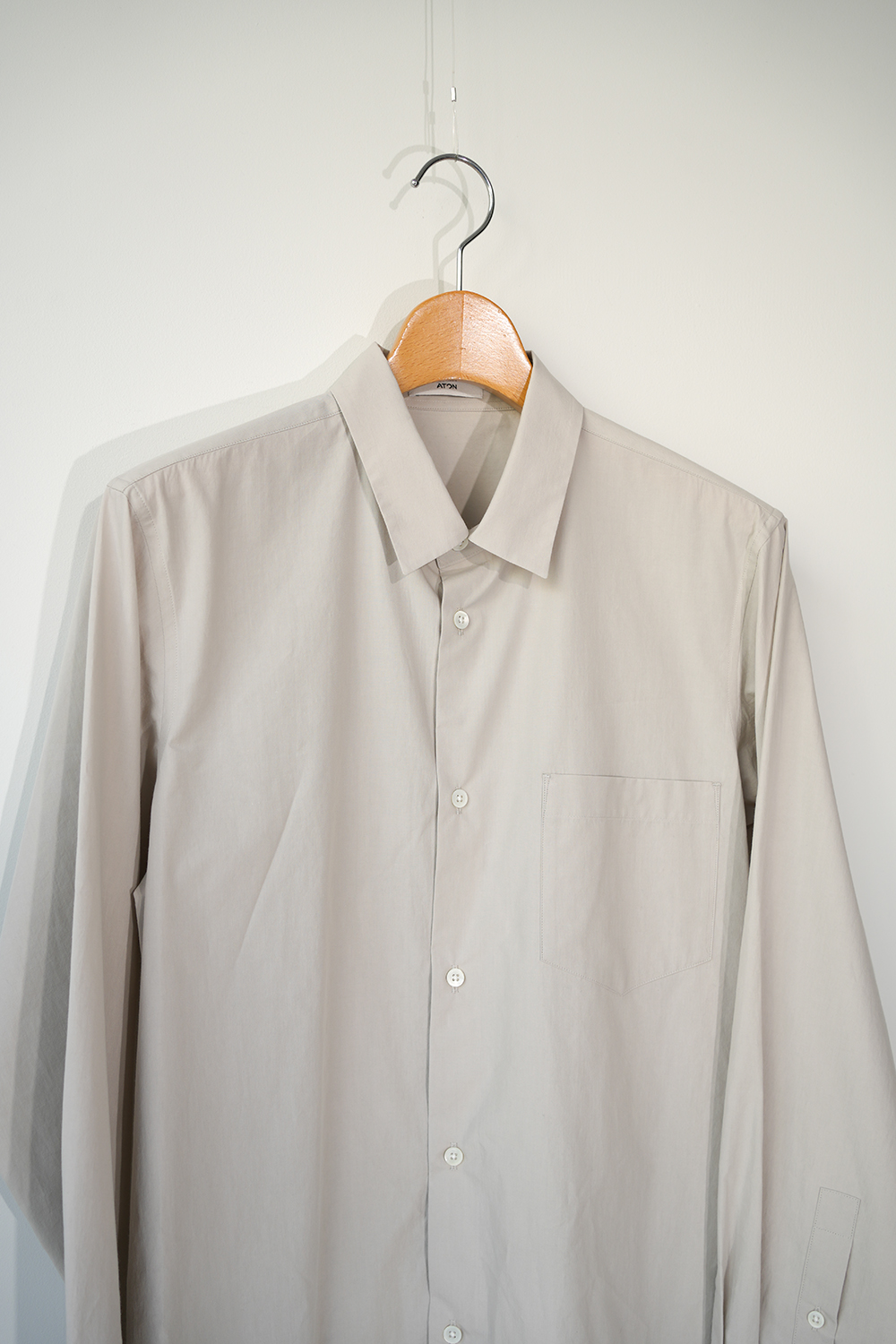 ベーシックなドレスシャツをオーバーサイズにしたスタンダードシャツ。すっきりとシャープな印象に仕上げています。洗いざらしでラフに着用ていただいても、また違った上品な雰囲気を味わえるATON定番のシャツです。インドの手摘みされたSUVIN COTTONを、兵庫県西脇市の機屋で限界まで高密度に織り上げた素材です。他のブロードには無いツヤ感とハリ感が特長的のATONオリジナル素材です。