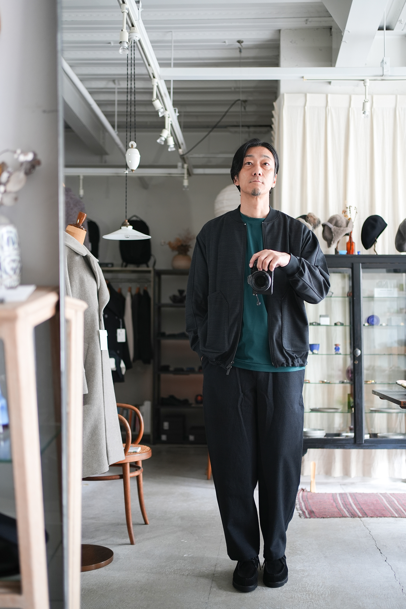 ソフトな風合いと、表面の毛羽感や細かな凹凸が特徴ウールサージ。生地の仕上げにかけたワッシャータンブラー加工で程よいカジュアル感を表現しました。シャンブレーブラックは経糸が黒、緯糸がトップダークチャコールを使用し、白い横筋が見える特徴的な色味。コクーンシルエットのワイドパンツ、ウェストゴムと紐仕様。