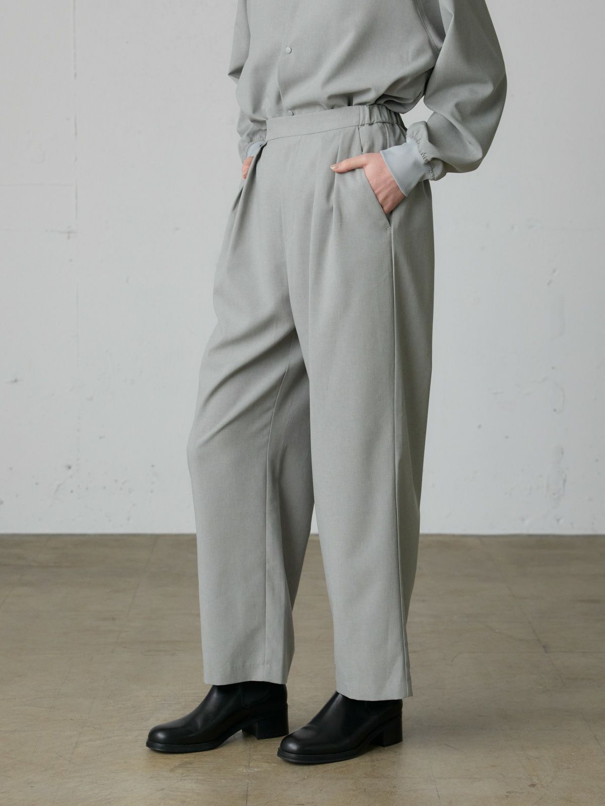 リサイクルポリエステルを100%使用したワイドスラックスパンツ。梳毛ライクで落ち感のある生地が特徴。洗ってもシワになりにくいのがポイント。ウエストはバックゴム仕様になっており、腰部分からタックを施したデザインです。ワイドでゆとりのあるシルエットを表現。着回しもしやすくどなたにも穿きやすいスラックスを提案した1枚。