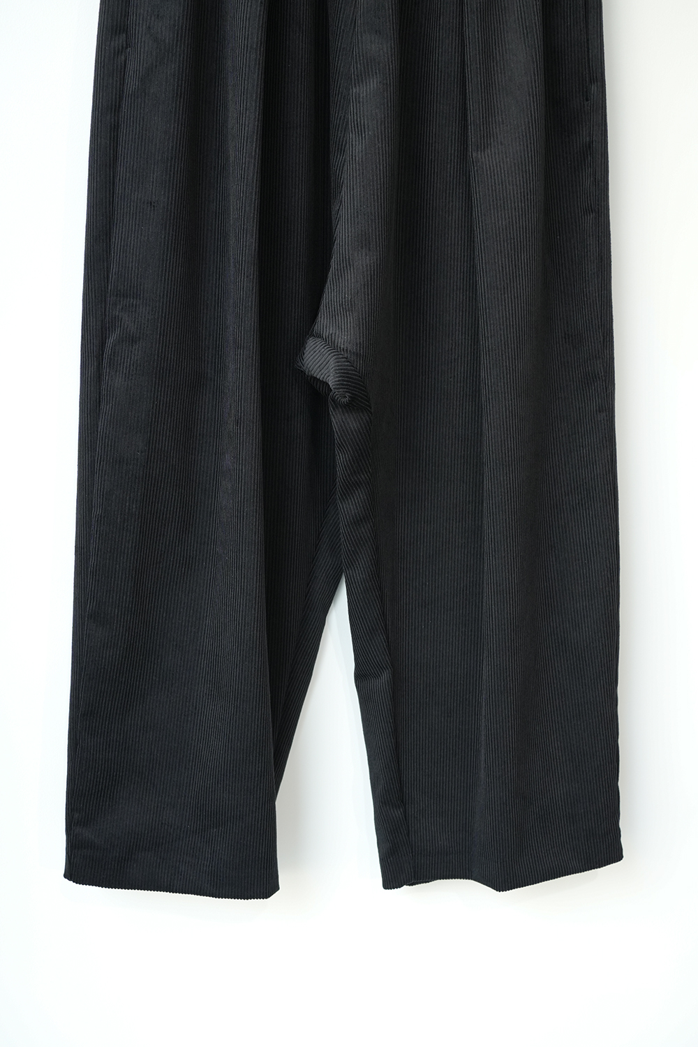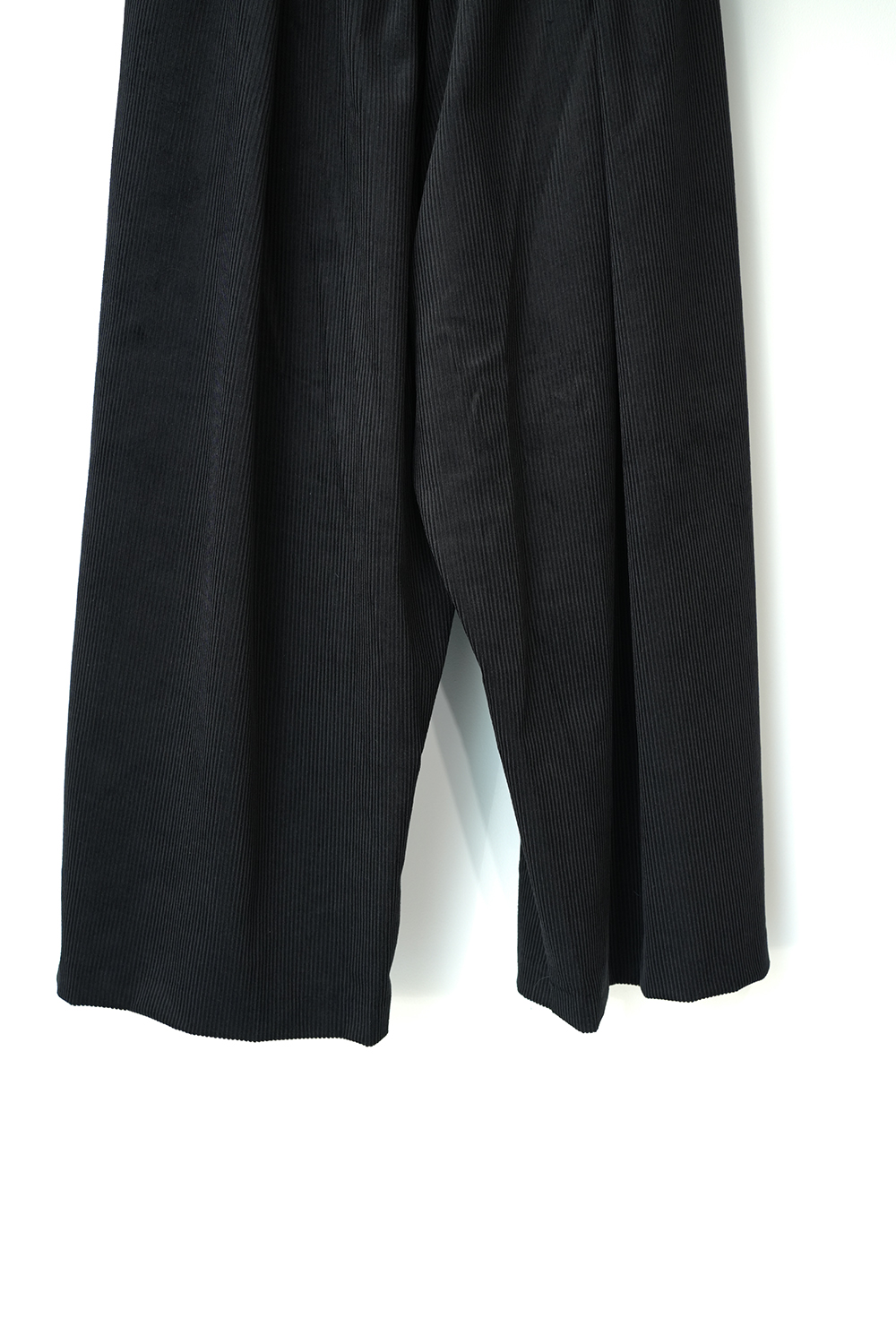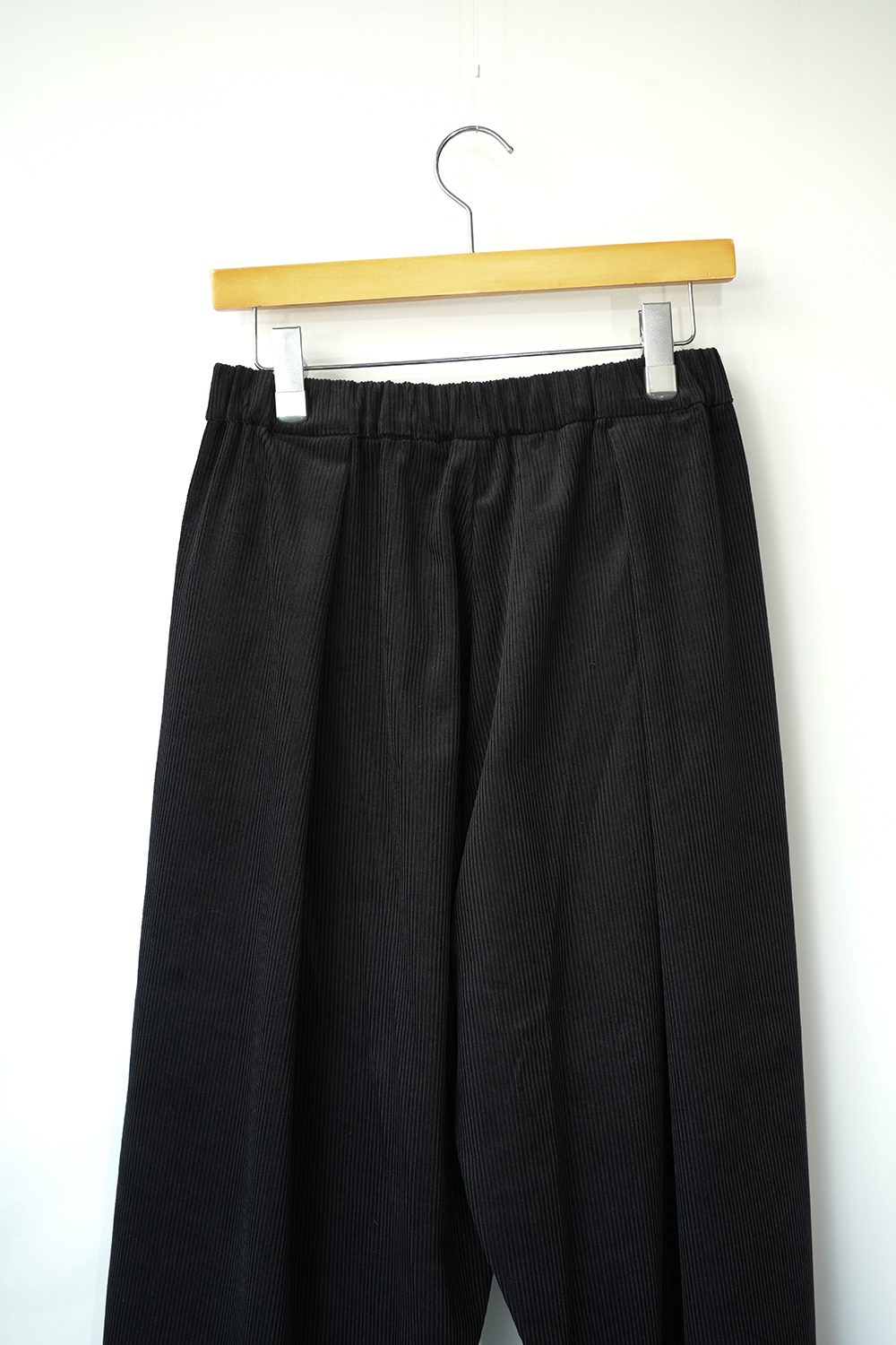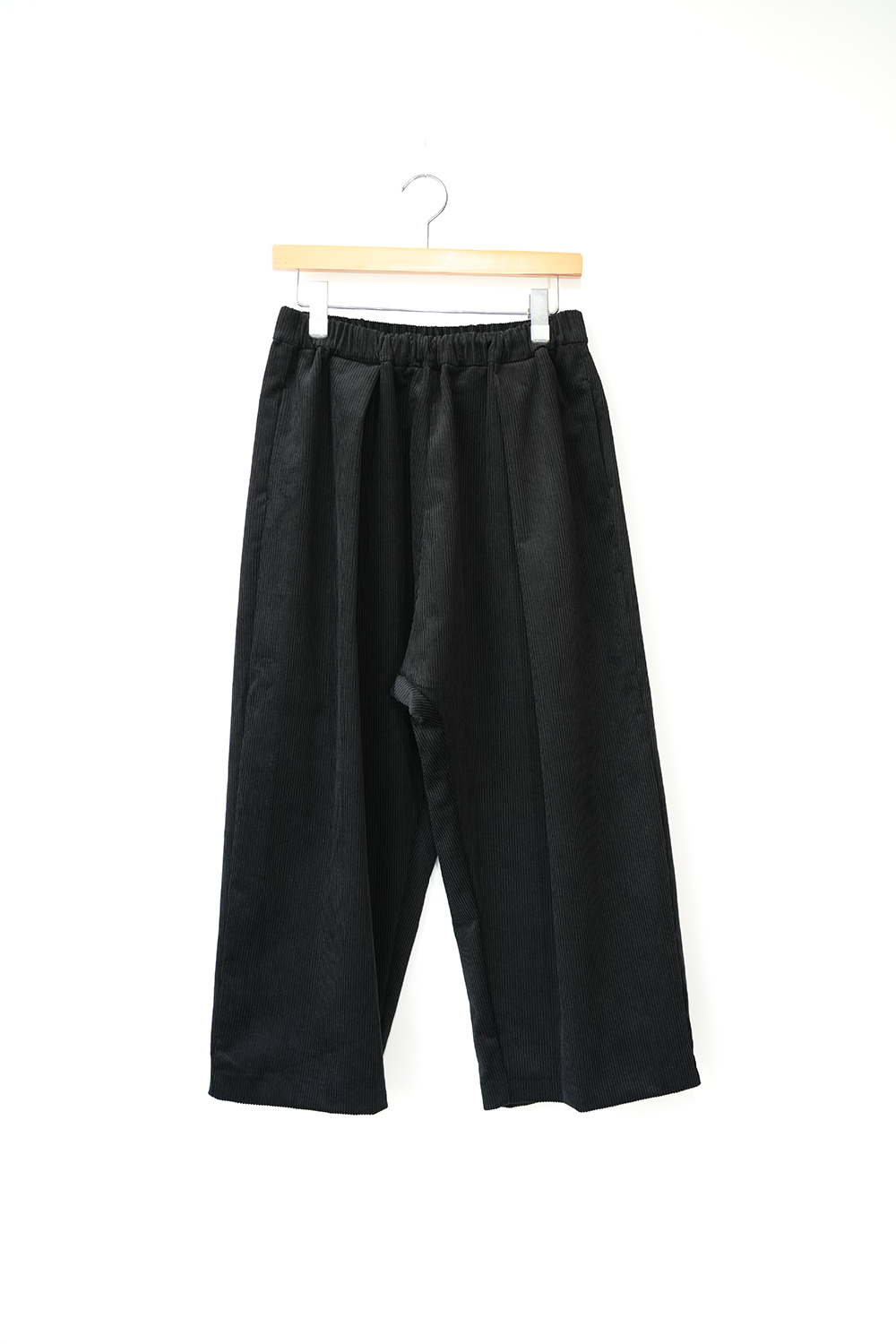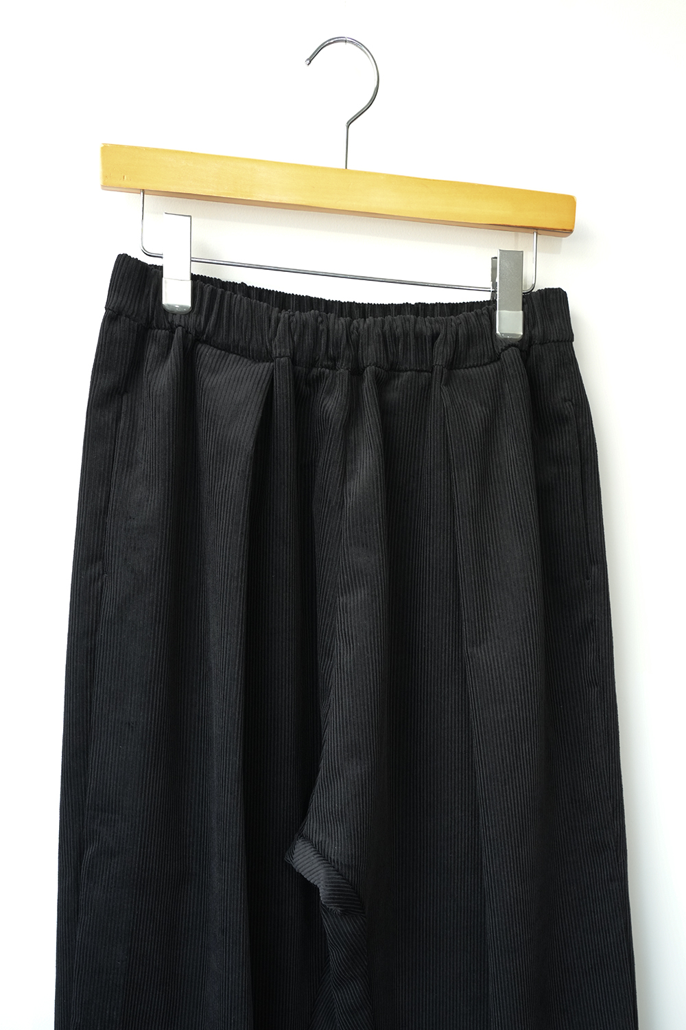 コーデュロイ生地で仕上げたシンプルなワイドパンツ。締め付けのないウエストゴムとソフトな肌触りの生地で穿き心地良し。レッグを拾わないシルエットとクロップド丈のバランスはトップスを選ばないコーディネートできます。
