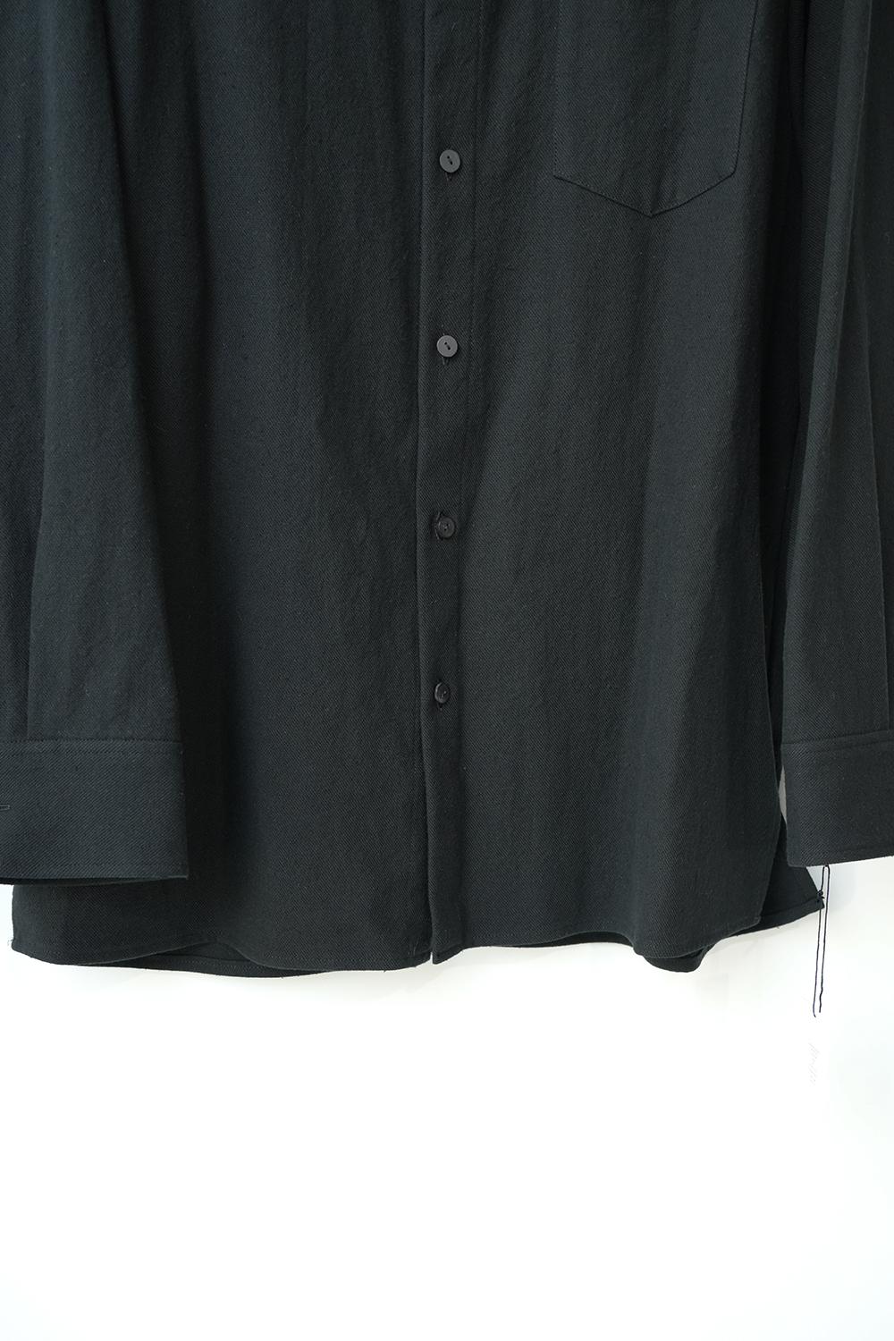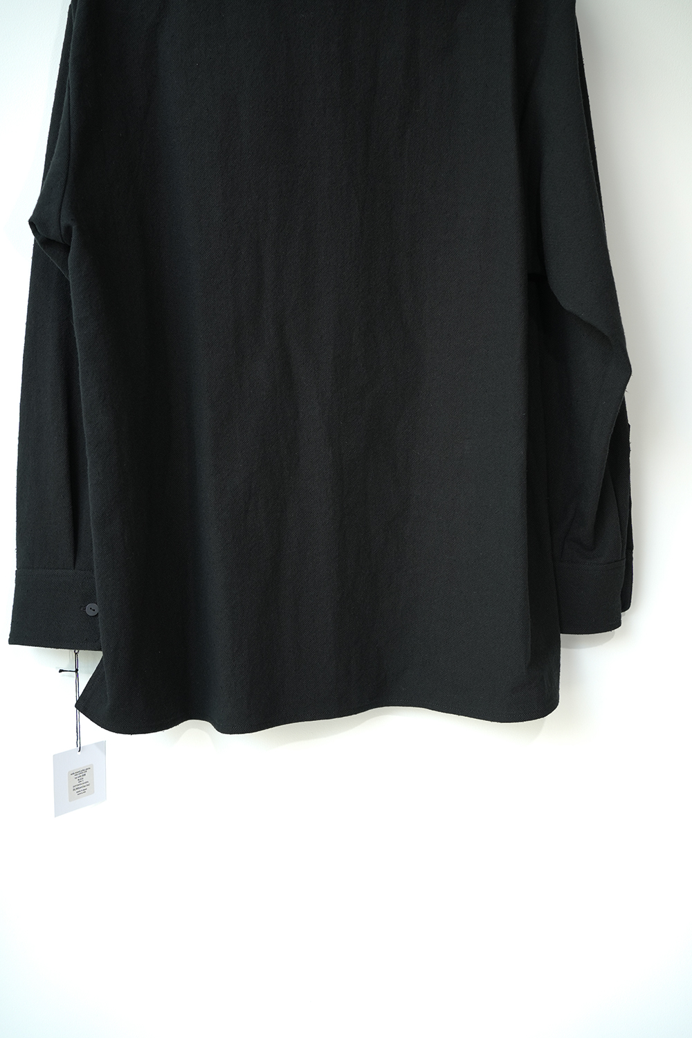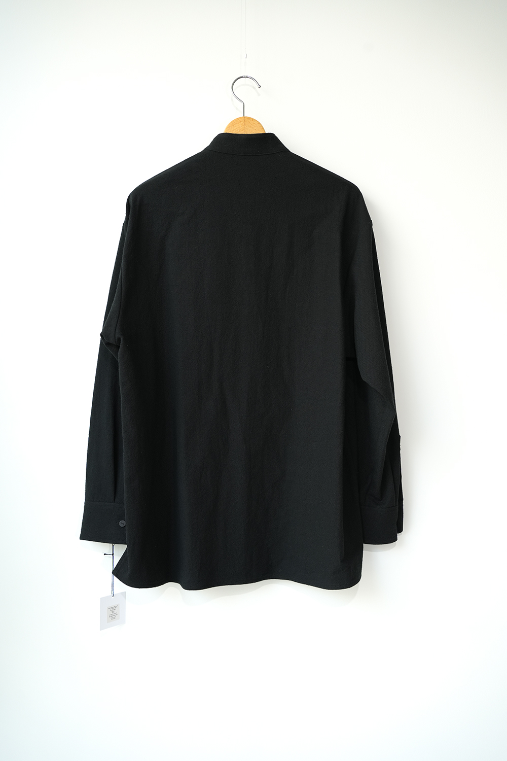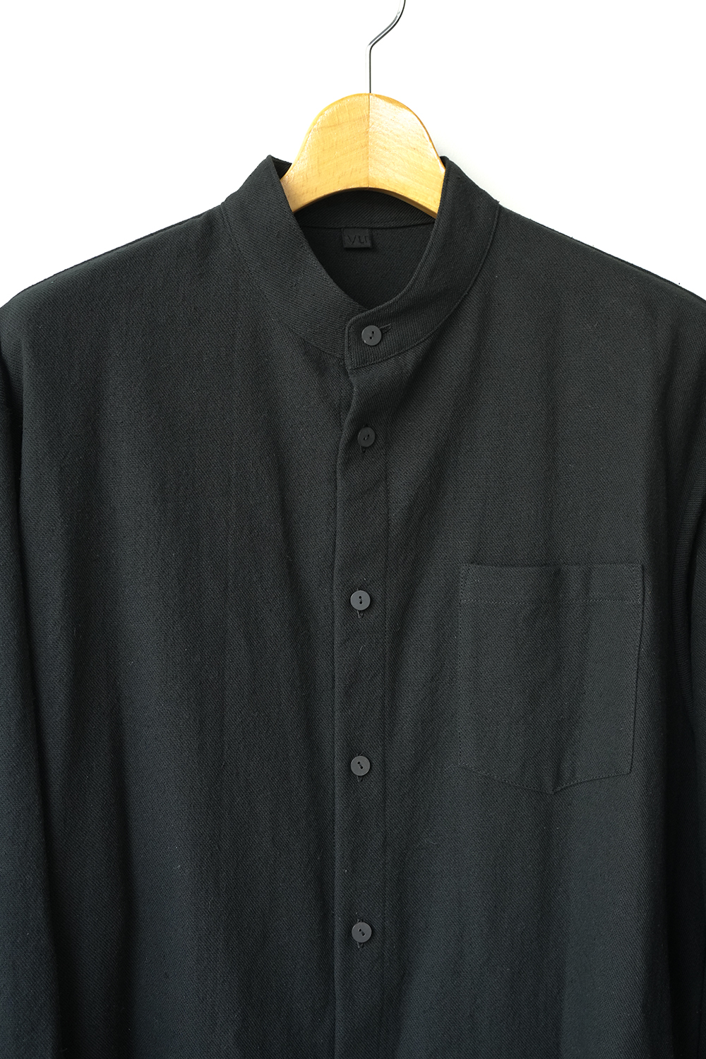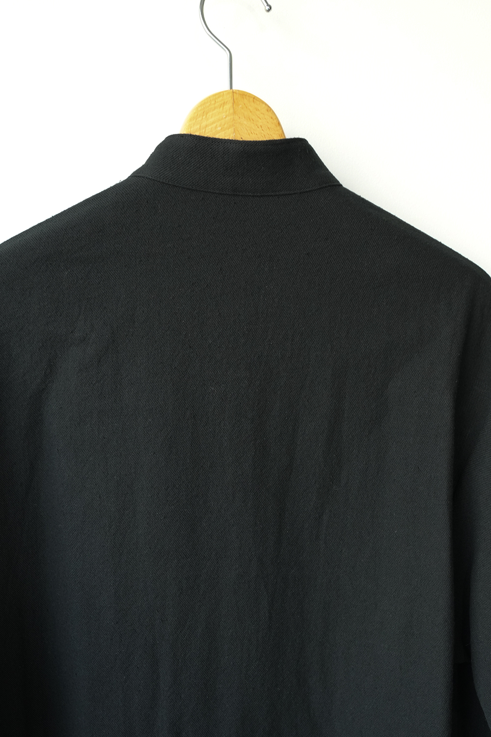 表面にネップのあるシルクコットン生地を使用したスタンドカラーシャツ、ワイドシルエット、高めのスタンドカラーが特徴。長すぎない着丈は軽い羽織としても活躍。オリジナル作った天然本水牛の角ボタン、左胸ポケット付き、両裾の脇線に程よいスリットを入れているためポケットに手を入れたときのシルエットがきれいにまとまります。